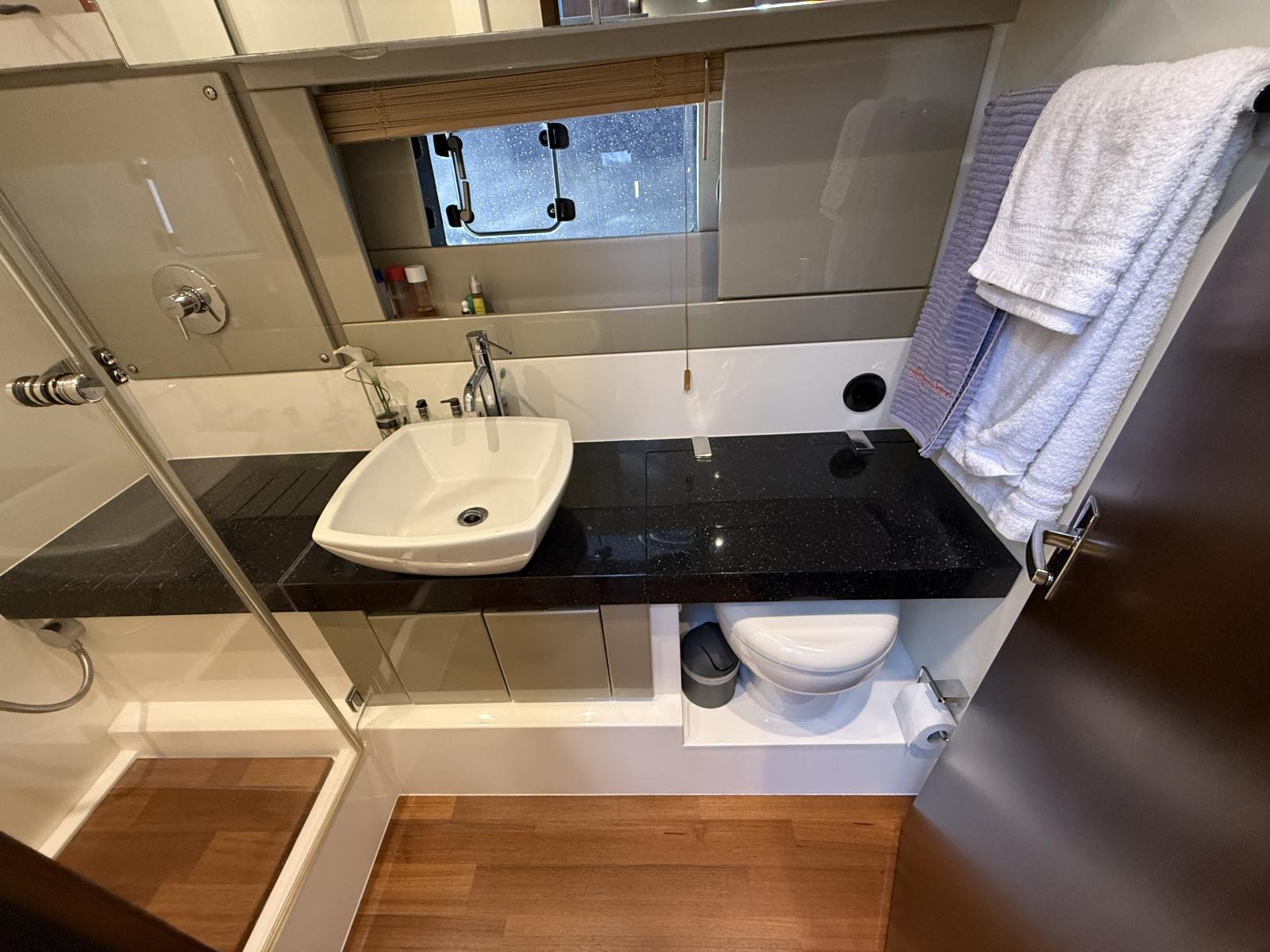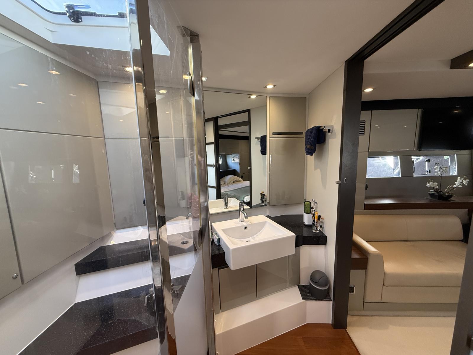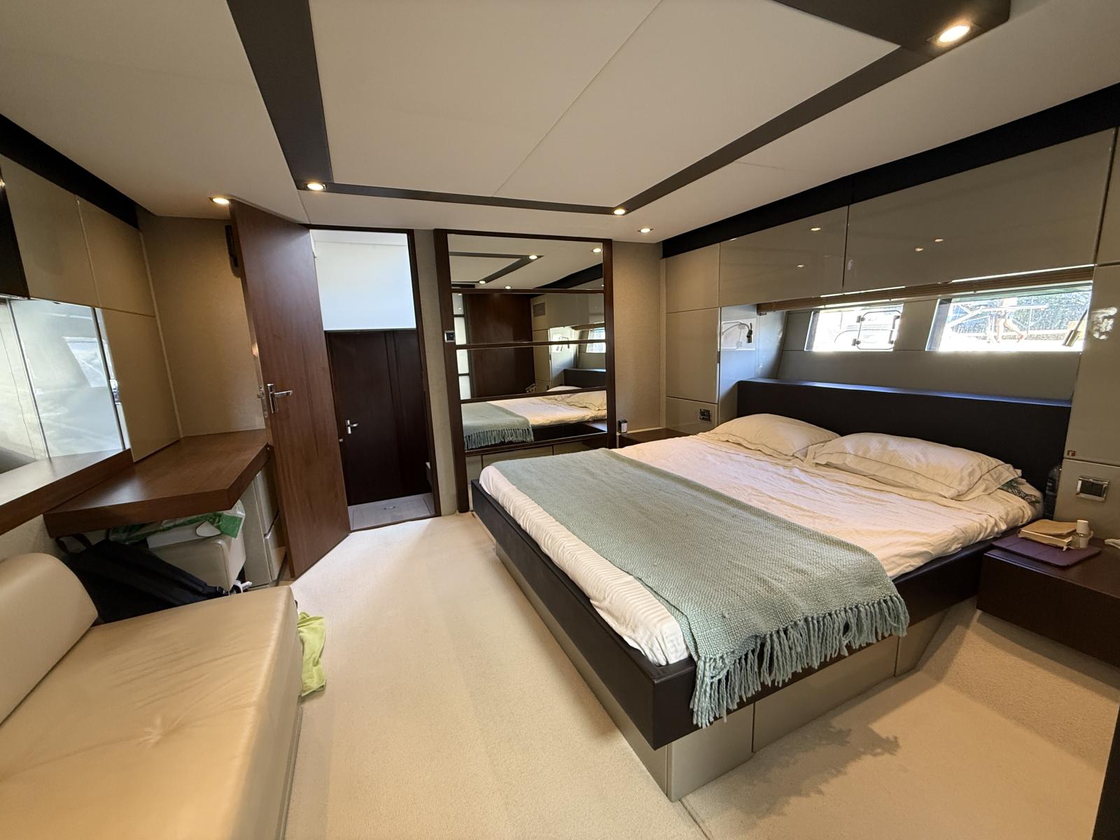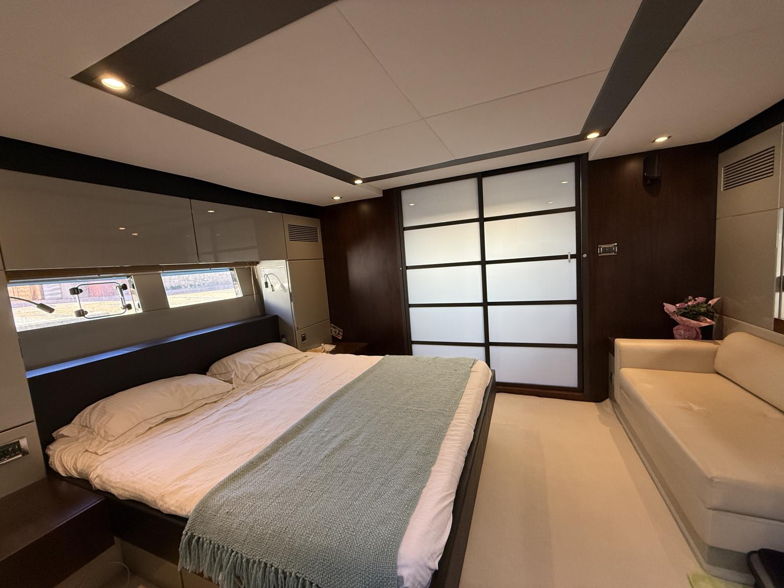 La partie nuit surprend par sa générosité : la master cabine pleine largeur, véritable suite parentale, offre des volumes, une luminosité et un confort dignes d’un yacht bien plus grand. Deux cabines supplémentaires, chacune aménageable en lit double ou lits simples, accueillent les invités dans un esprit de convivialité et d’élégance.