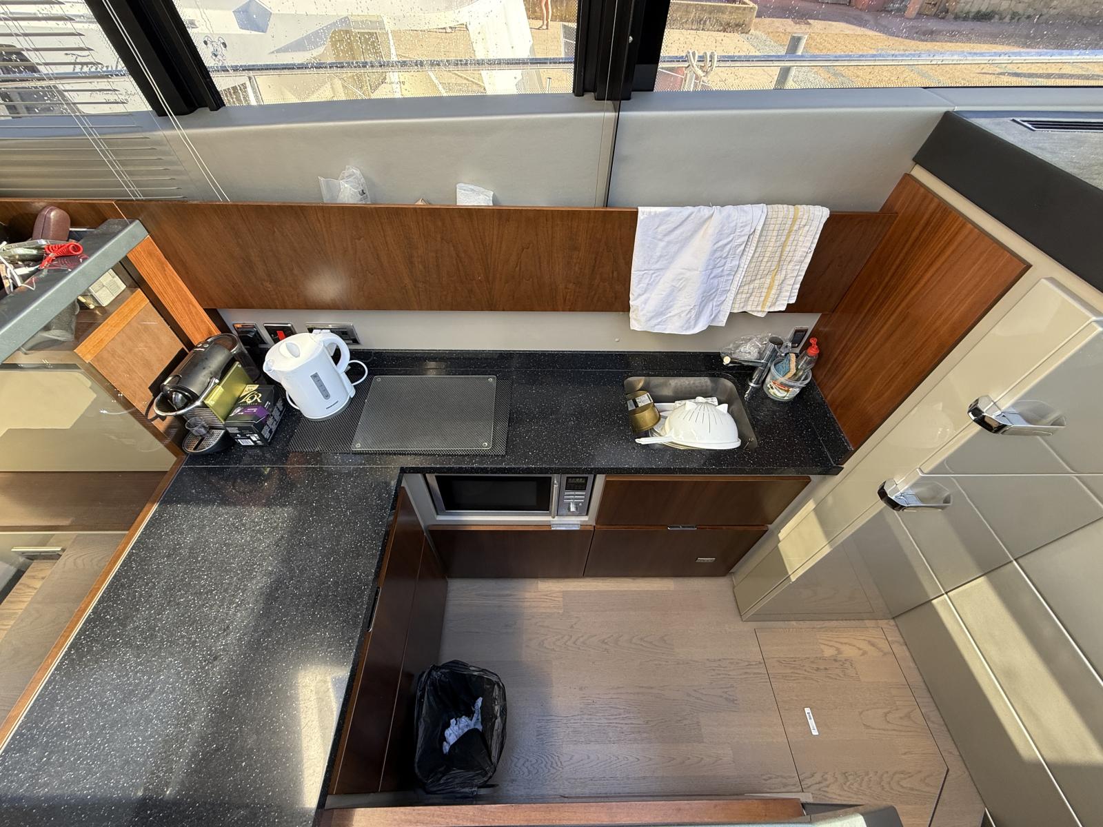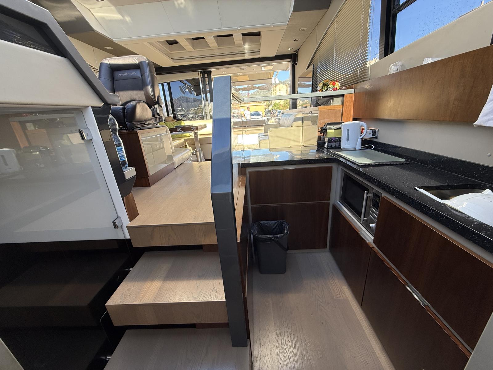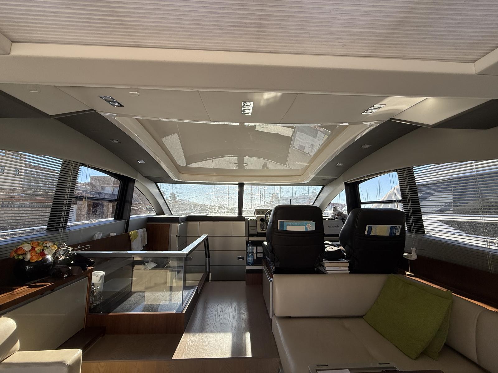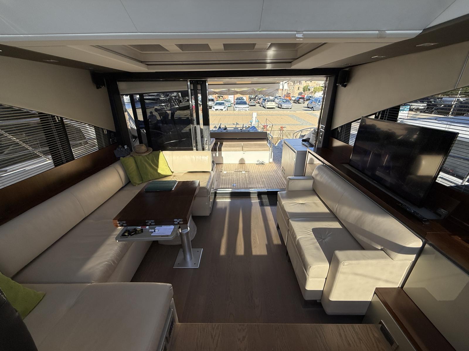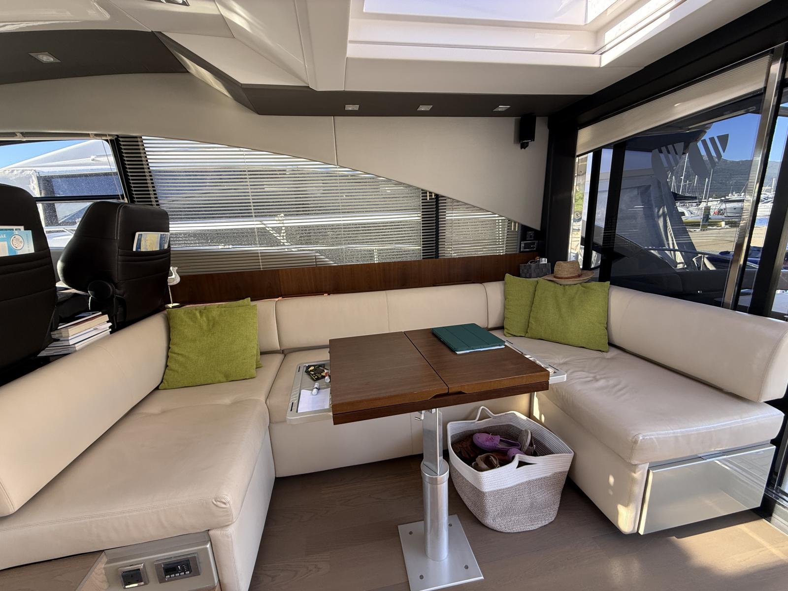 À l’intérieur, le salon panoramique inonde de lumière naturelle grâce aux baies vitrées et au toit ouvrant. Cet espace généreux devient le cœur de la vie à bord, aussi agréable pour les moments de détente que pour prolonger les soirées après le coucher du soleil.