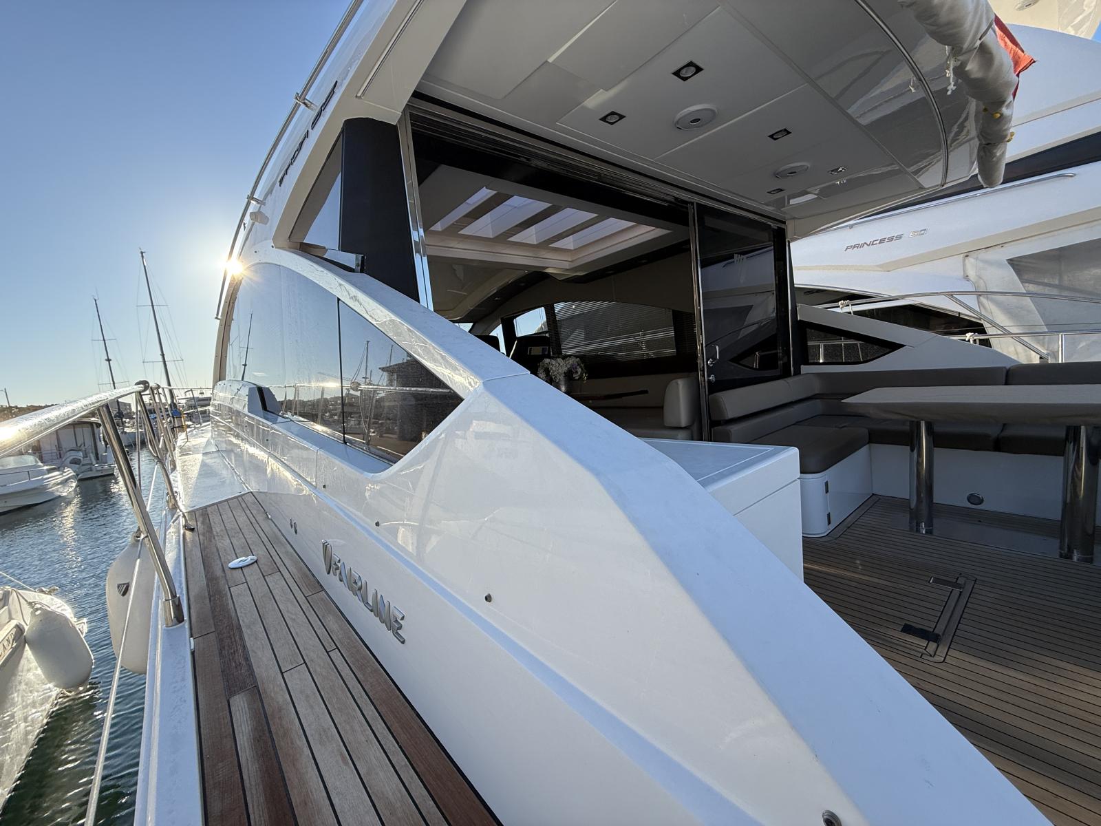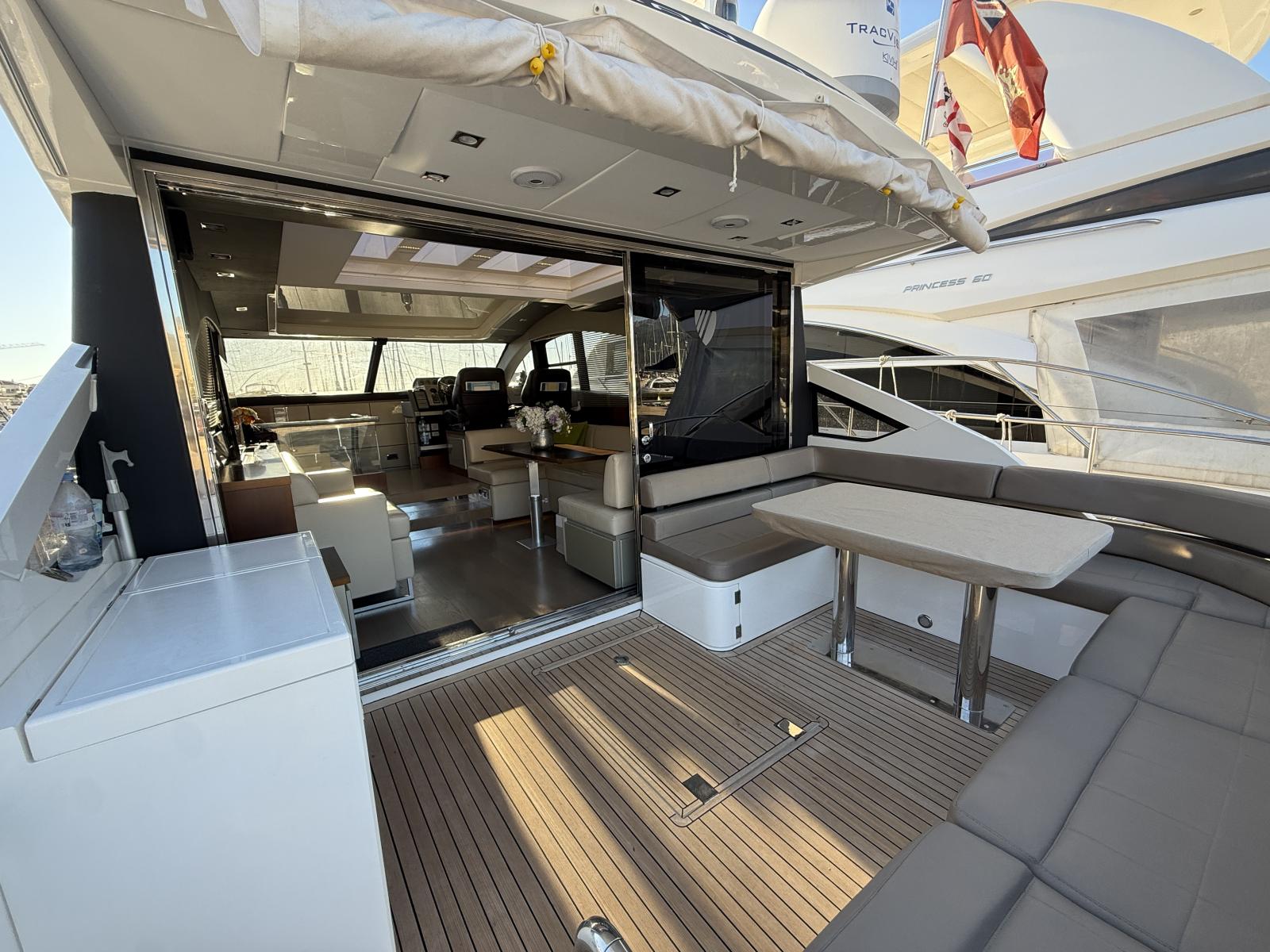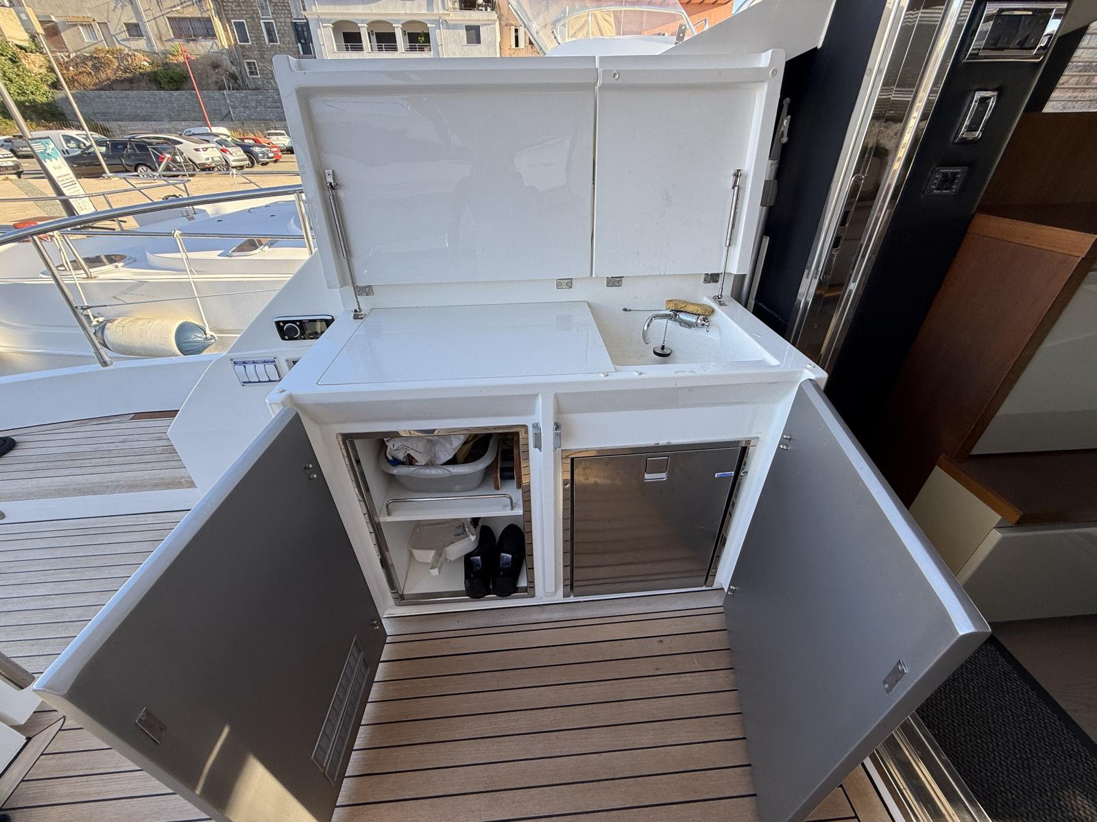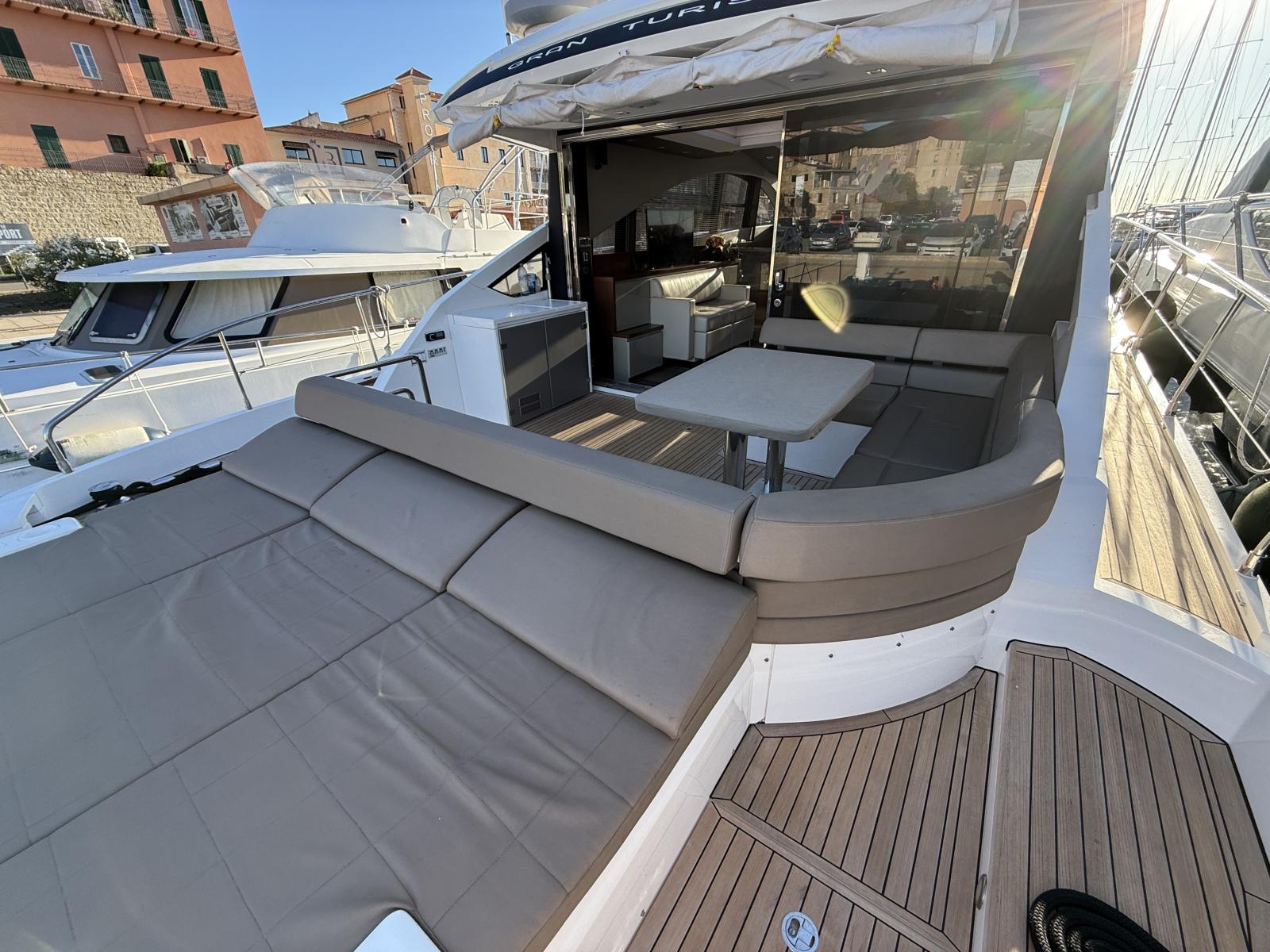 À l’extérieur, le carré de cockpit, protégé d'un store électrique, se prolonge vers un large bain de soleil arrière, idéal pour des journées au mouillage, le tout complété par un bar extérieur convivial. L’espace est fluide, parfaitement pensé pour recevoir famille et amis dans une atmosphère chic et décontractée.