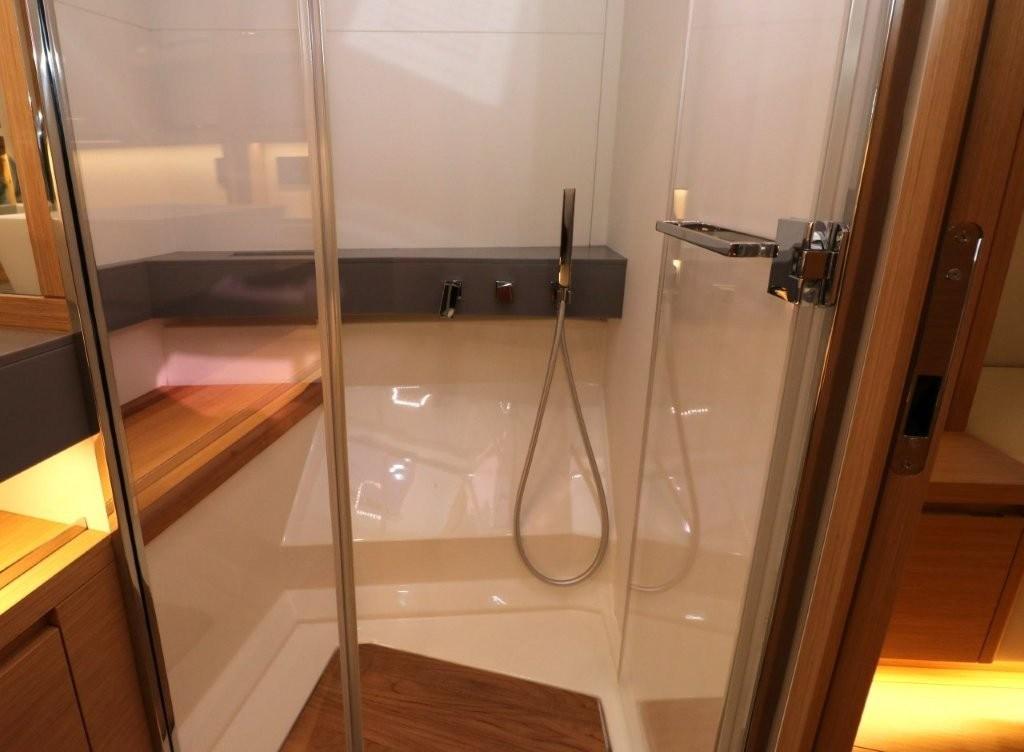 Pack de finitions d’intérieur (banquettes et bancs de douche en teck massif, plans de lavabo en marbre technique gris, sols de salle de bains en teck, rembourrage des cloisons)