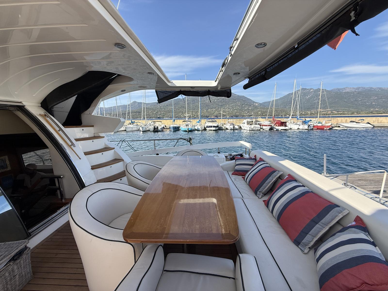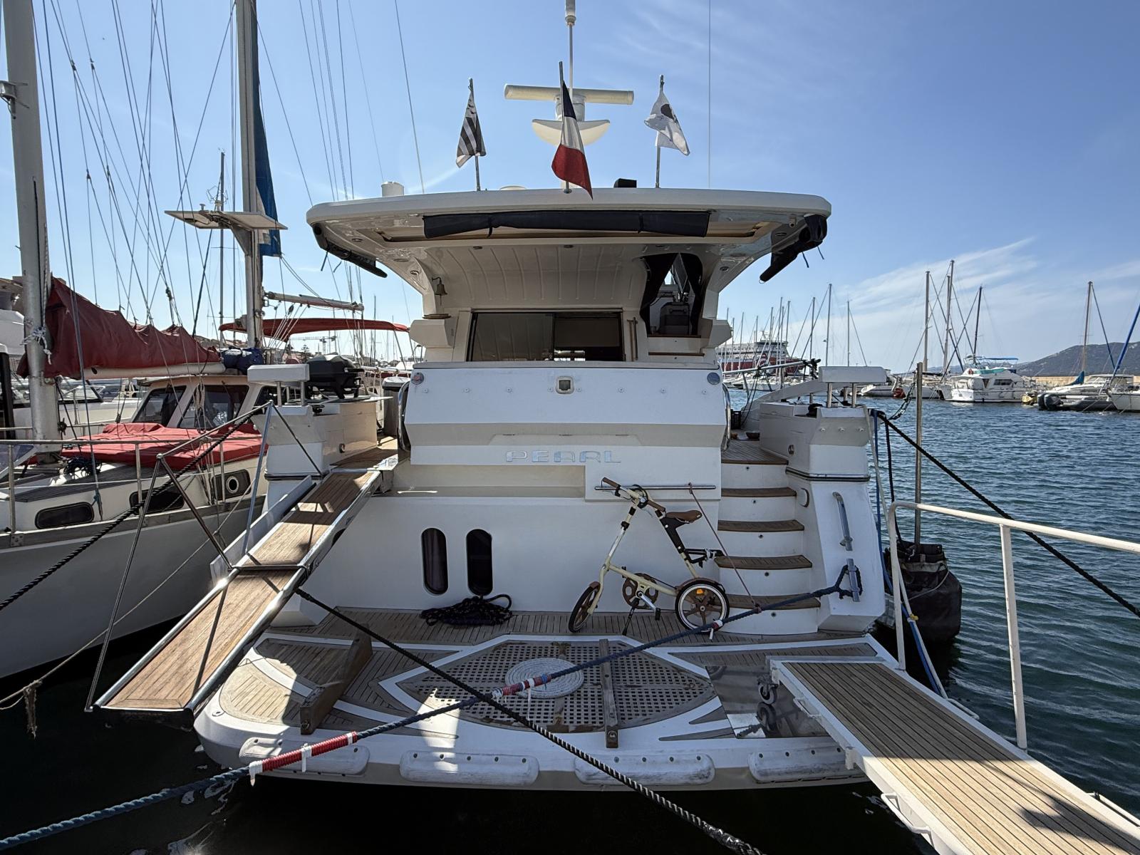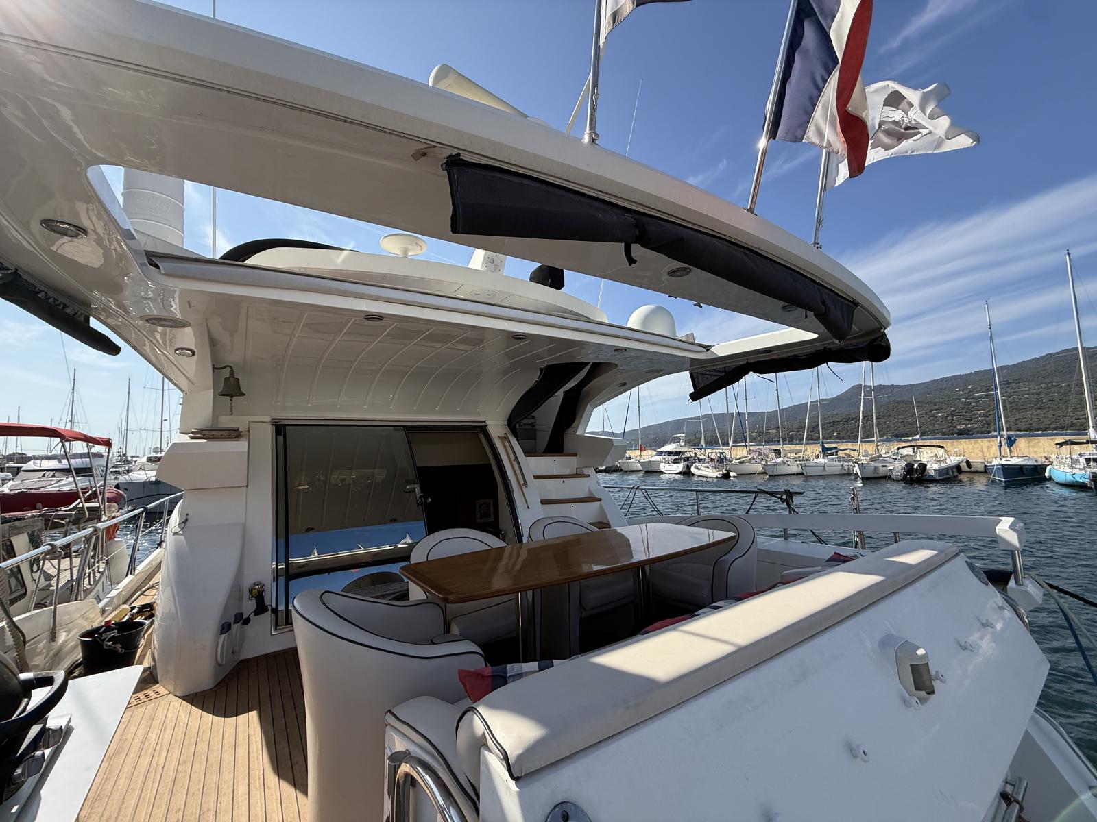 Côté extérieur, le yacht propose un flybridge spacieux avec coin repas et bains de soleil, un pont arrière convivial protégé d'un grand hard top électrique et une plateforme de bain hydraulique idéale pour les loisirs nautiques.