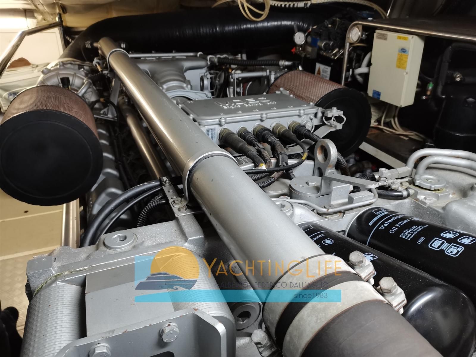 Alarme moteur, Alarme de pompe de cale, Eau sous pression, 14 Batteries, Passavant en teck, Douche de cockpit, Flaps hydrauliques, Garage à annexe, Hard top, Extincteur(s) fixe(s), Indicateurs de flaps, Lavage de chaine, Éclairage de courtoisie, Spots sous-marins, Passerelle (idraulica), Plateforme arrière, Pompe de cale automatique, Porte latérale, Porte latérale, Cockpit en teck, Prise de quai, Guindeau électrique, Echelle de bain, table de cockpit, Corne, Winch électrique arrière.