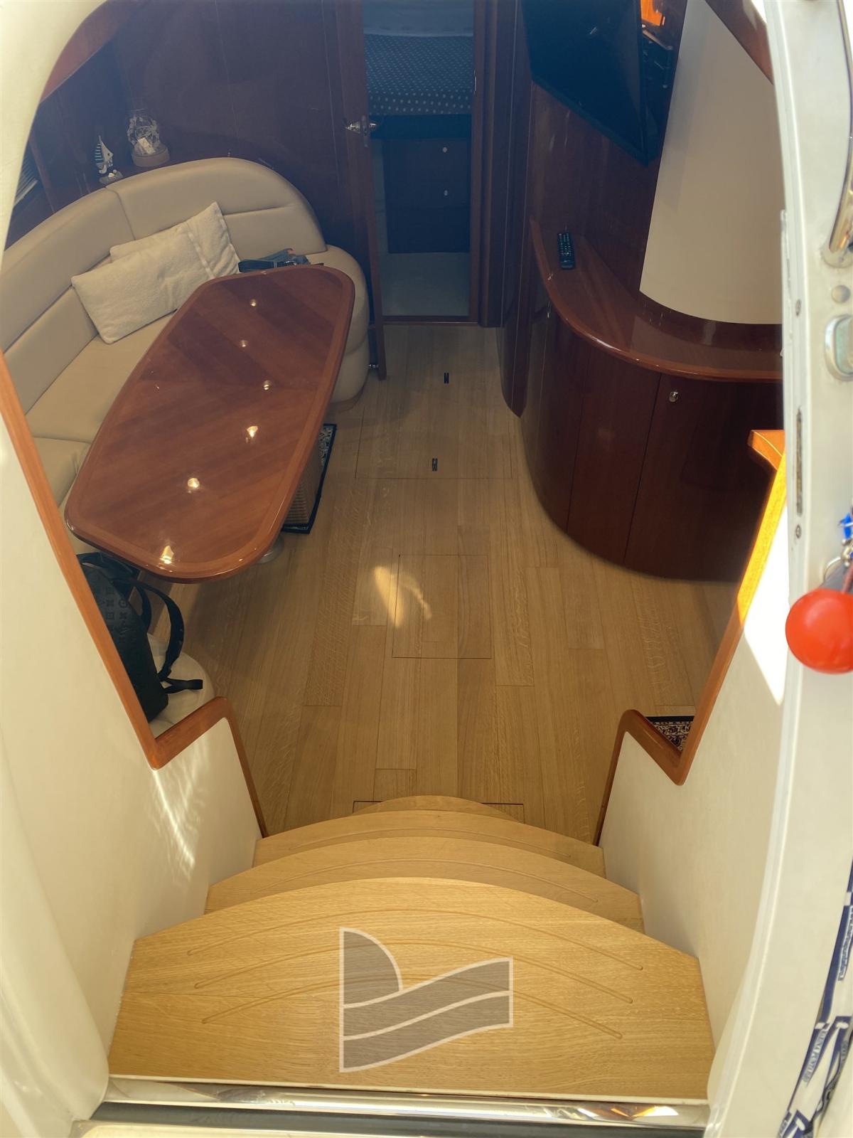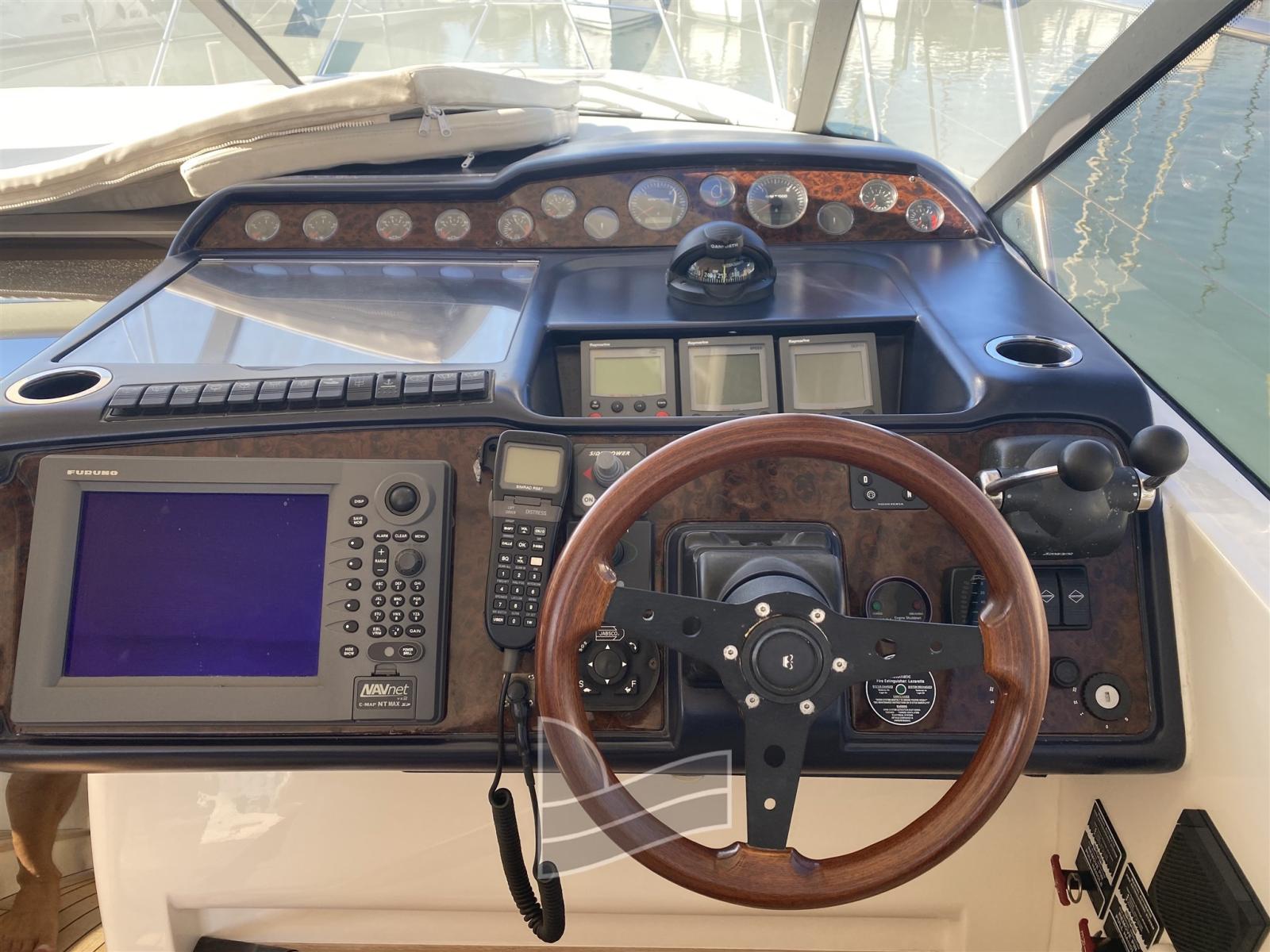 Alarme moteur, Eau sous pression, Couleur spéciale (Blue Navy), Douche de cockpit, 2 Flaps hydrauliques, Hard top, Extincteur(s) fixe(s), Lavabo dans le cockpit, Passerelle, Plateforme arrière (di poppa in teak), Porte latérale, Cockpit en teck, Prise de quai, Connexion eau sous pression à quai, Guindeau électrique, Echelle de bain, table de cockpit, Corne.
