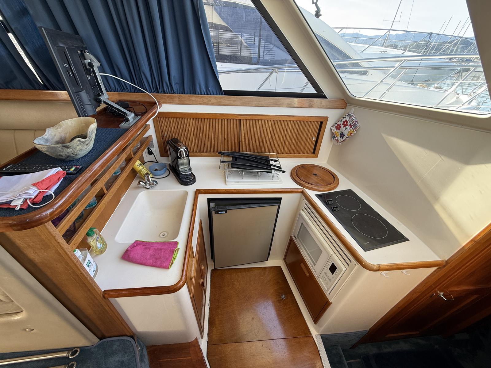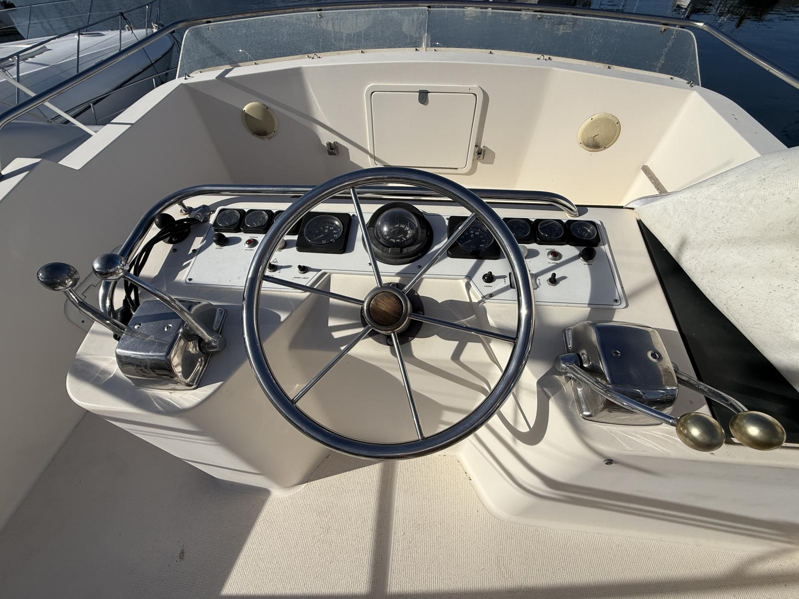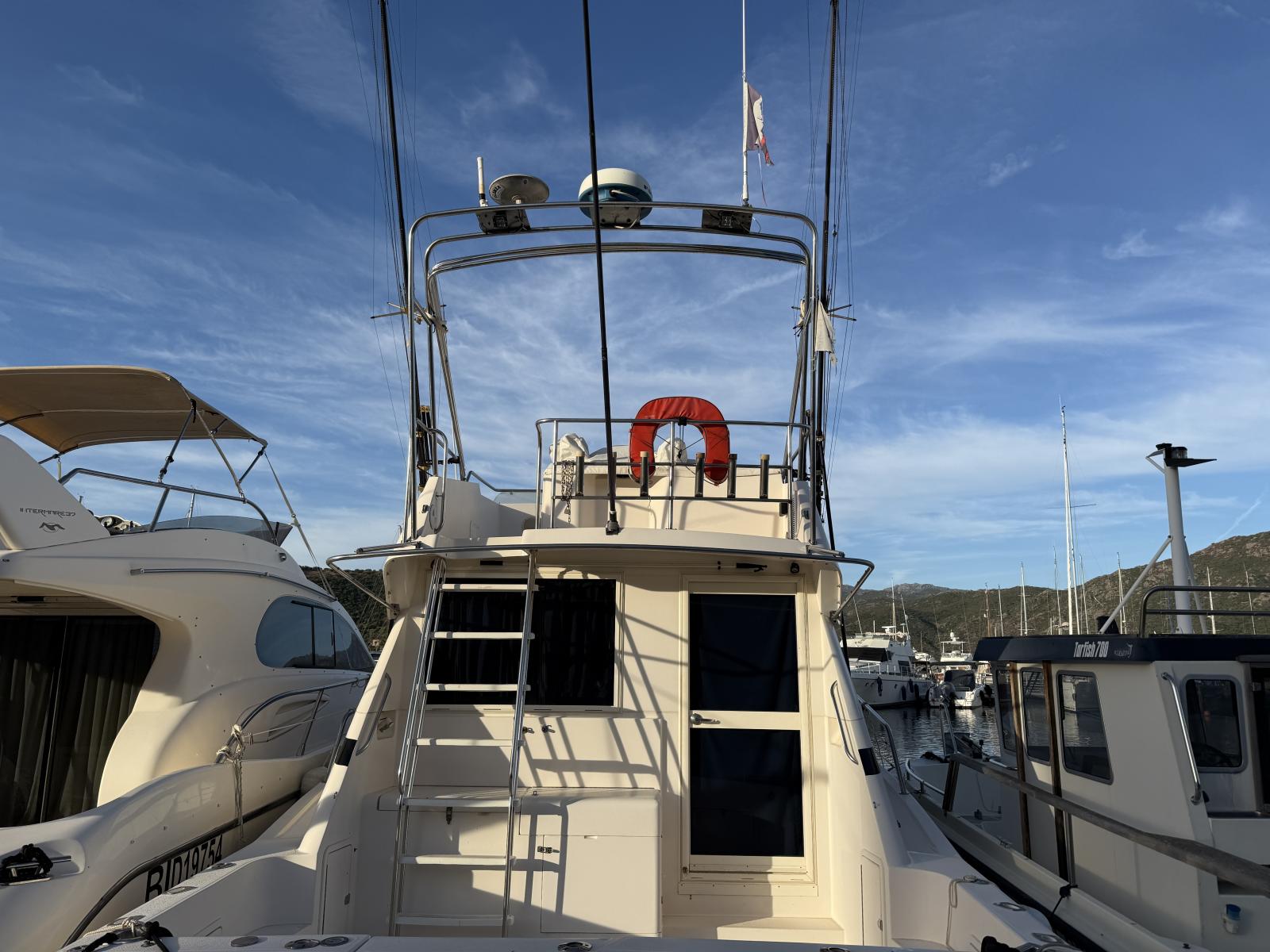 Équipements de confort : climatisation réversible, générateur Onan 6 kW, machine à glaçons, tauds de protection sur le flybridge et à l’arrière.