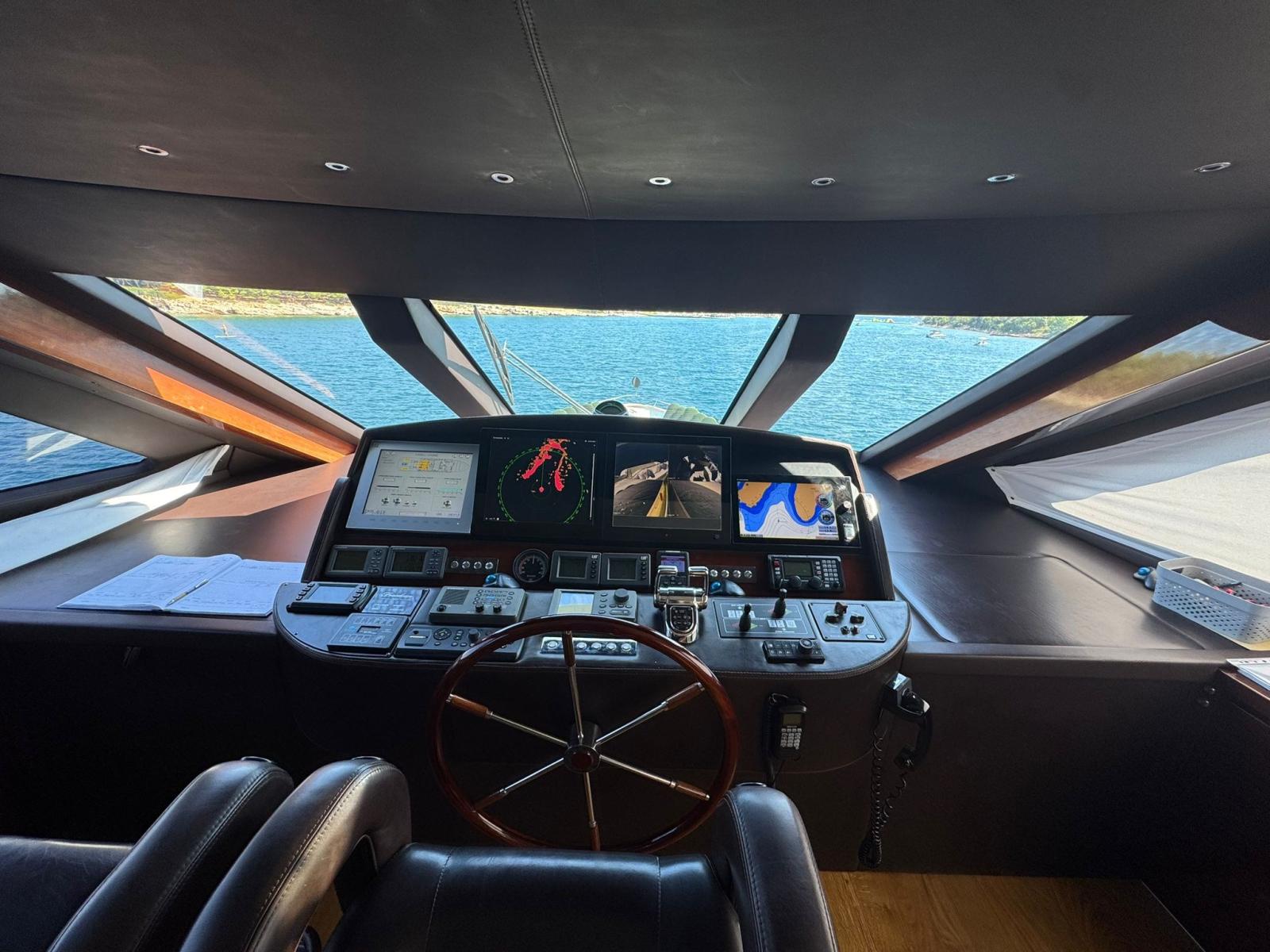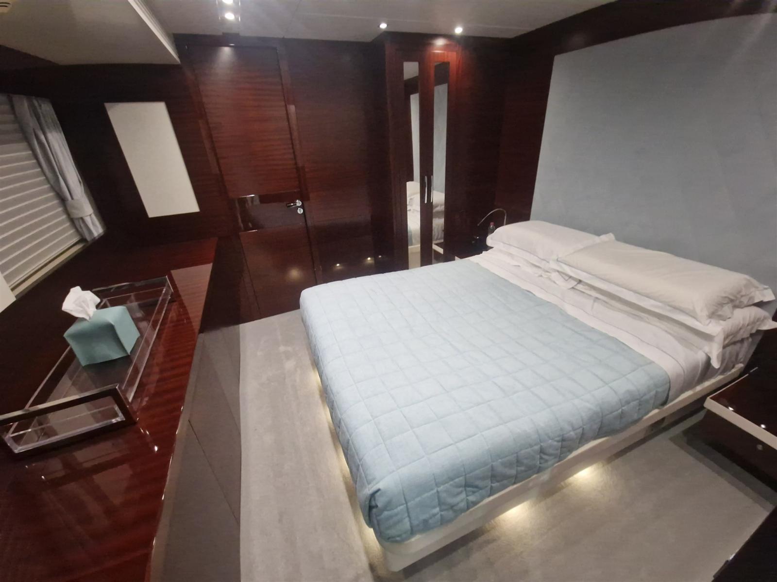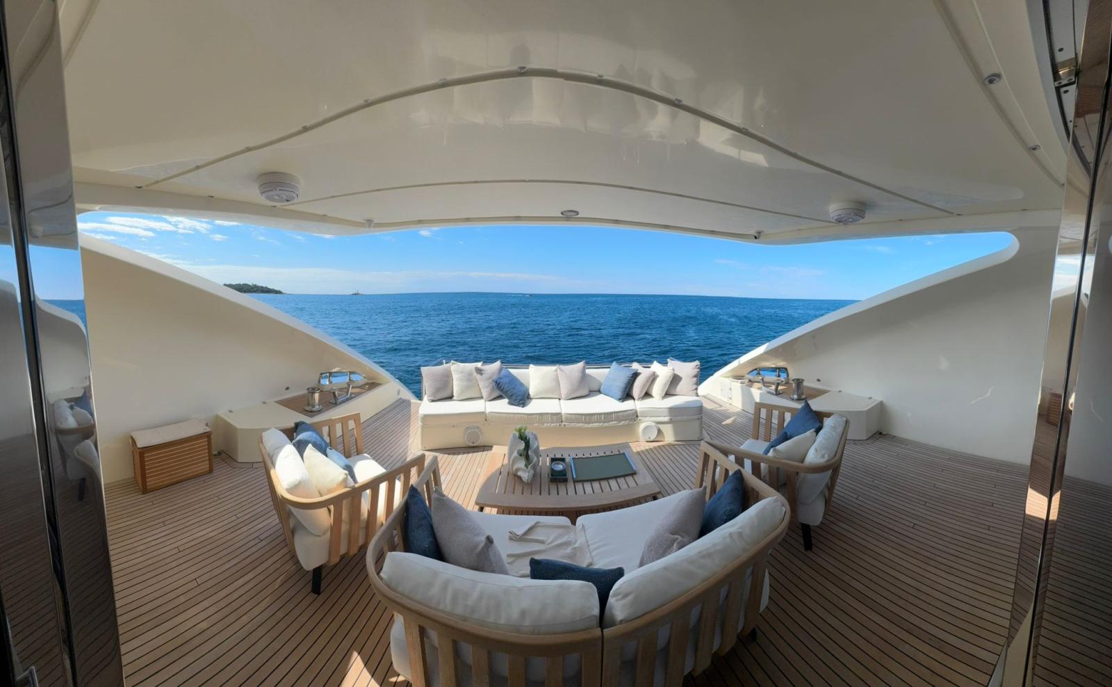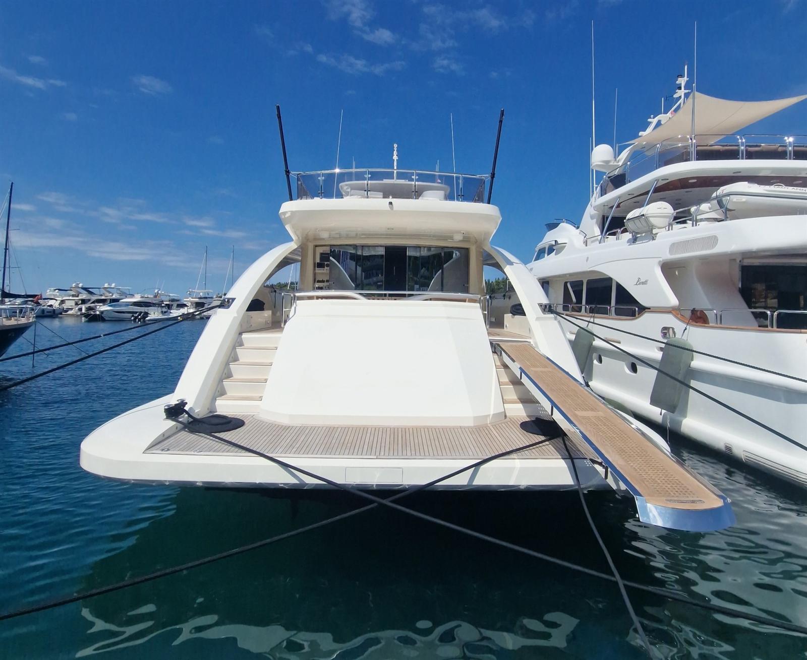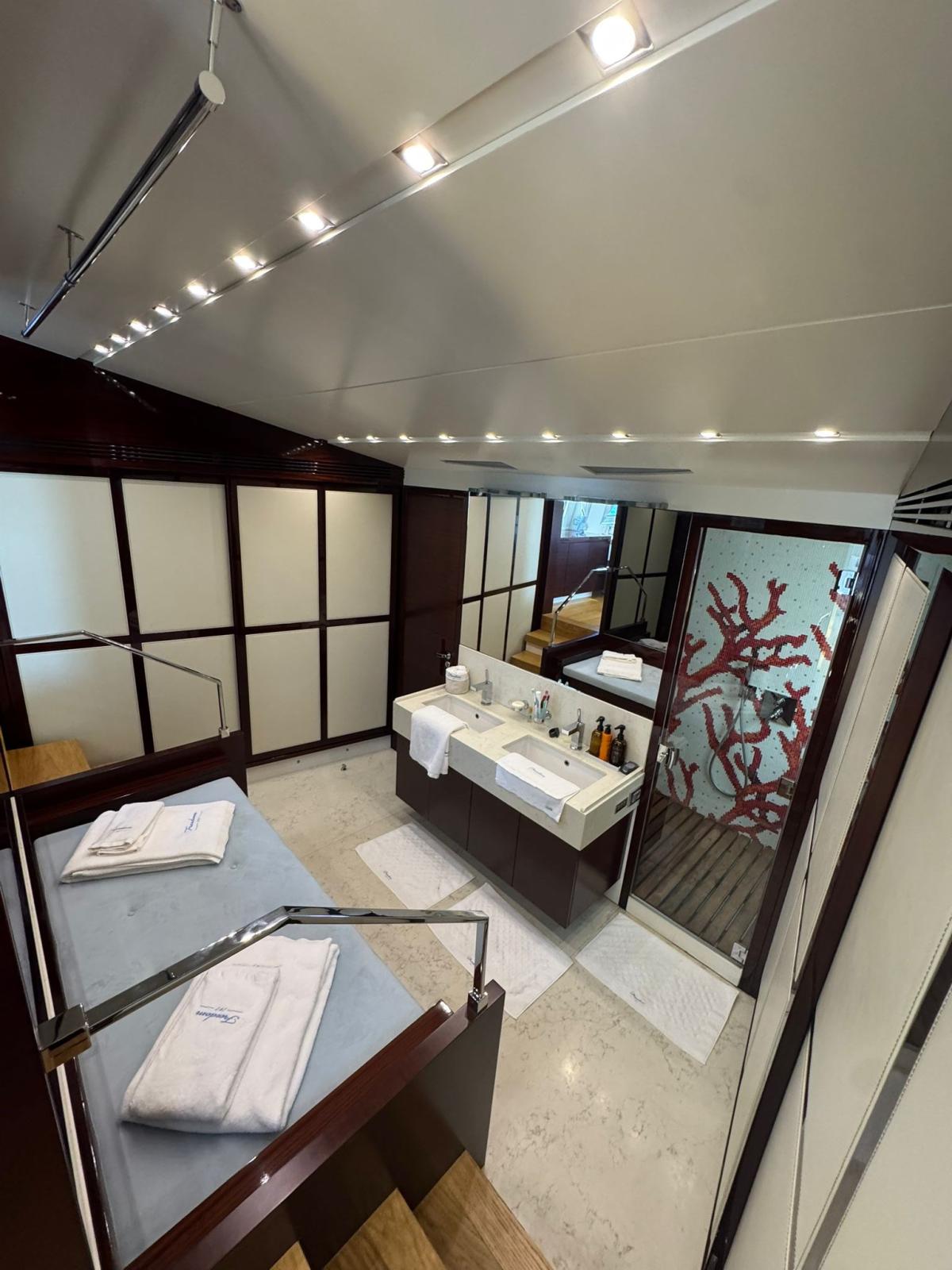Refit en 2019. : -Installation de 2 x nouveaux générateurs Kohler -Installation de 4 x stabilisateurs Humphree -Installation de 2 x Watermakers Idromar -Cabines invités augmentées de 5 places supplémentaires (1 cabine - 3 x lits simples et 1 cabine - 2 x places en lit double, avec nouveaux WC dans chaque cabine) -Nouveau parquet dans chaque chambre -Installation de TV extérieure + nouveau système surround (8 x haut-parleurs + 4 x Subwoofers) -Installation de comptoir de bar extérieur sur le flybridge avec 2 x barbecues électriques Baratta, plaque électrique, réfrigérateur, machine à glaçons et évier -Nouvel aménagement du salon avec nouveau canapé 7 places, TV 70" et système surround Sonos (6 x haut-parleurs, barre de son et caisson de basses)