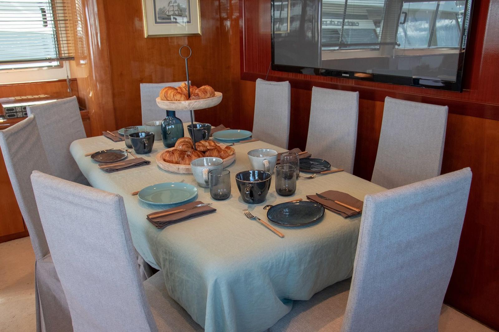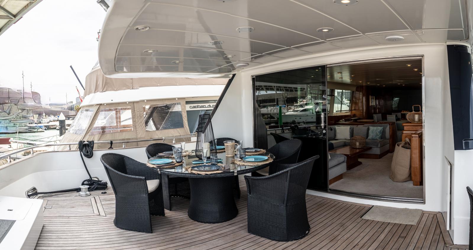 Caractéristiques principales générateurs 2 réaménagement en 2019 cabines 4 cabines invitées et 2 cabines marines équipements passerelle réservoir d’eaux noires plateforme de bain étendue turbo neuf pont avant spacieux possibilité de charter à quai ou en navigation