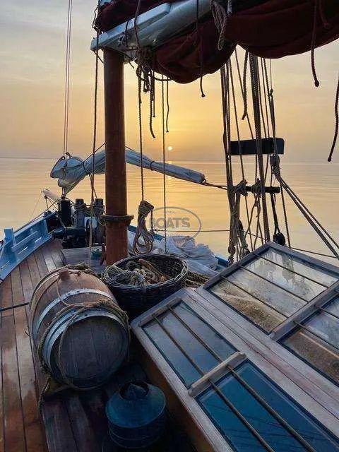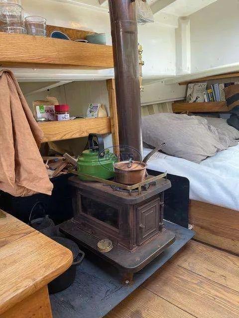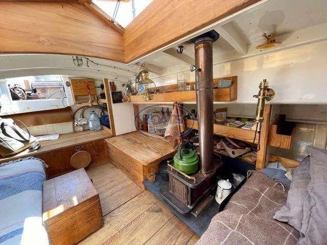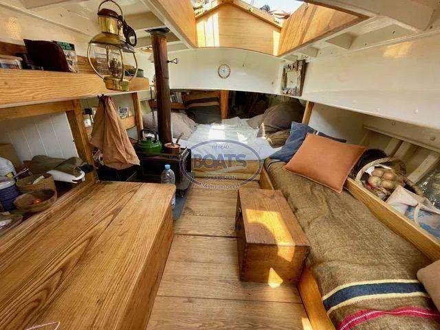 Fly a bénéficié d'une restauration minutieuse respectant son authenticité tout en l'adaptant aux exigences modernes. Le bateau est en parfait état, avec une coque solide et saine. La grand-voile en lin, réalisée en partie à la main, témoigne de l'attention portée aux détails. L'aménagement intérieur, rustique mais confortable, offre un espace fonctionnel avec une grande couchette double, un poêle à bois traditionnel, et de nombreux rangements.
