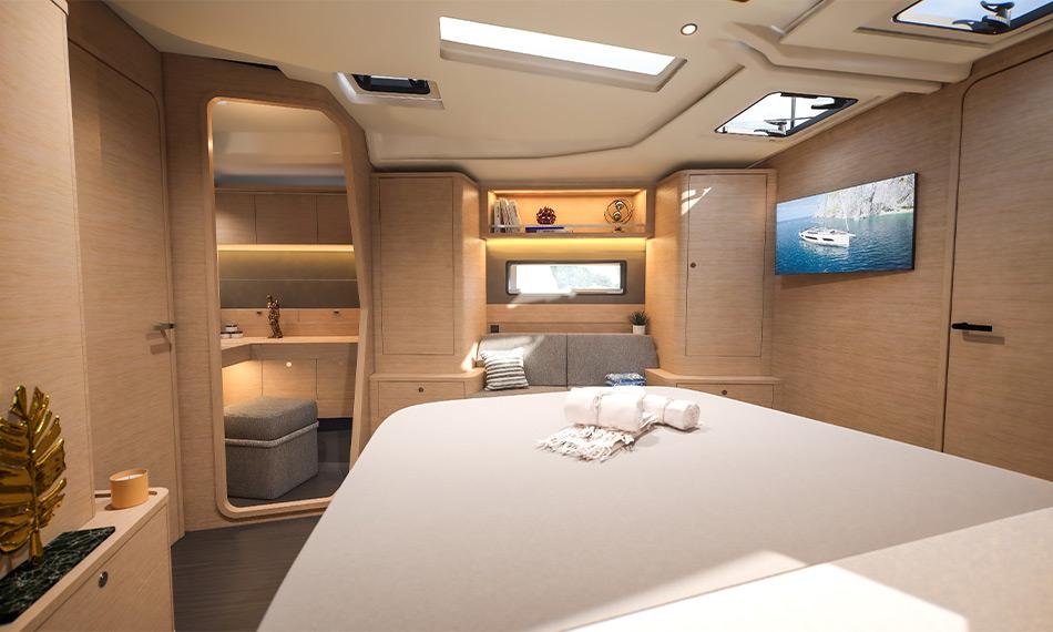 À l’intérieur, le Dufour 54 séduit par ses volumes généreux et lumineux, grâce aux grands vitrages de coque et de pont qui baignent les espaces de lumière naturelle. Disponible en plusieurs versions d’aménagement, il propose jusqu’à 4 cabines, dont une cabine propriétaire avant spacieuse, dotée d’une belle hauteur sous barrots et de nombreux rangements, digne d’unités plus grandes.