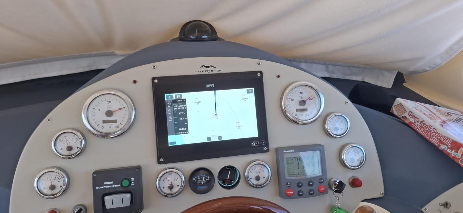 Indicateur d'angle de barre, Commande électrique, Compteur de chaîne, Pilote automatique (Raymarine), Plotter GPS, Radio VHF (Simorad AHS81).
