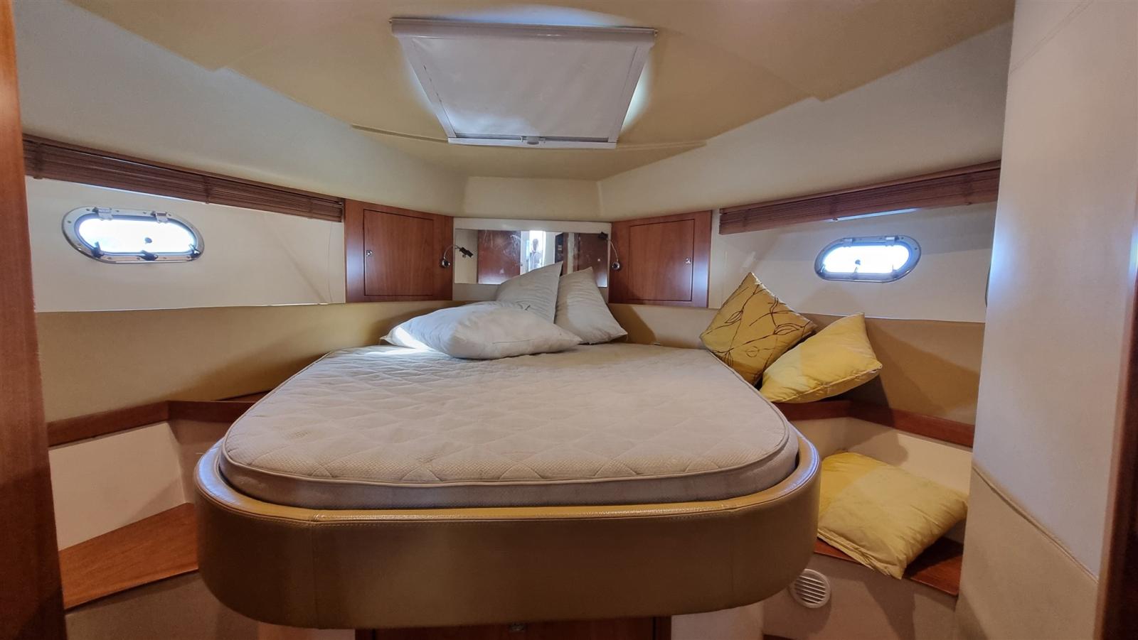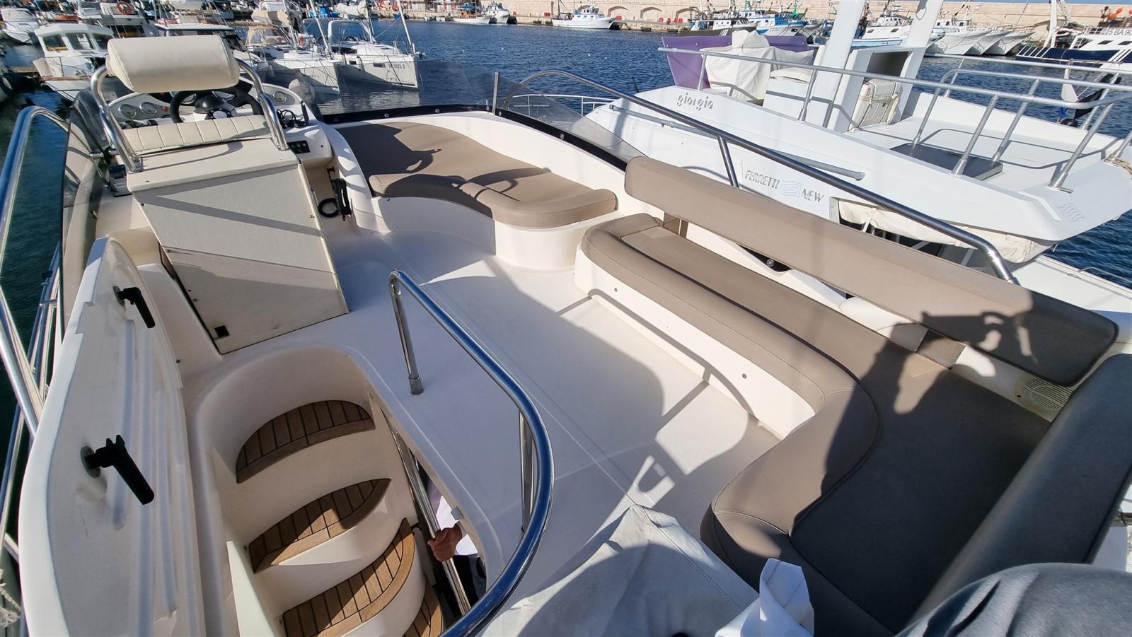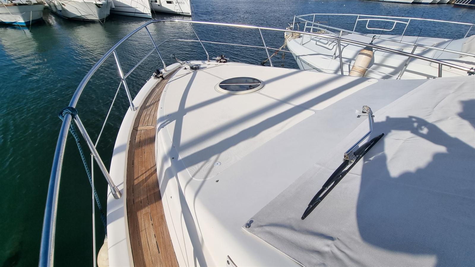 Alarme moteur, Passavant en teck (da gommare), Douche de cockpit, Phare de poursuite, Flaps hydrauliques, Éclairage de courtoisie, Spots sous-marins, Passerelle, Guindeau électrique, Echelle de bain, table de cockpit.
