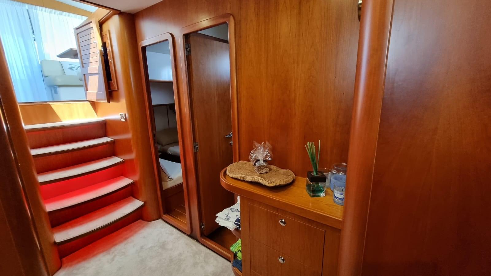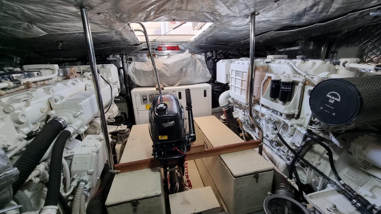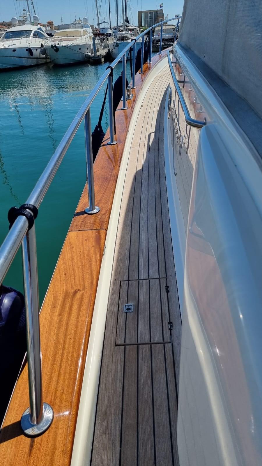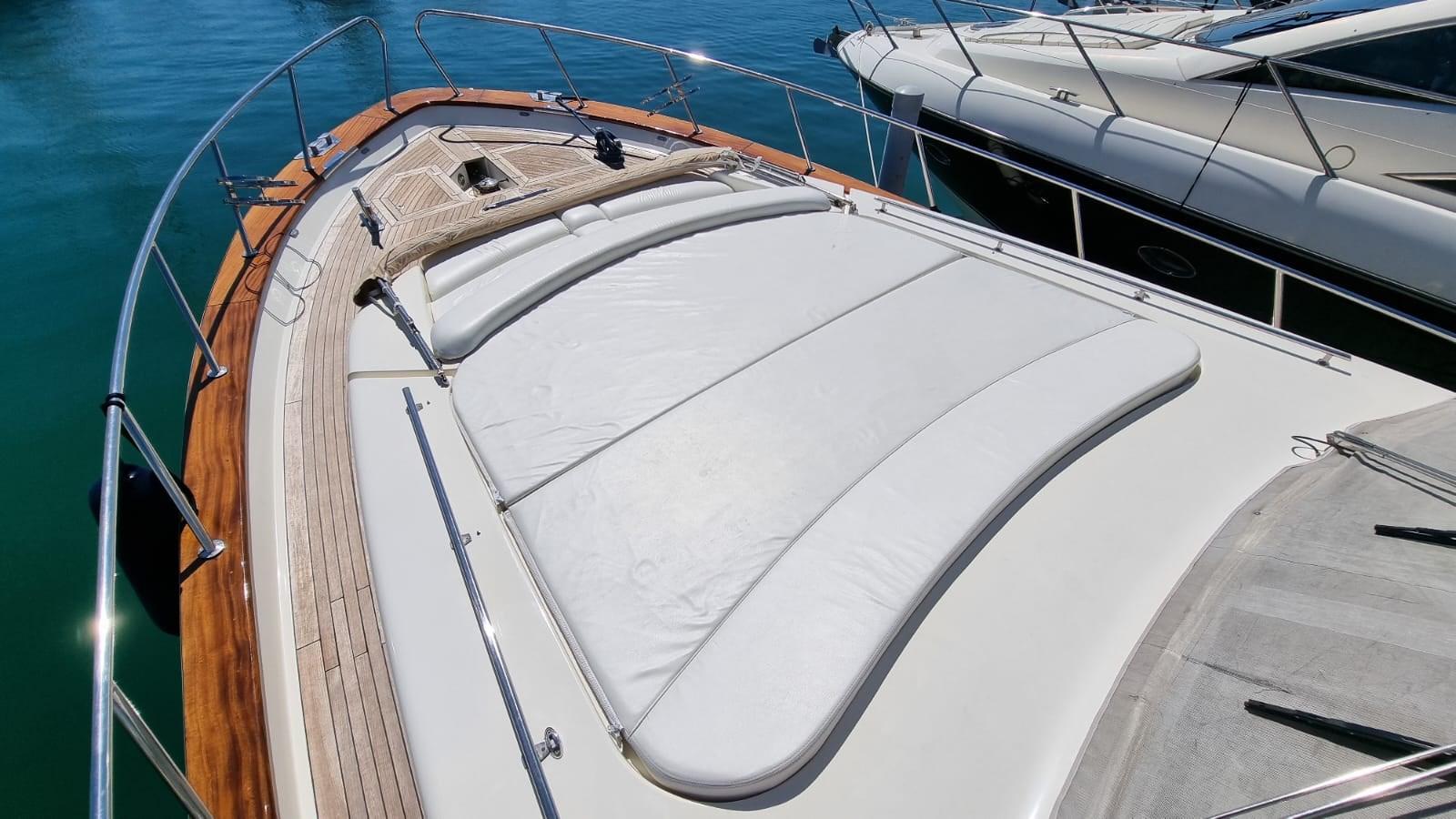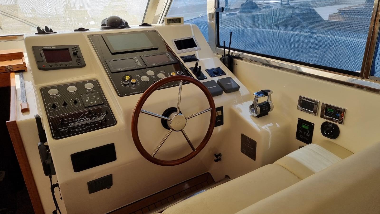 Alarme moteur, Alarme de pompe de cale, Eau sous pression, 8 Batteries (4 per motori e 4 per servizi), Passavant en teck, 2 Chargeur de batterie, Douche de cockpit, Phares fixes arrière, Phare de poursuite, Flaps hydrauliques, Extincteur(s) fixe(s), Indicateurs de flaps, Lavage de chaine, Éclairage de courtoisie, Passerelle (Idraulica), Plateforme arrière, Pompe de cale automatique, Porte latérale, Cockpit en teck, Prise de quai, Connexion eau sous pression à quai, Onduleur, Guindeau électrique, Echelle de bain, table de cockpit, Annexe (2,30 m con Evenrude 4 hp), Corne, 2 Winch électrique arrière.