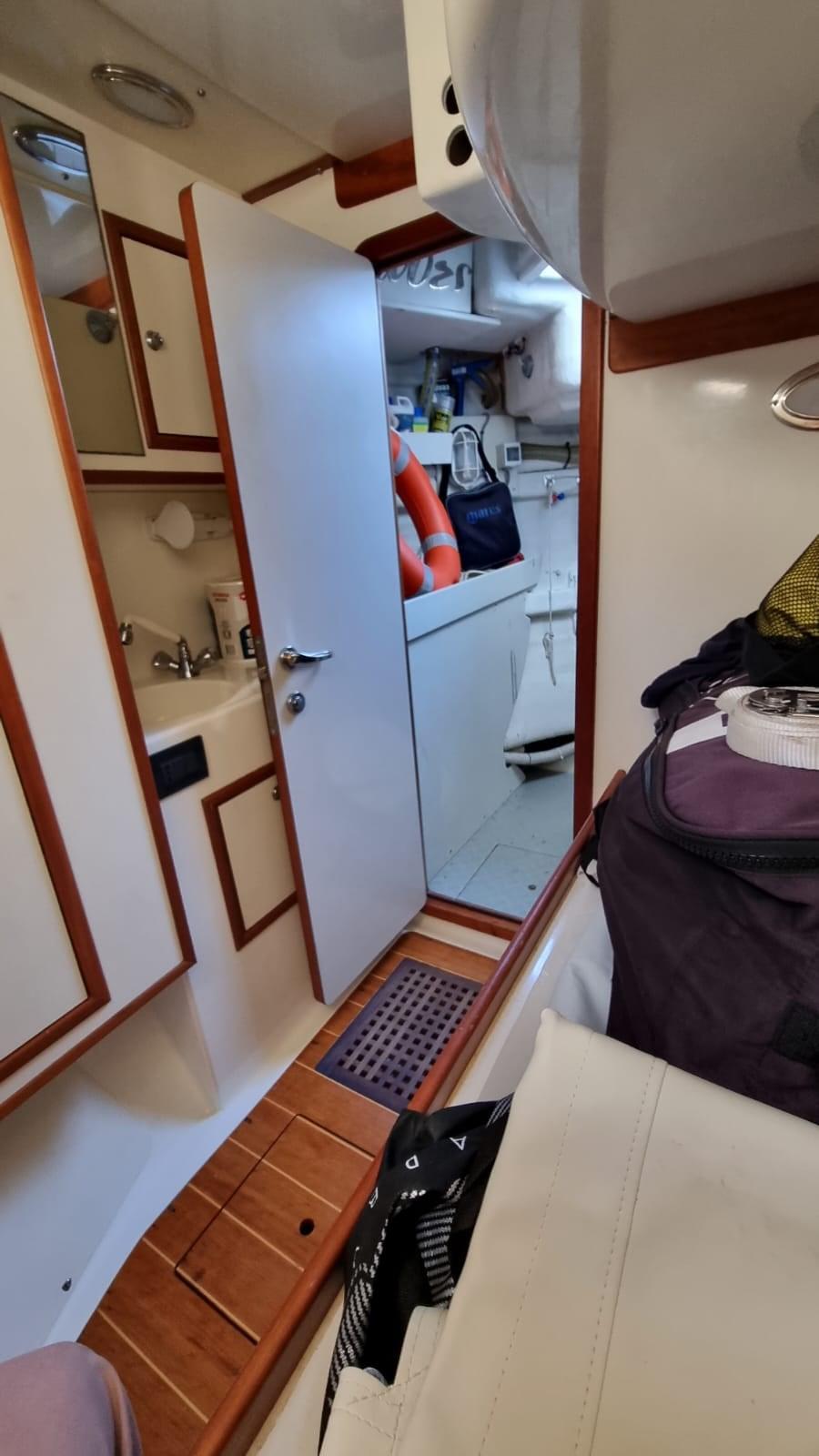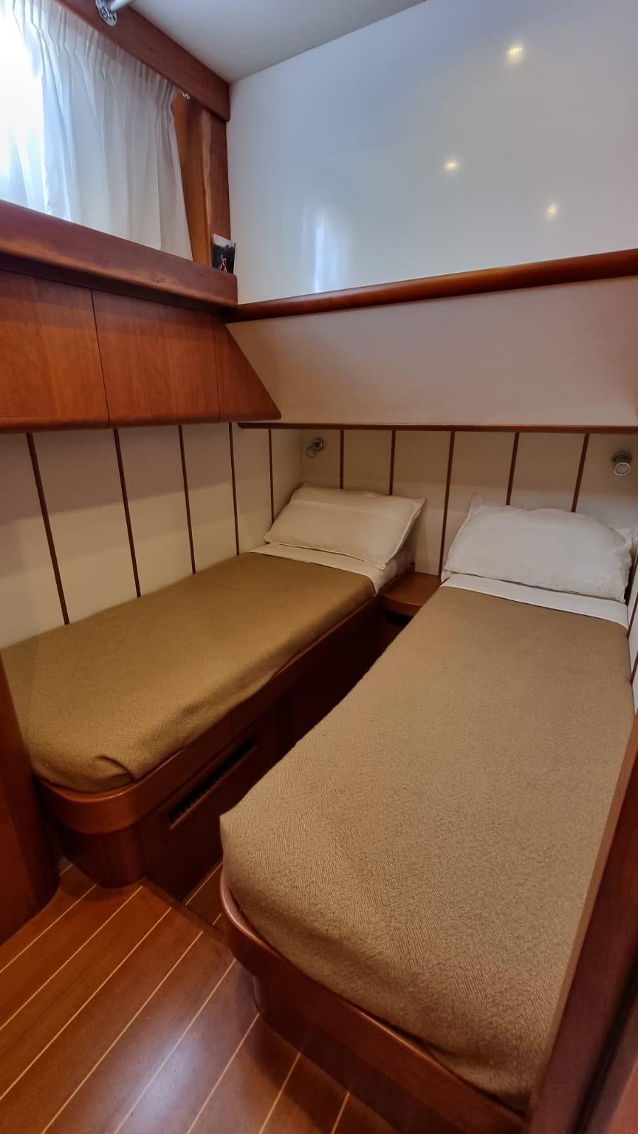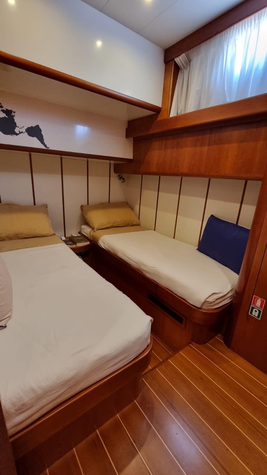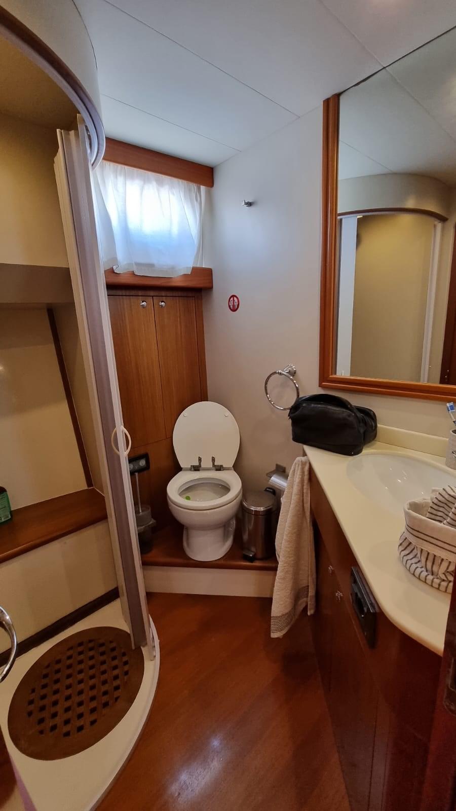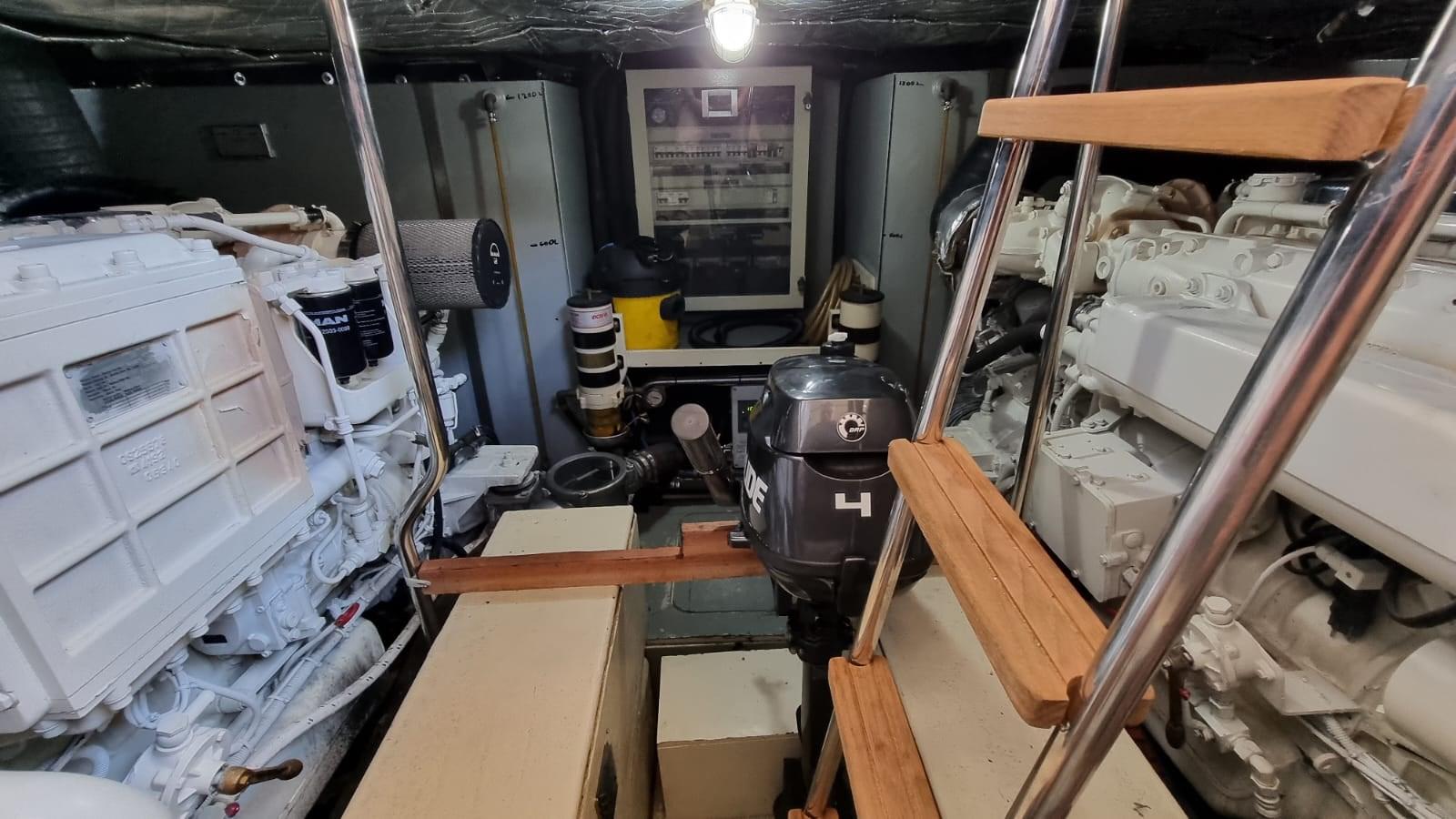 Alarme moteur, Alarme de pompe de cale, Eau sous pression, 8 Batteries (4 per motori e 4 per servizi), Passavant en teck, 2 Chargeur de batterie, Douche de cockpit, Phares fixes arrière, Phare de poursuite, Flaps hydrauliques, Extincteur(s) fixe(s), Indicateurs de flaps, Lavage de chaine, Éclairage de courtoisie, Passerelle (Idraulica), Plateforme arrière, Pompe de cale automatique, Porte latérale, Cockpit en teck, Prise de quai, Connexion eau sous pression à quai, Onduleur, Guindeau électrique, Echelle de bain, table de cockpit, Annexe (2,30 m con Evenrude 4 hp), Corne, 2 Winch électrique arrière.