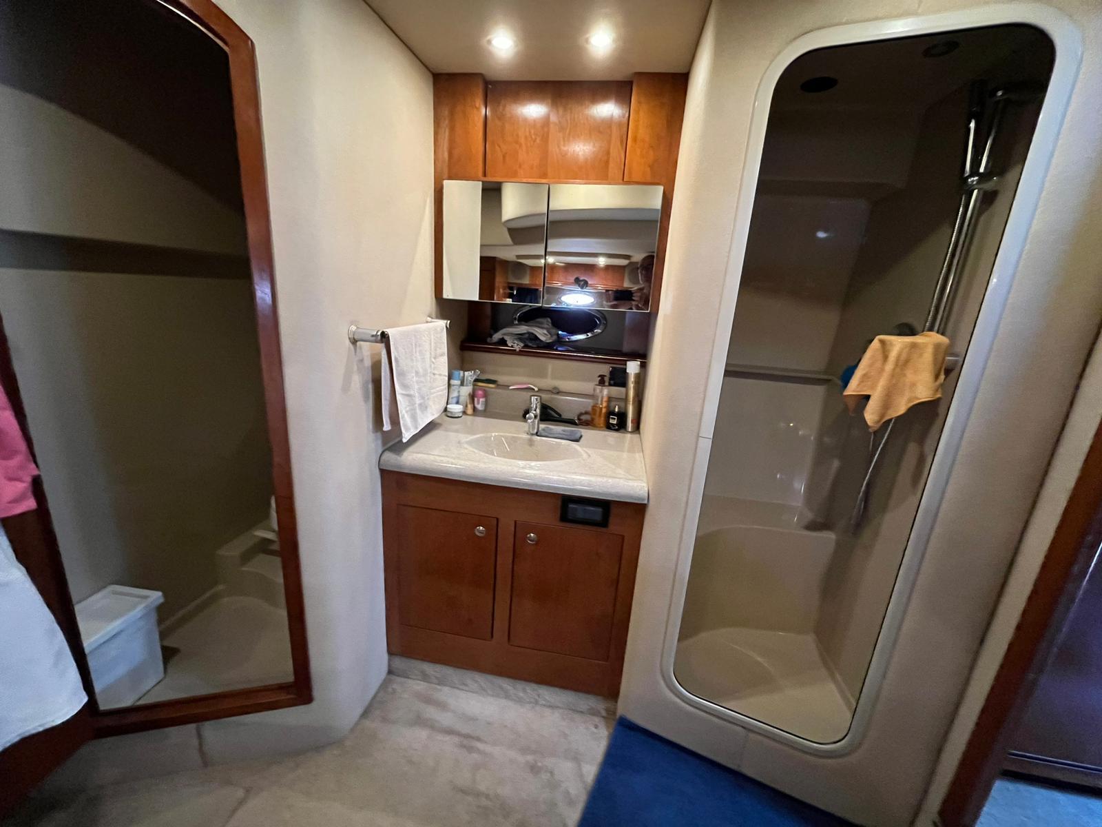 À l’intérieur, on retrouve une cabine propriétaire avec salle d’eau privative, ainsi que deux cabines invités. La hauteur sous barrot est remarquable, et le bateau dispose de deux cabinets de toilette avec WC.