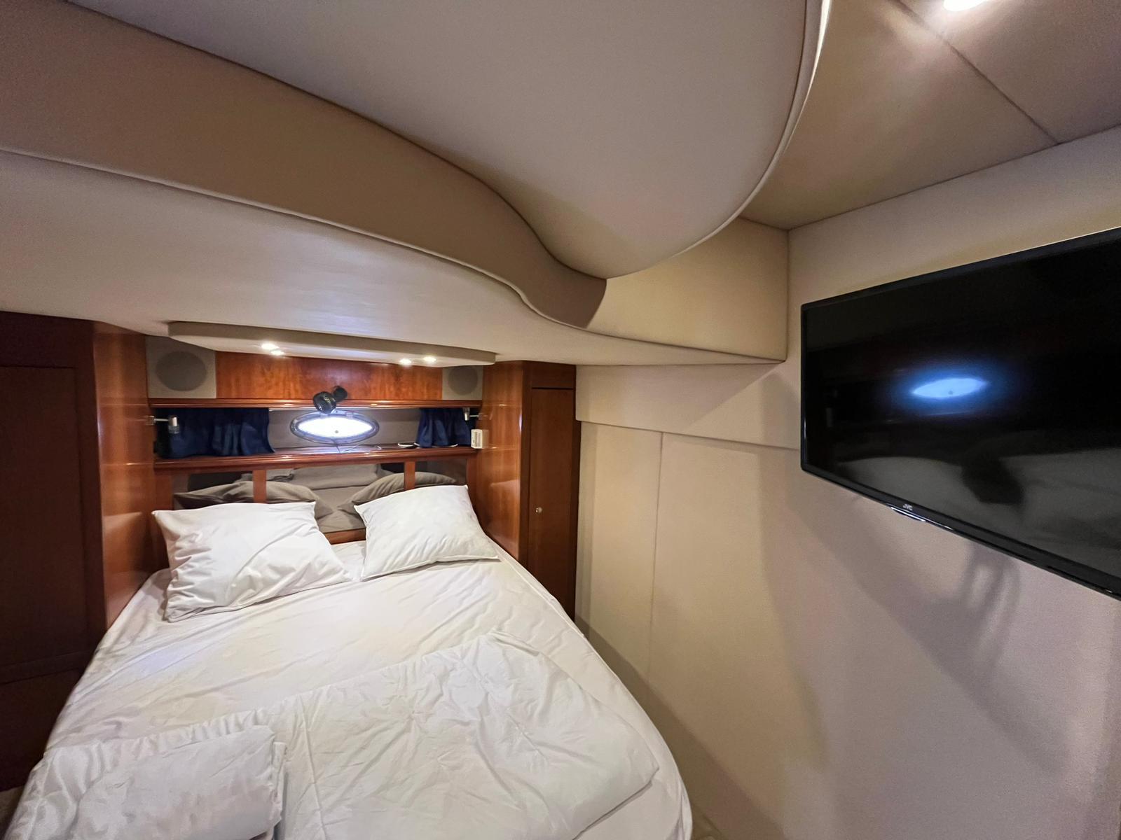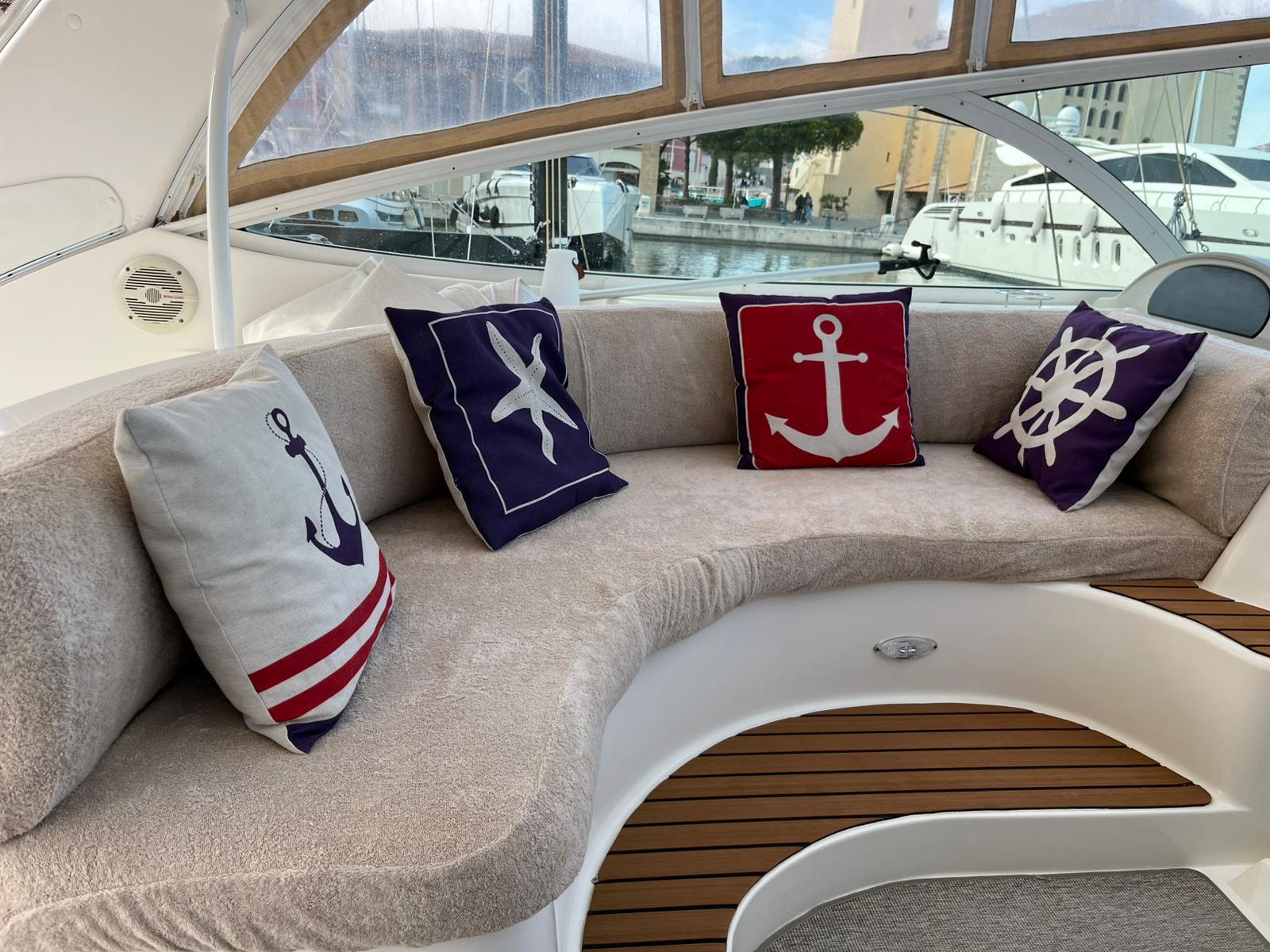 Deux guindeaux à l’avant-Winchs bâbord et tribord-Taud sur le bain de soleil-Housses de sellerie extérieure en éponge-Passerelle hydraulique Opacmare-VHF Navicom, traceurLowrance-Trois téléviseurs répartis entre le carré et les cabines-Climatisation-Générateur Onan 11K-Réfrigérateur et congélateur