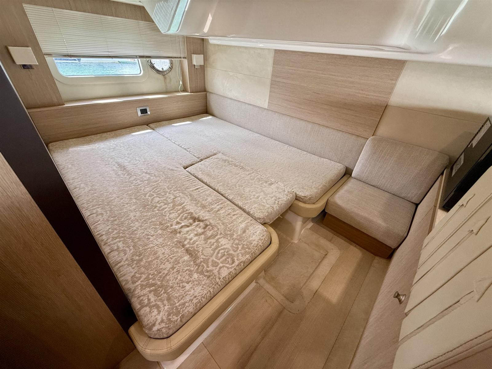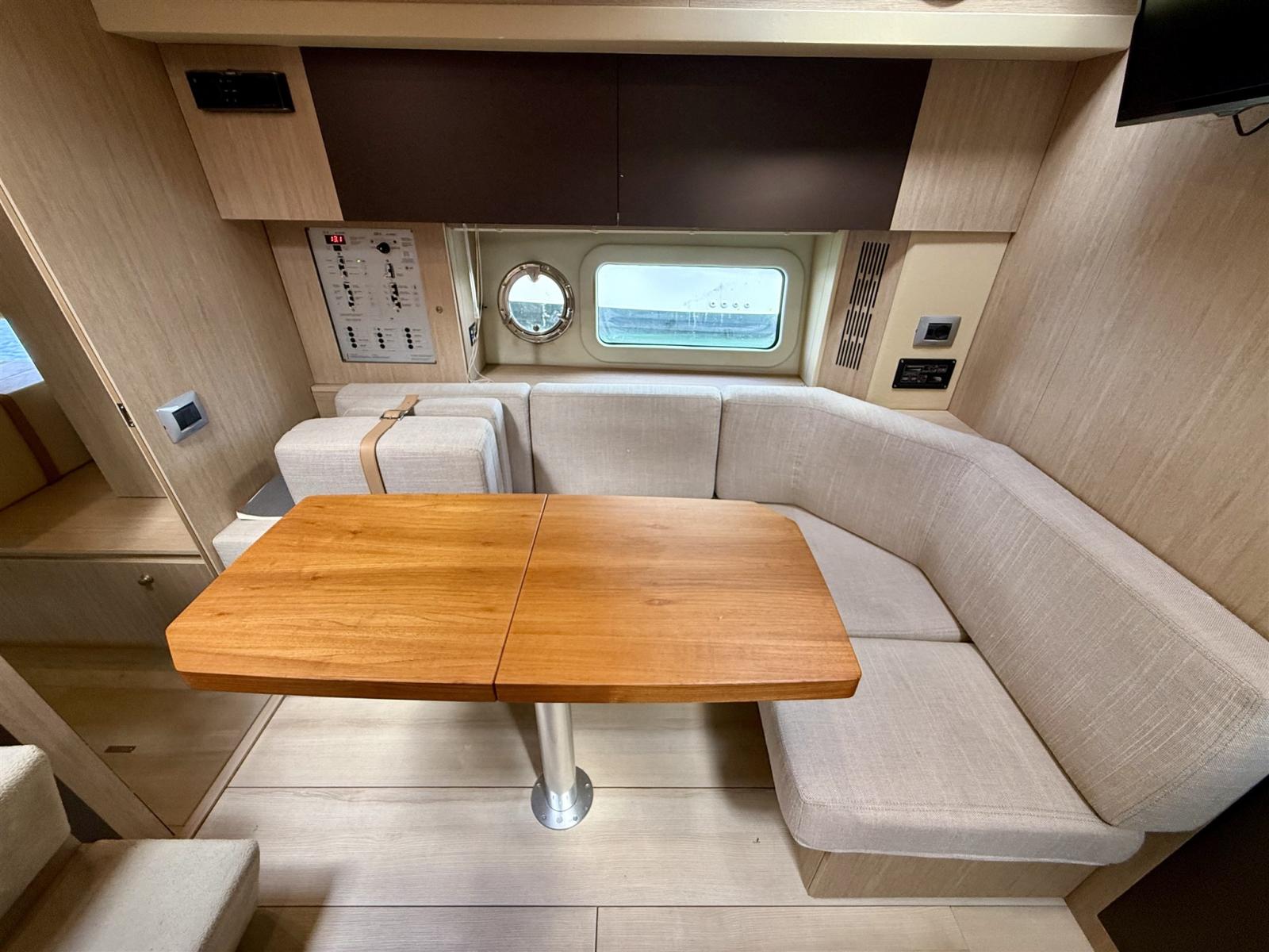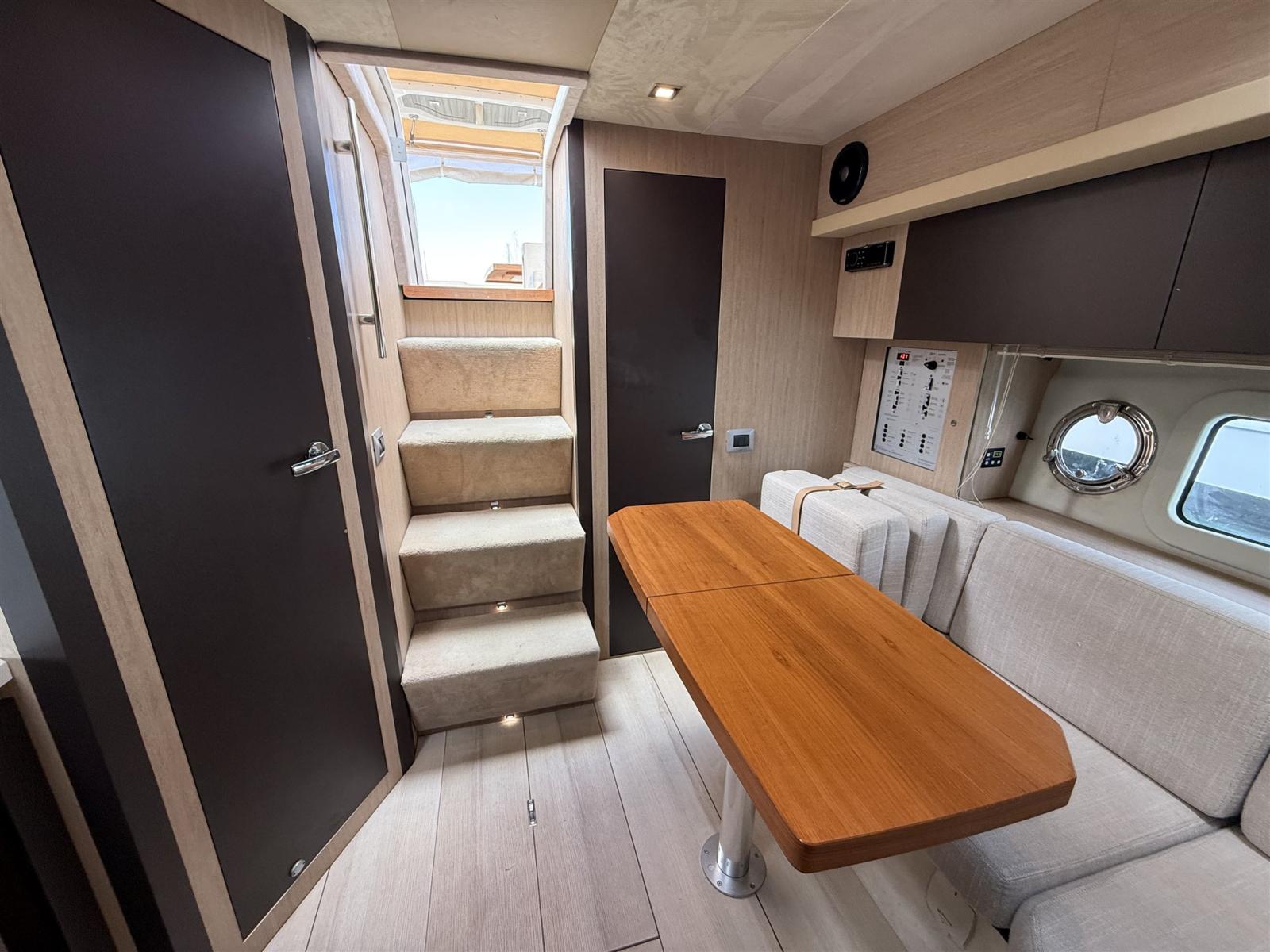 Ancre (15 KG), Eau sous pression, Câble d’alimentation à quai, Douche de cockpit, Propulseur d'étrave (SIDEPOWER), Flaps hydrauliques, Lavabo dans le cockpit, Éclairage de courtoisie, Défenses, Plateforme arrière, Pompe de cale manuelle, Porte latérale, Cockpit en teck, Prise de quai, Connexion eau sous pression à quai, Guindeau électrique, Echelle de bain, table de cockpit, Table pliante de salon.