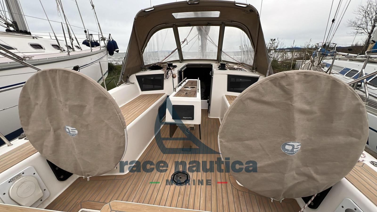 Hublot ouvrant supplémentaire dans la grande cabine arrière à bâbord du cockpit, intérieur en chêne, comptoirs en Corian gris, planchers en chêne, supplément pour moteur à voile de 29 CV, propulseur d’étrave rétractable, pack de croisière électronique, hélice repliable bipale, 2 treuils AR T40 pour grand-voile, génois et écoutes de gennaker, équipement gennaker avec mât de spi fixe, mise à niveau pour sièges de cockpit en teck synthétique avec joints gris, Protection d’étrave en acier inoxydable, coussins de cockpit de couleur chinè, ancre avec chaîne de 50m, 6 défenses, 3 amarres, réservoir d’eau supplémentaire.