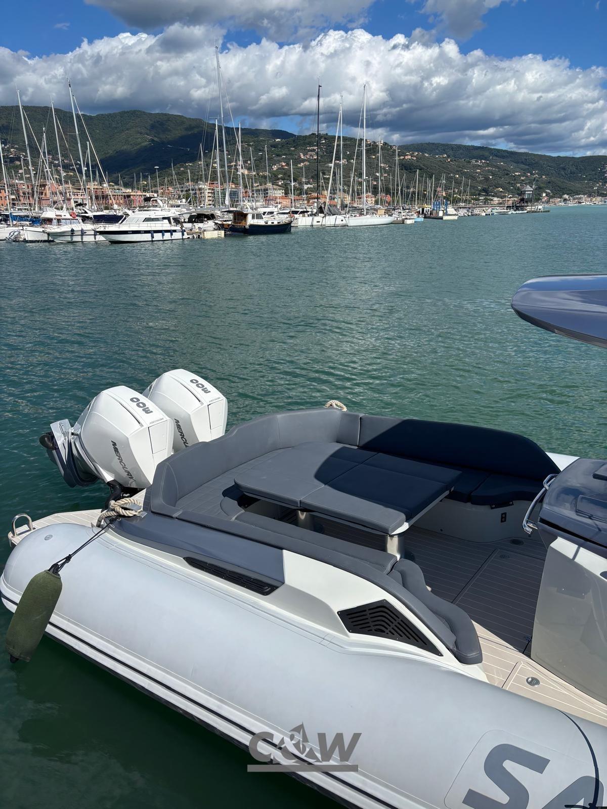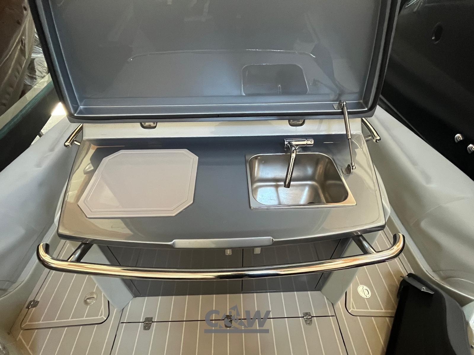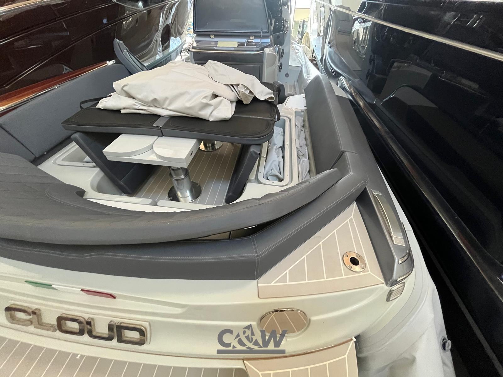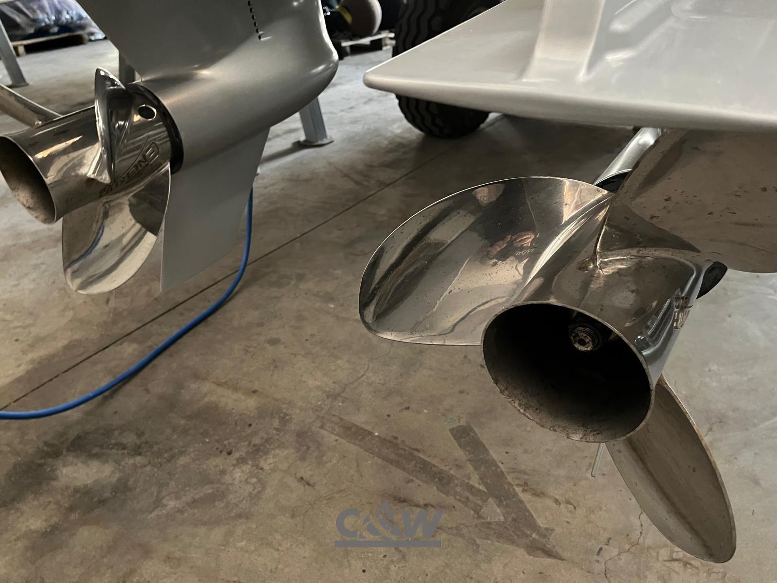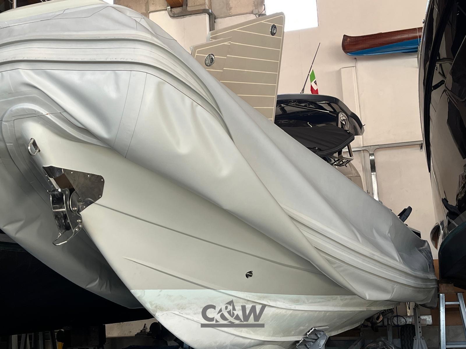 Câble d’alimentation à quai, Douche de cockpit, Lavabo dans le cockpit, Éclairage de courtoisie (pozzetto), Spots sous-marins (poppa), 6 Défenses, Pompe de cale automatique, Guindeau électrique, Echelle de bain, table de cockpit (elettrico), Corne, T-Top (fibra di carbonio e acciaio verniciato in grigio).