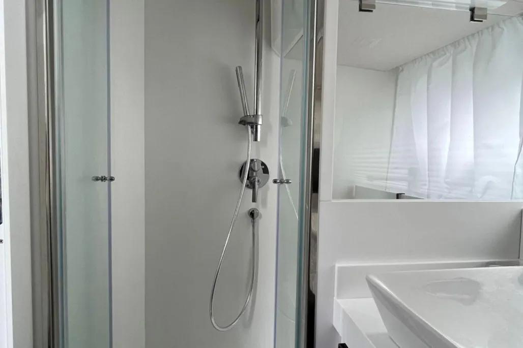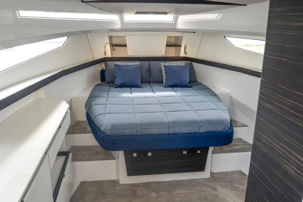 Sous le pont, le 39 SW surprend par son volume intérieur généreux pour un bateau de cette taille, ce qui le rend idéal pour des escapades le temps d’un week-end. La cabine propriétaire dispose d’un lit double et de solutions de rangement raffinées, tandis que la cabine twin bénéficie d’une belle hauteur sous barrots et de lumière naturelle. Une salle d’eau indépendante, entièrement équipée avec douche séparée, apporte confort et praticité. Avec la climatisation, un système audio Fusion et une Smart TV Samsung, le yacht combine luxe et commodité.