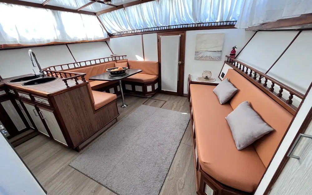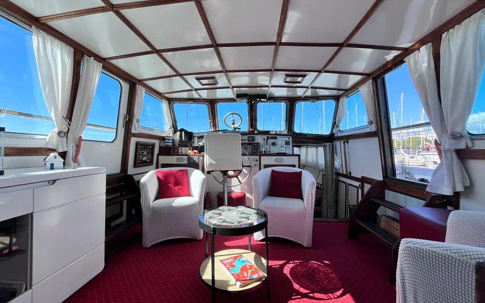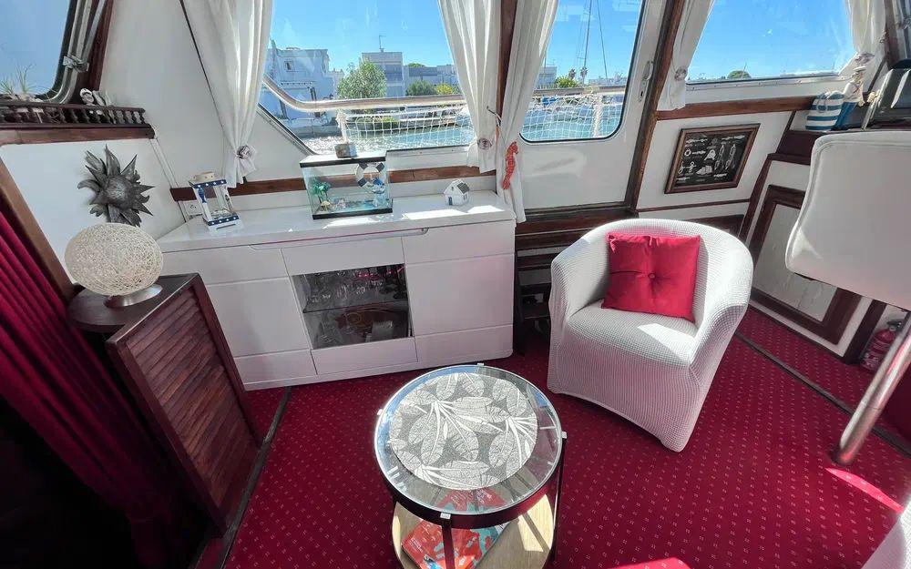Côté navigation, cette unité d’occasion en dépôt-vente est motorisée par deux puissants DAF diesel de 105 ch chacun (seulement 3000 heures au compteur !), associés à un équipement complet : GPS, sondeur, VHF, compas, logiciel de navigation, stabilisateur et même un groupe électrogène pour rester autonome où que vous soyez. Sécurité ? Rien n’a été laissé de côté : gilets de sauvetage, armement côtier, défenses, amarres, ancre et fusées de détresse sont déjà à bord, sans oublier la facilité des bossoirs d’annexe, et le confort de la passerelle.