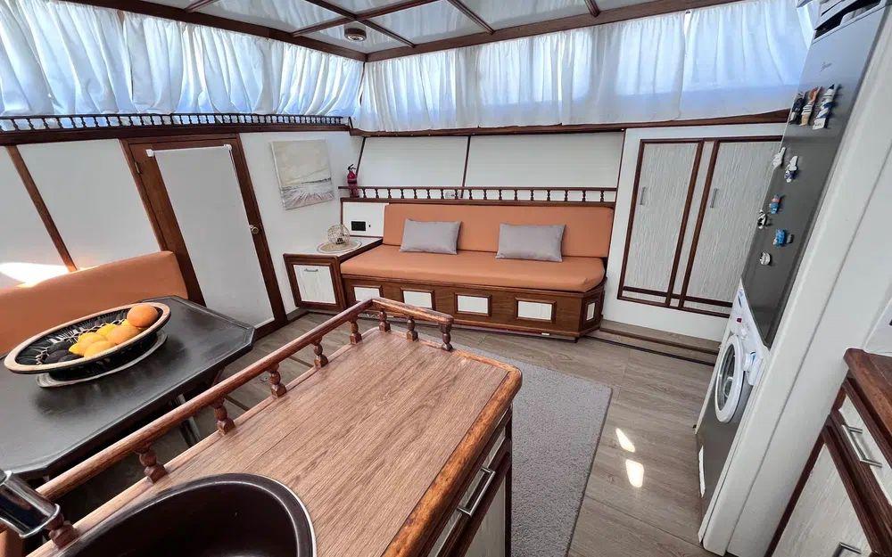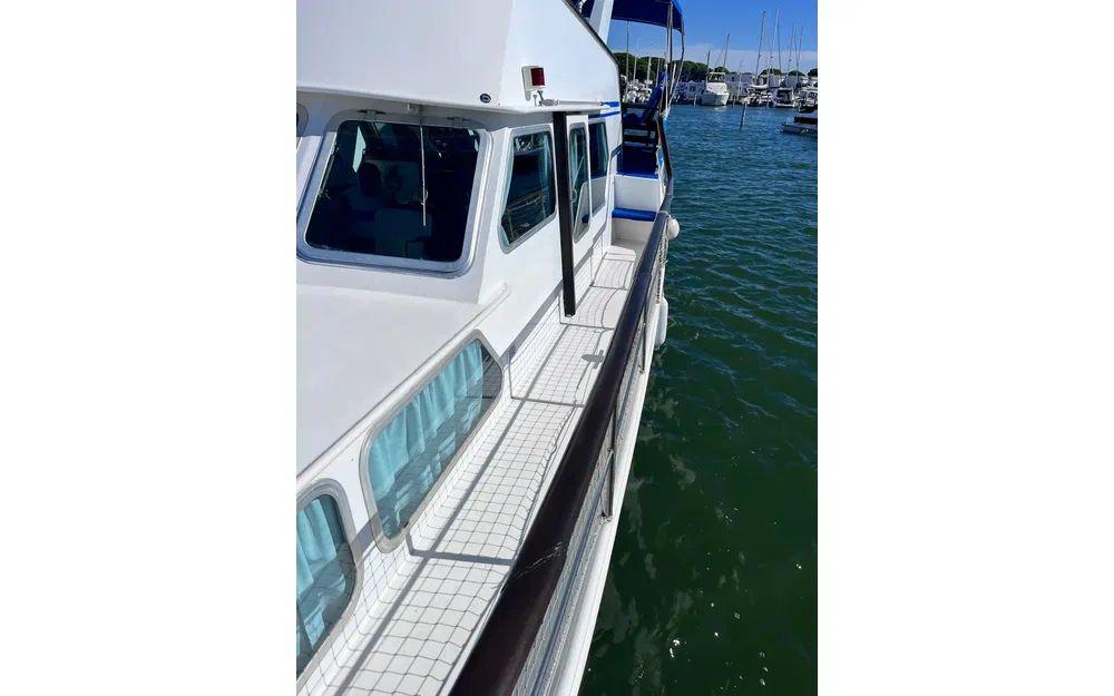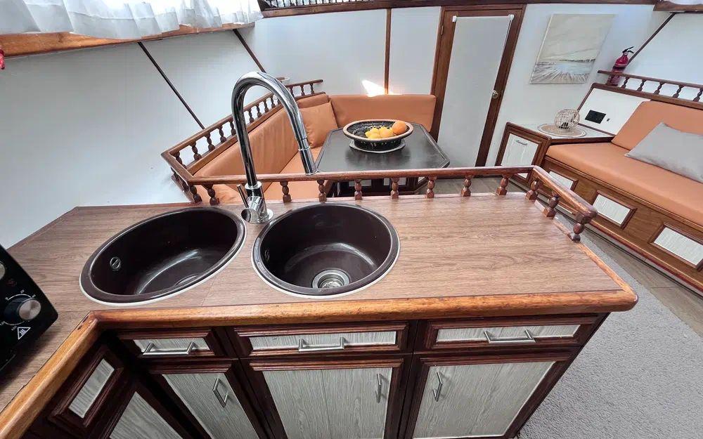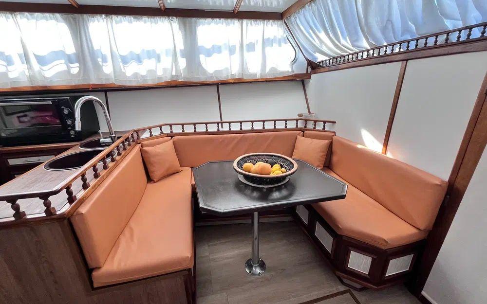 Ce Trawler, c’est bien plus qu’un simple bateau à moteur : il a tout d’une petite maison flottante ! Dans la cuisine, vous trouverez four, micro-ondes, cuisinière, réfrigérateur, évier et même une machine à laver ! Grâce au chauffage, au chauffe-eau et au circuit 220 V, tout a été prévu pour aborder chaque saison avec sérénité. La vie à bord se passe aussi en extérieur : flybridge avec taud de protection, platforme arrière pour plonger ou bronzer, banquettes extérieures pour profiter du soleil… Il ne manque rien, pas même la douchette eau douce !
