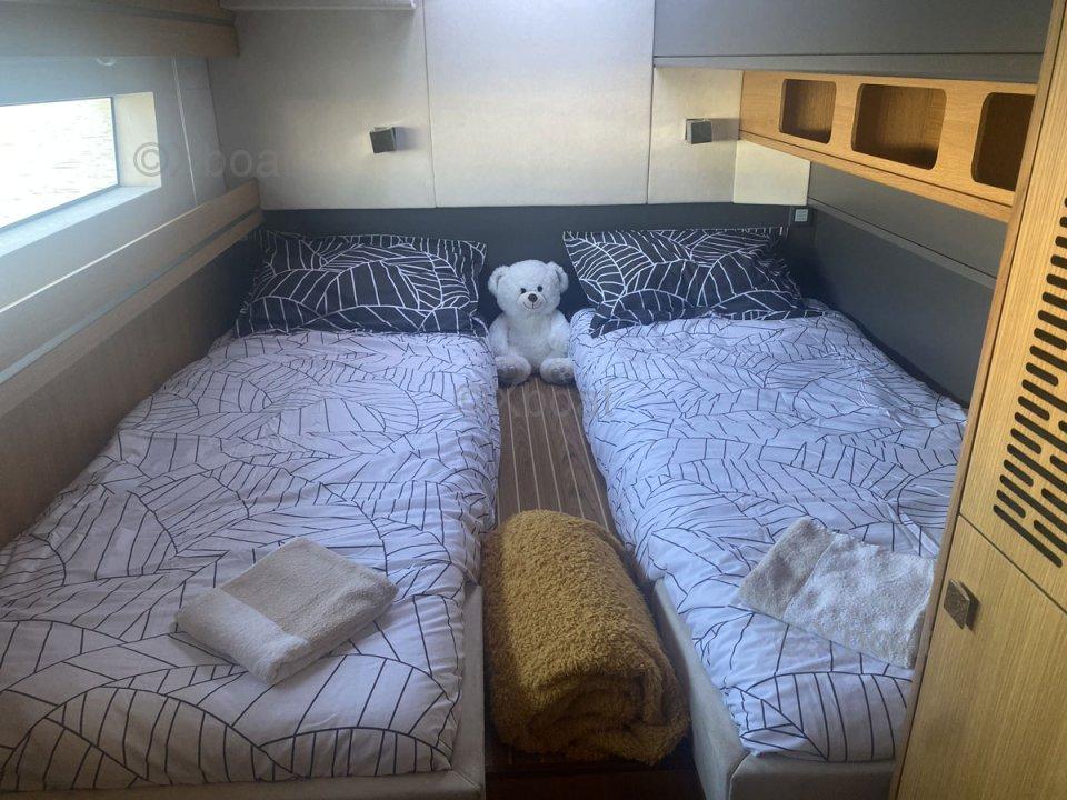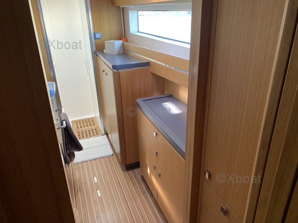 XBOAT ref :6202.Cette très belle version propriétaire du PRIVILEGE SERIE 5 en 4 cabines et 4 salles d'eau est raffinée et contemporaine avec ses menuiseries en chêne satiné et plancher rainuré. La cuisine en U est séparée du carré par un comptoir bar, la table à cartes est accessible facilement par la grande porte coulissante inox qui sépare du cockpit. La suite propriétaire centrale sur le rostre offre de beaux volumes avec un grande douche séparée ainsi que son toilette. Deux cabines doubles occupent l'arrière, tandis qu'une 4èm cabine sur babord avant fait souvent office de zone de stockage ...