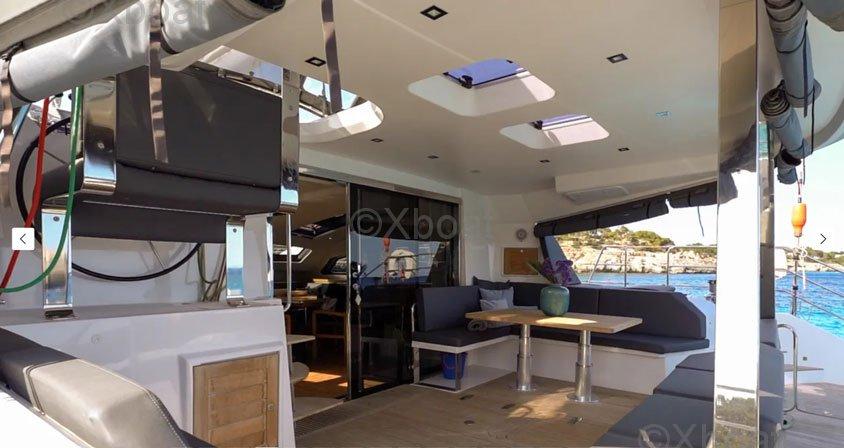Lattage teck pour le cockpit, 2 bossoirs alu laqués blancs sur l'arrière avec la plateforme fixe, les jupes confortables, le cockpit avec sa grande table télescopique et ses grandes banquettes attestent d'une belle finition et promettent un grand confort.