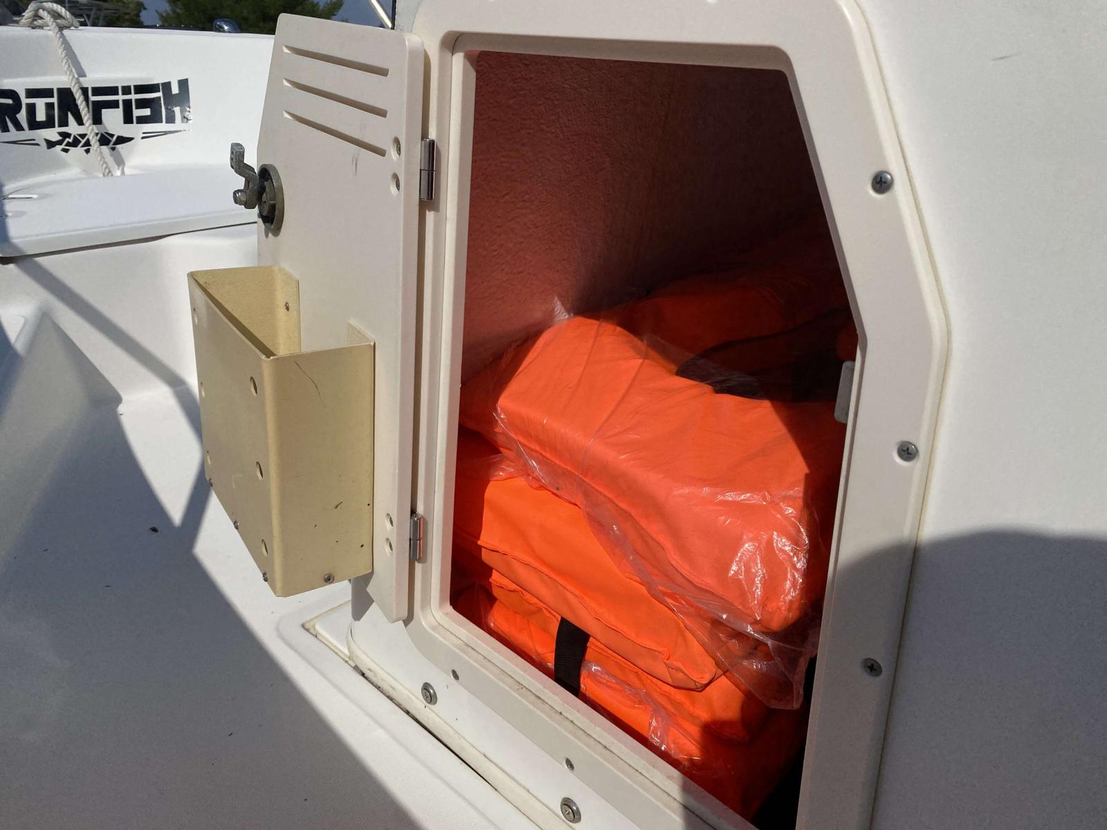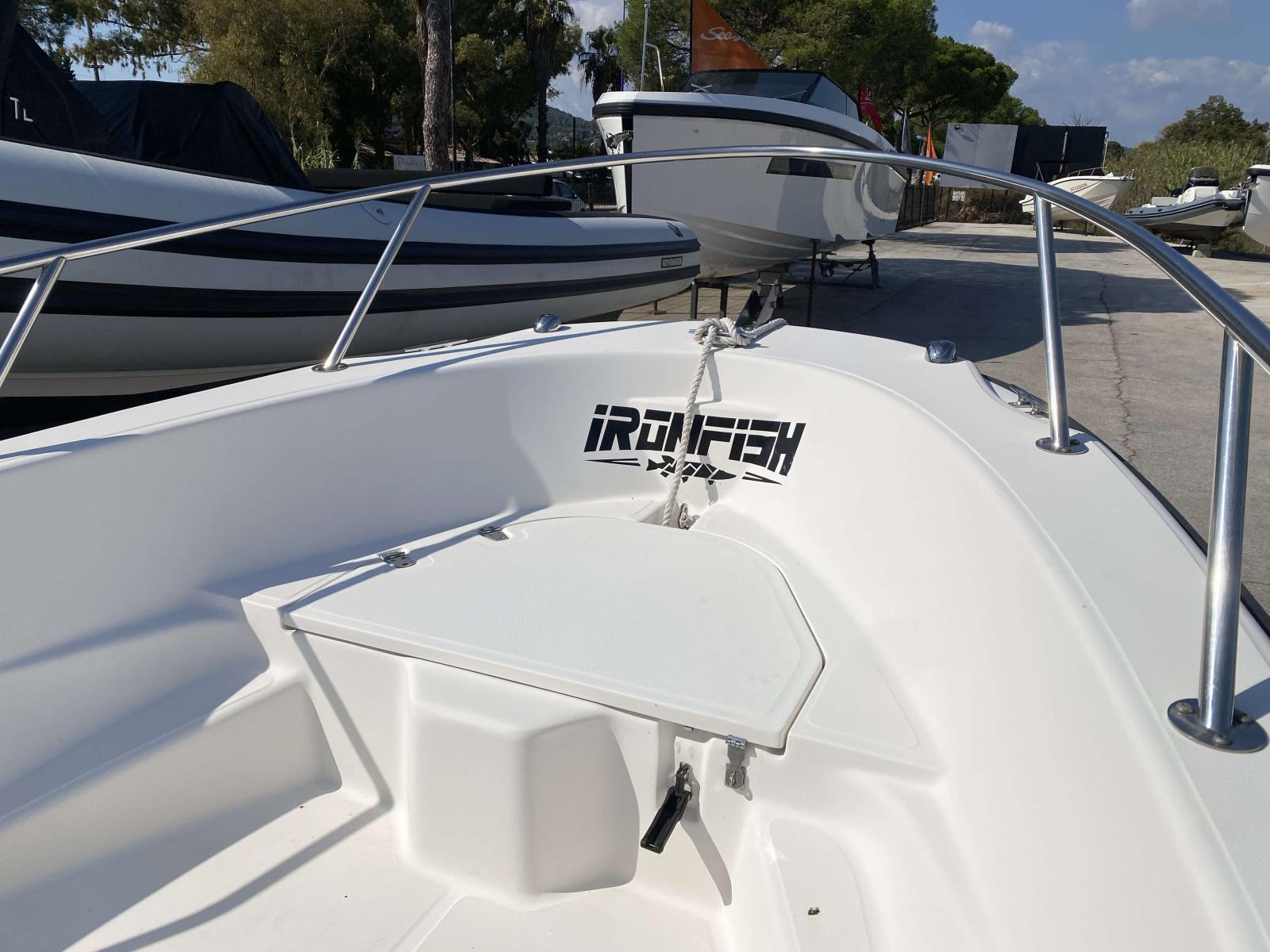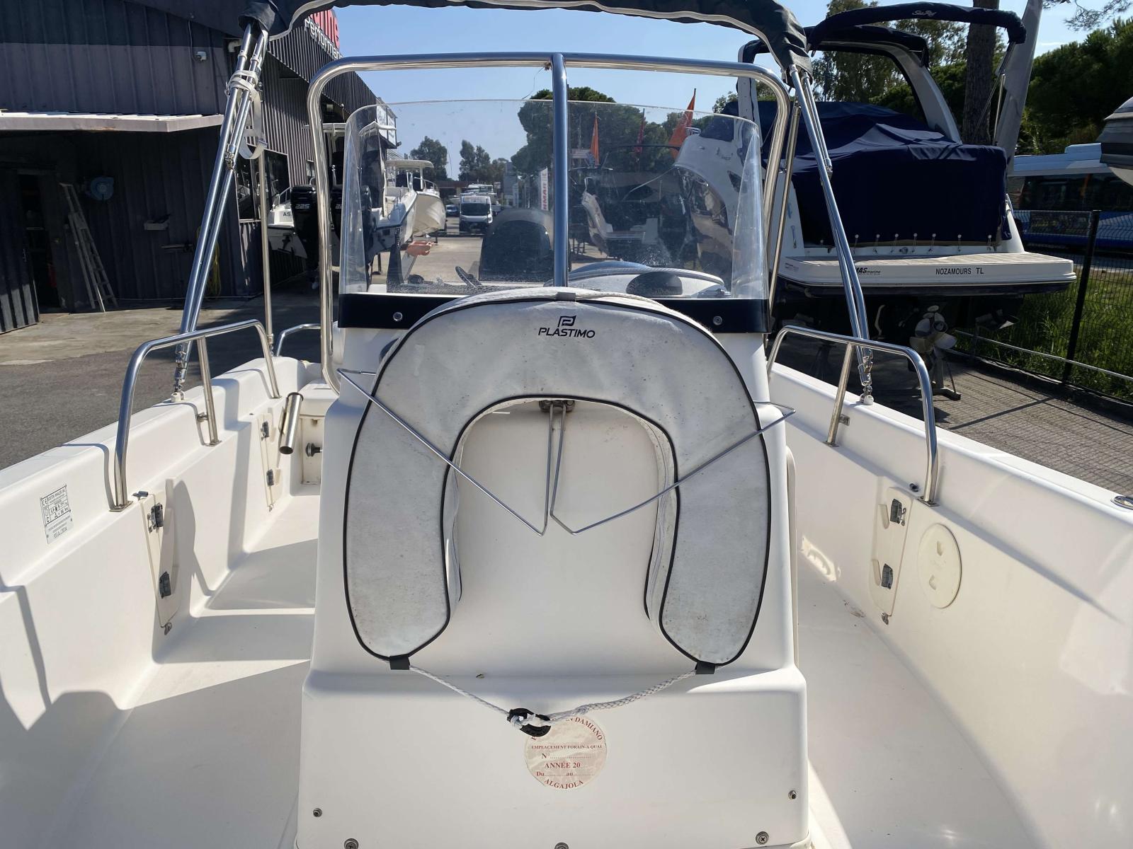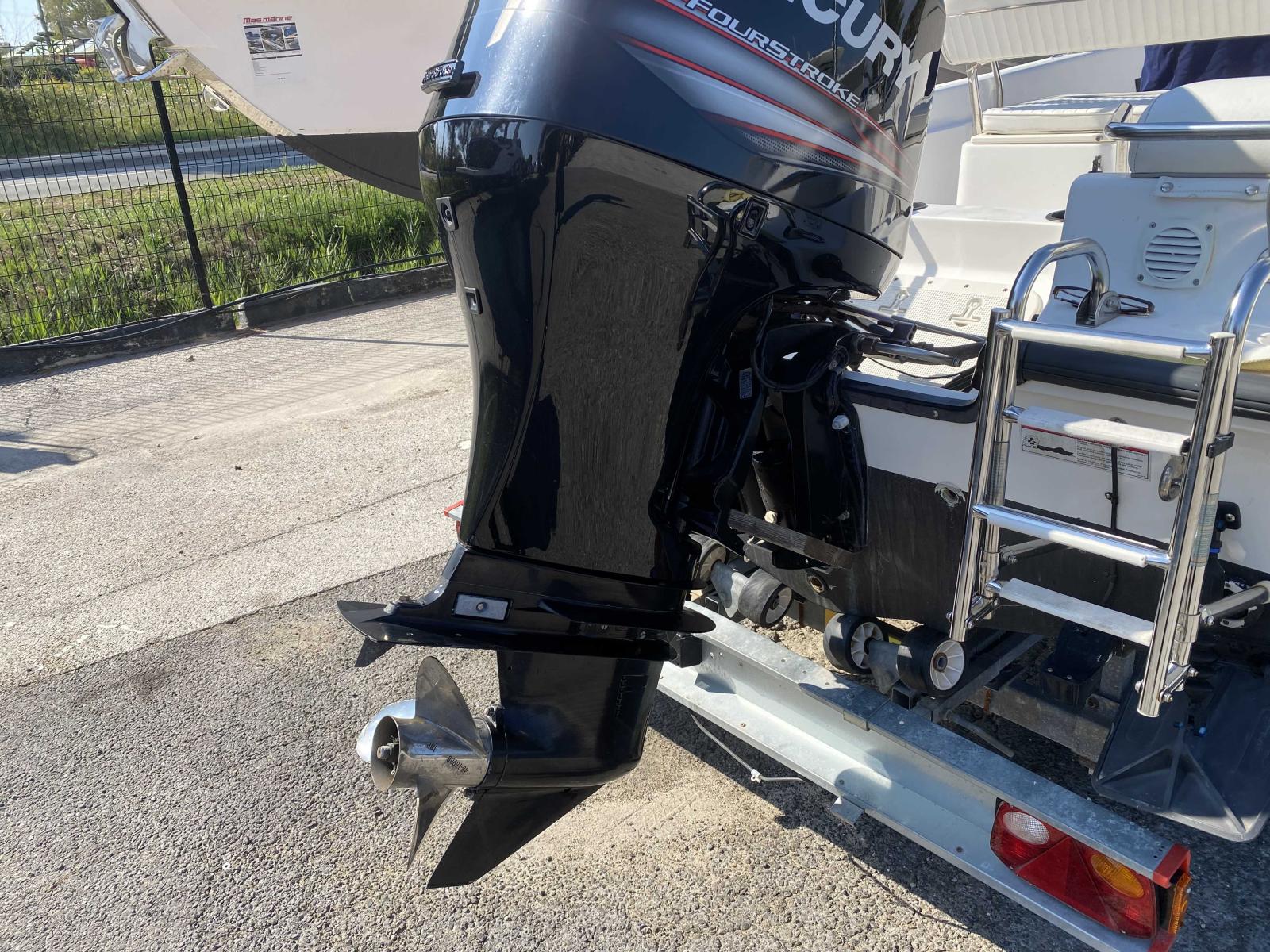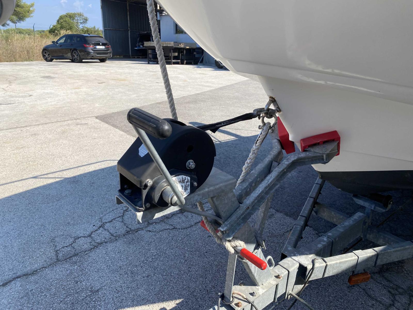 Couleurs : gel coat blanc. Taud bleu. Logos noirs