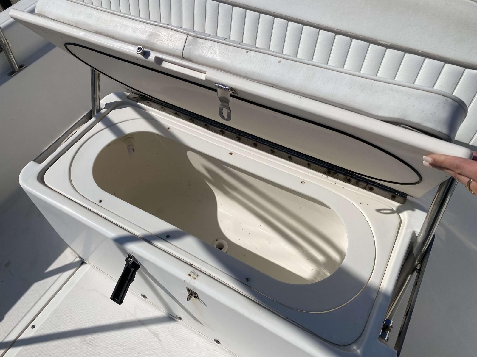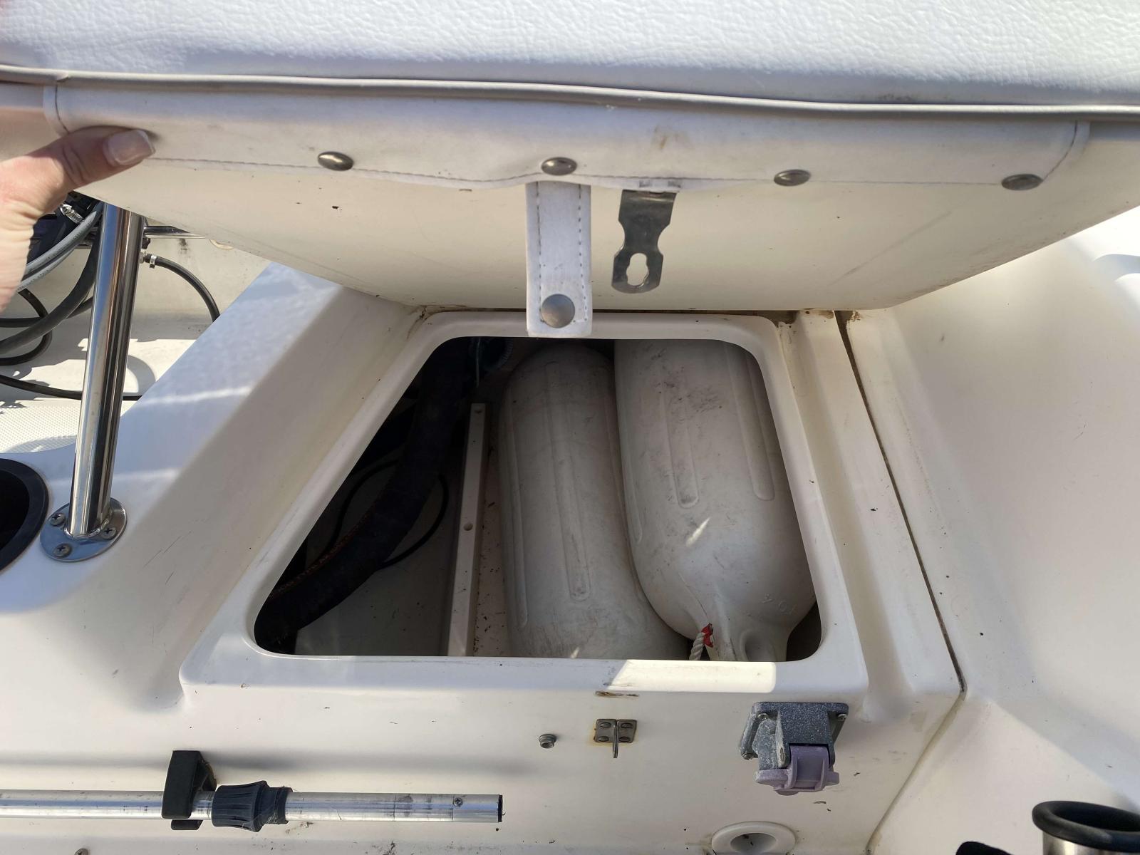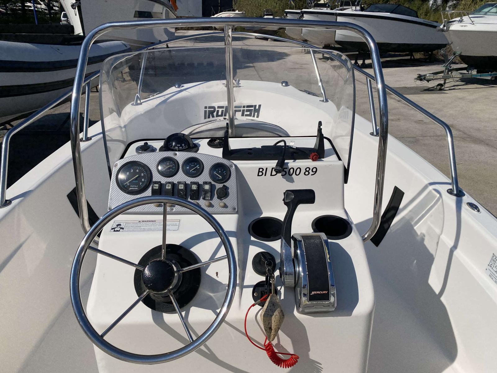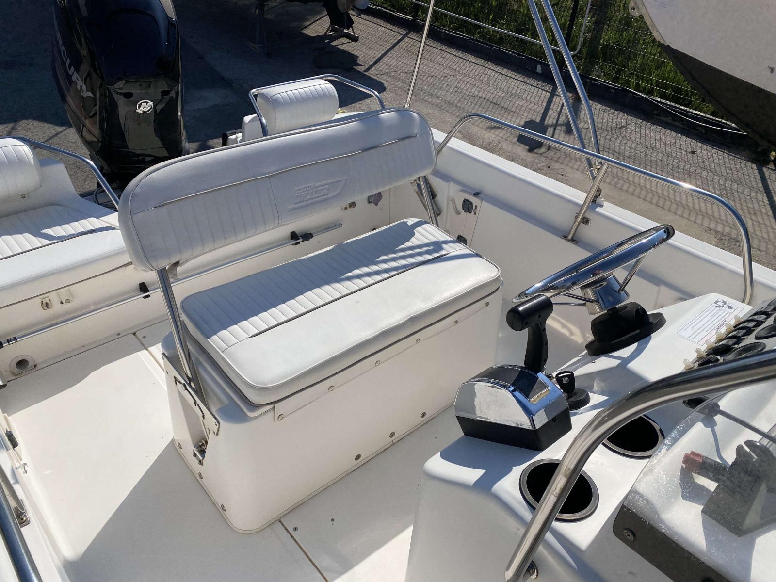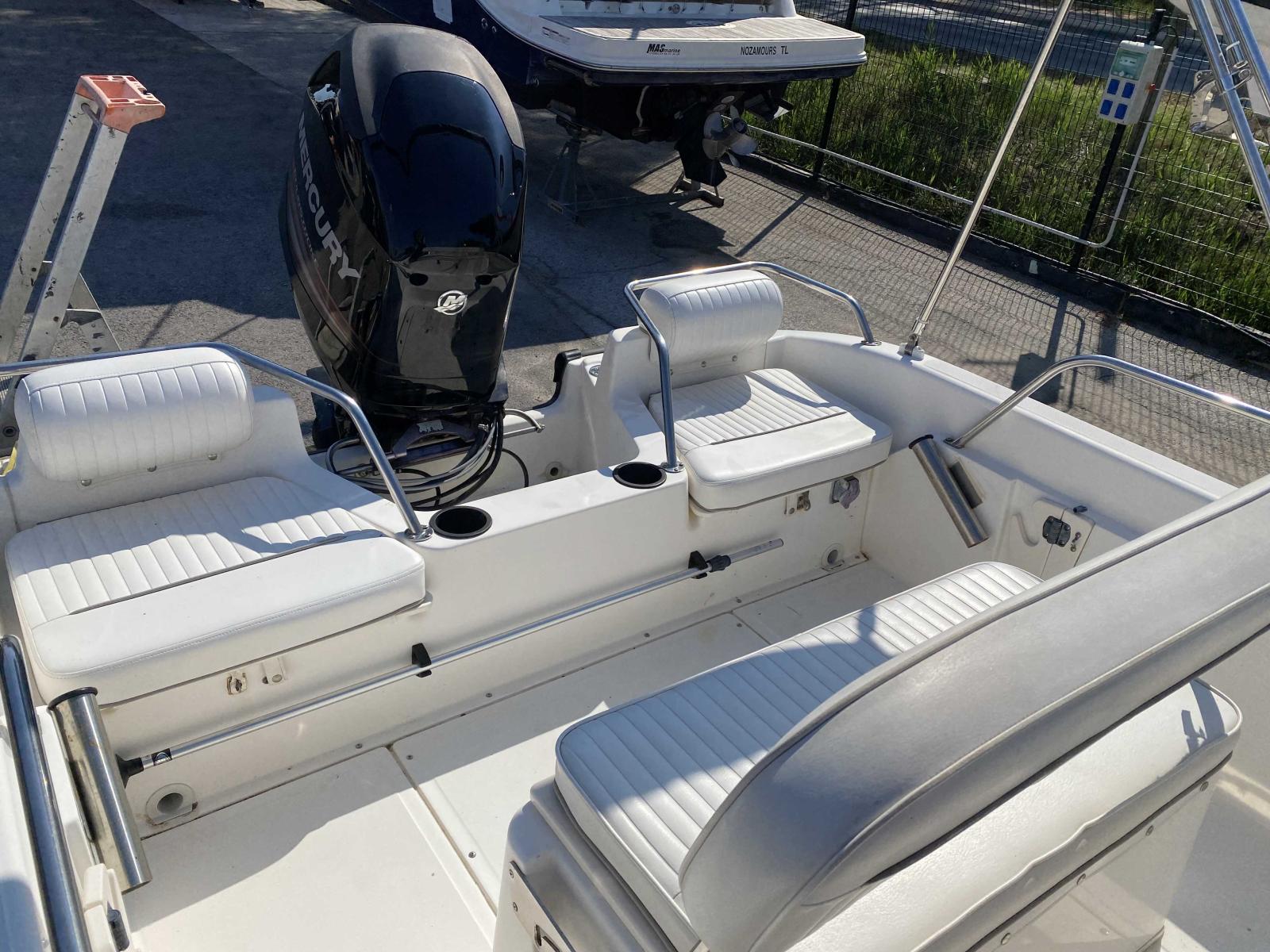 Couleurs : gel coat blanc. Taud bleu. Logos noirs
