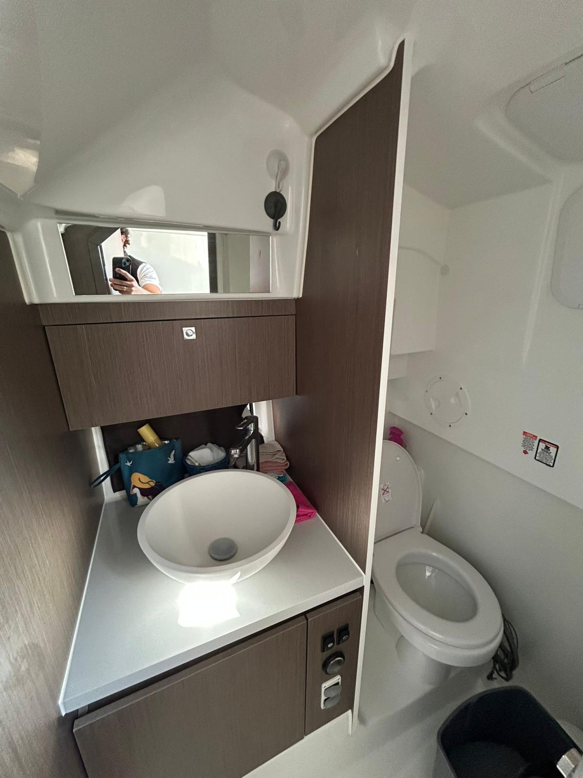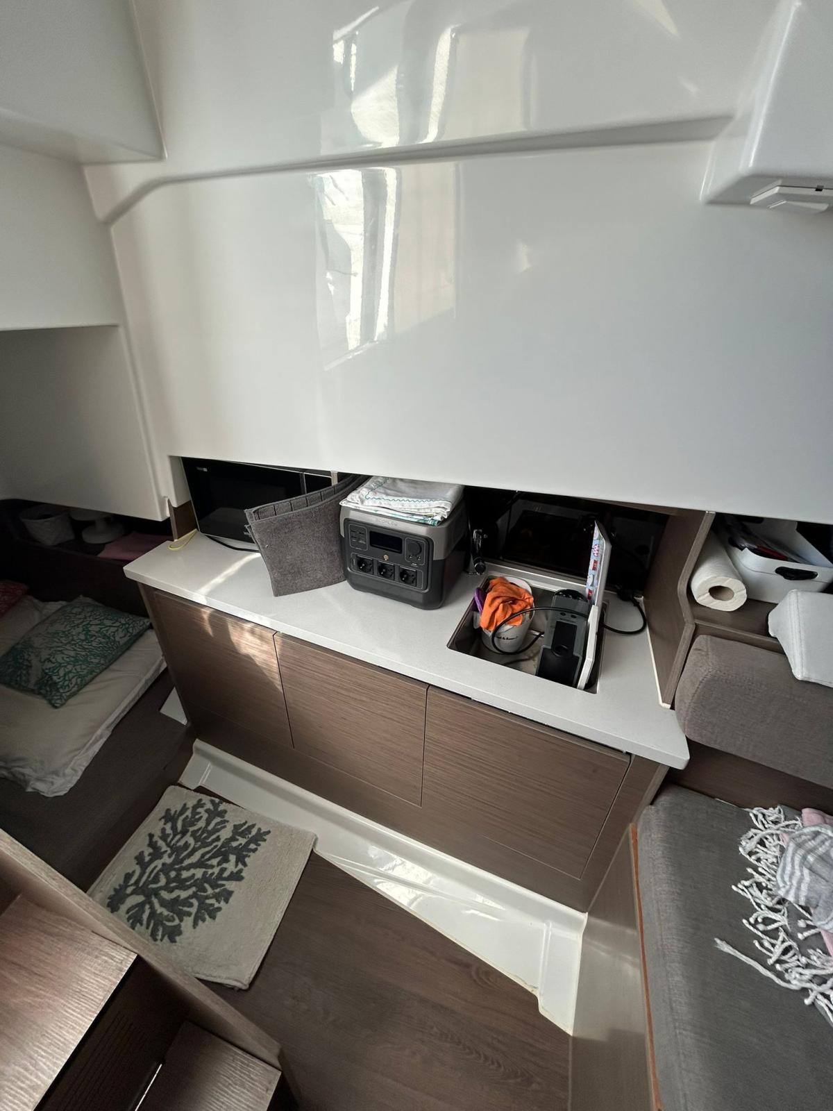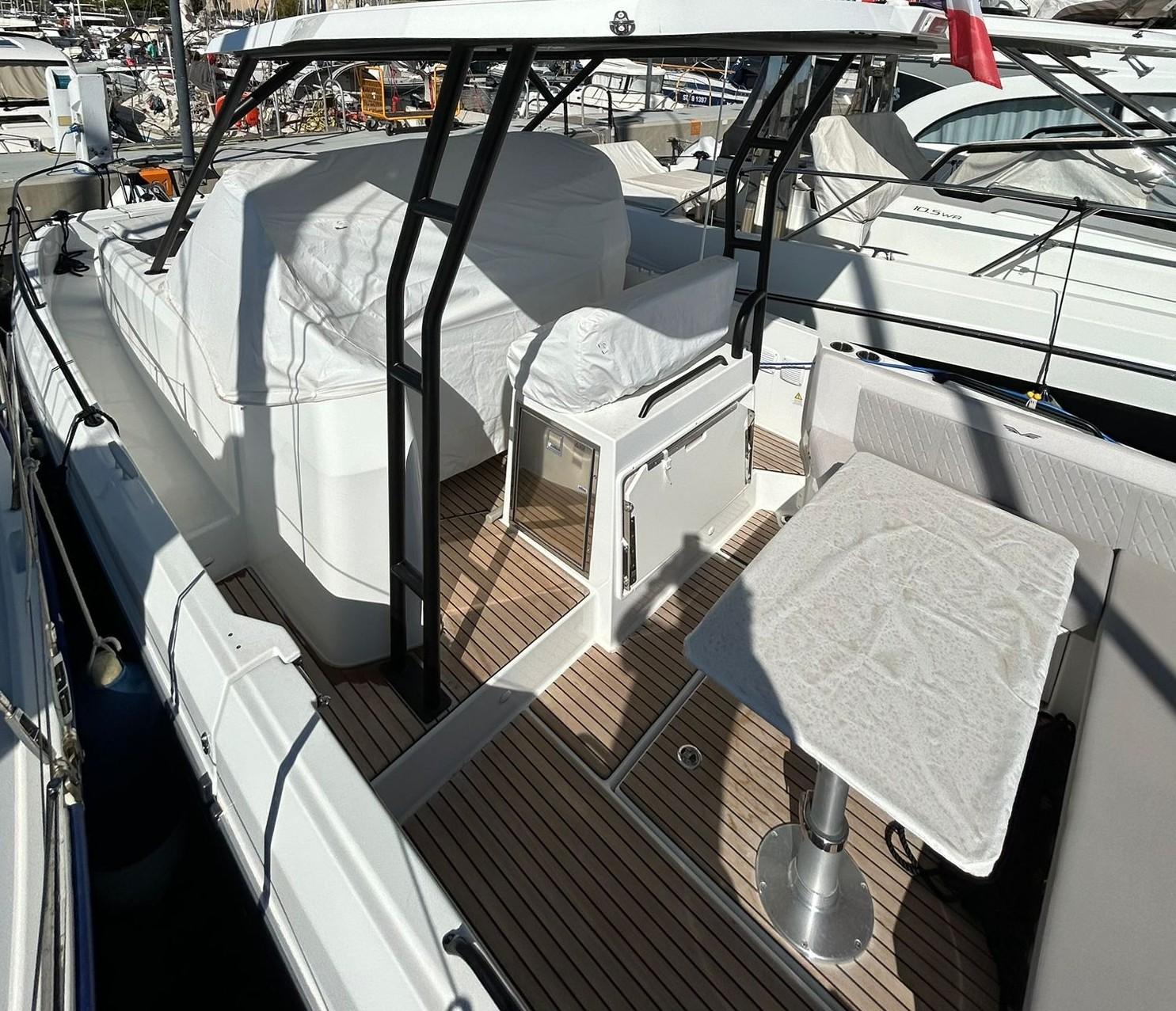 Banquette rabattable, table convertible en bain de soleil,Canopy avant , Cockpit en teck, WC électrique avec salle d’eau et douche séparée, Terrasse latérale bâbord pour baignade et détente