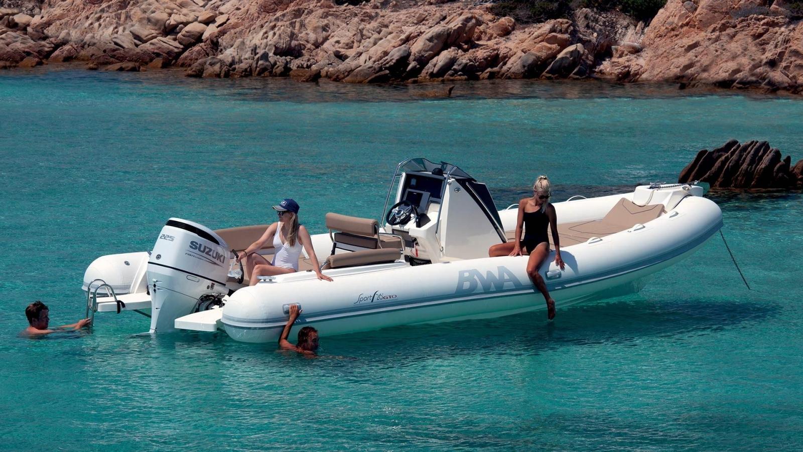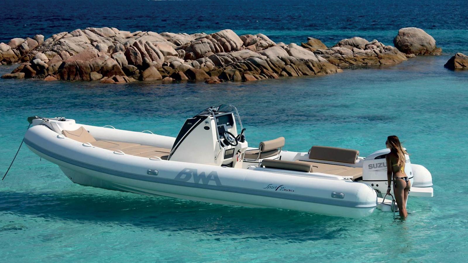 BWA Sport 26 GTO, grâce à une carène sûre et rapide qui est le résultat d'années de recherche et de développement, est un semi-rigide pratique, élégant et confortable, idéal pour passer des journées entières de détente en famille et entre amis en toute sécurité. Grands espaces modulaires et ergonomiques, incroyable capacité de stockage, le 26 GTO offre la possibilité d'installer un WC nautique dans la console moderne.