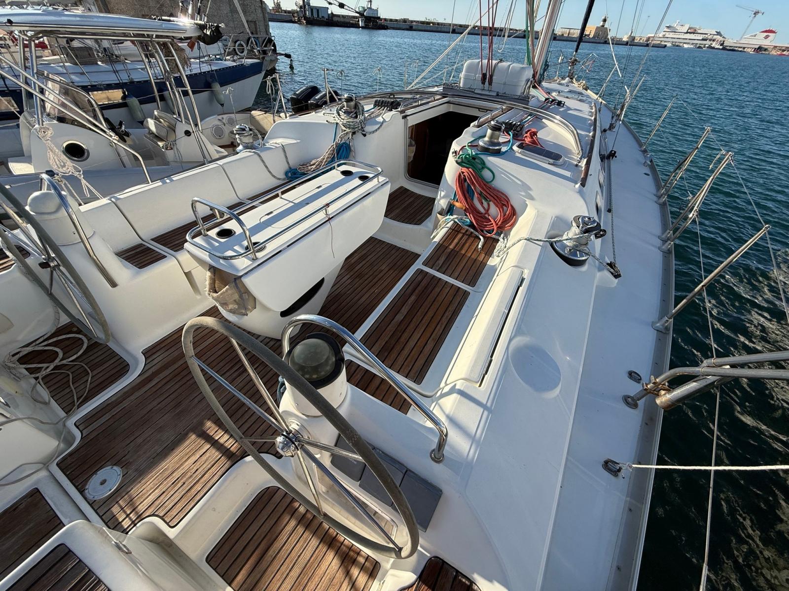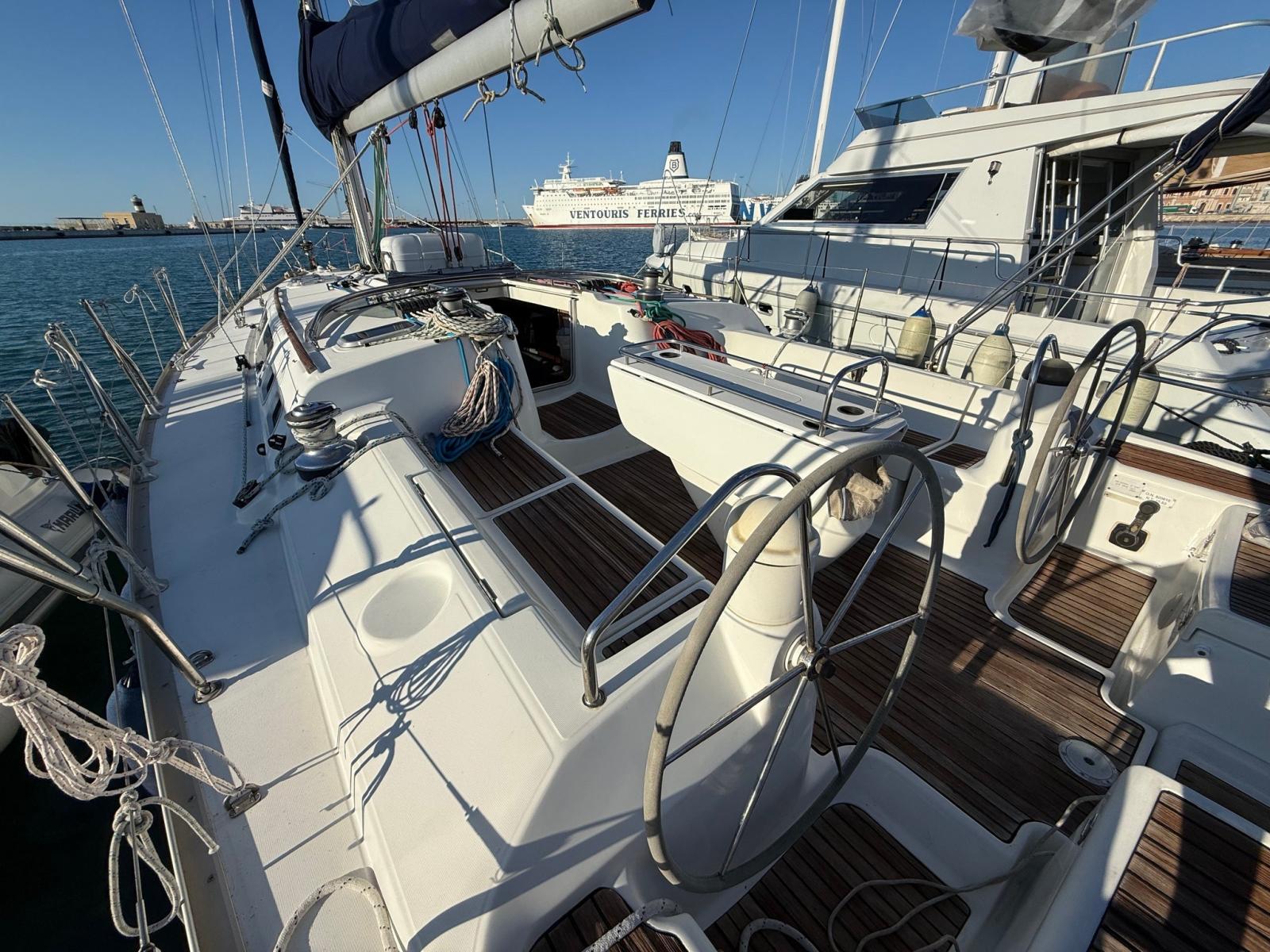 Eau sous pression, Batteries (4 x 105AH), Douche de cockpit, Double barre à roue, Défenses, Passerelle, Porte latérale, Cockpit en teck, Prise de quai, Gréement monotoron, Echelle de bain, table de cockpit, Winch (4).
