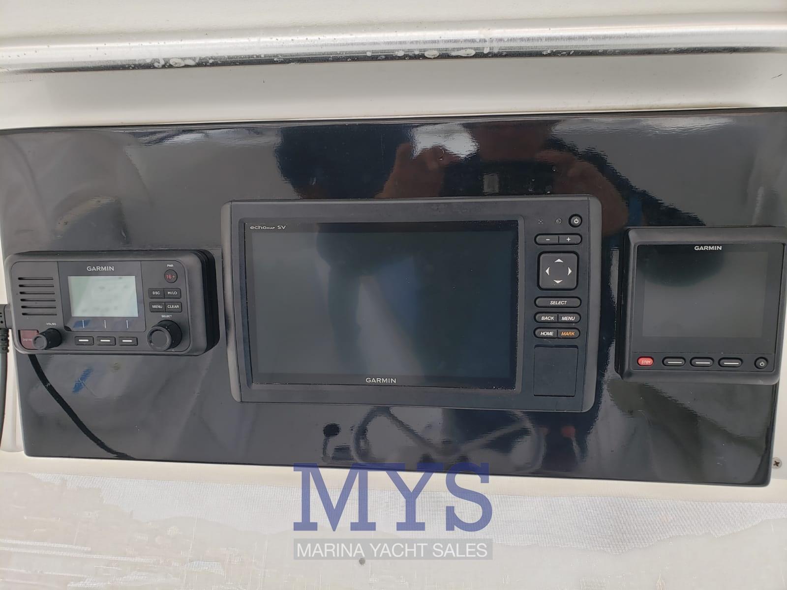 Indicateur d'angle de barre, DSC VHF, 2 Sondeur pêche (Garmin GPSMAP 2023), 3 GPS (GARMIN GPSMAP + ECHOMAP), Cartes et guides, Pilote automatique (Garmin 2023), Panneau de commande, Radio VHF (GARMIN 2023).