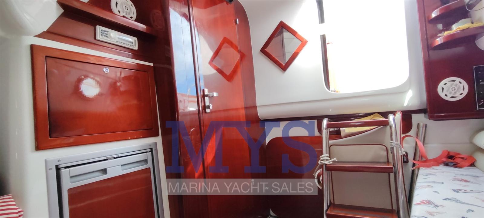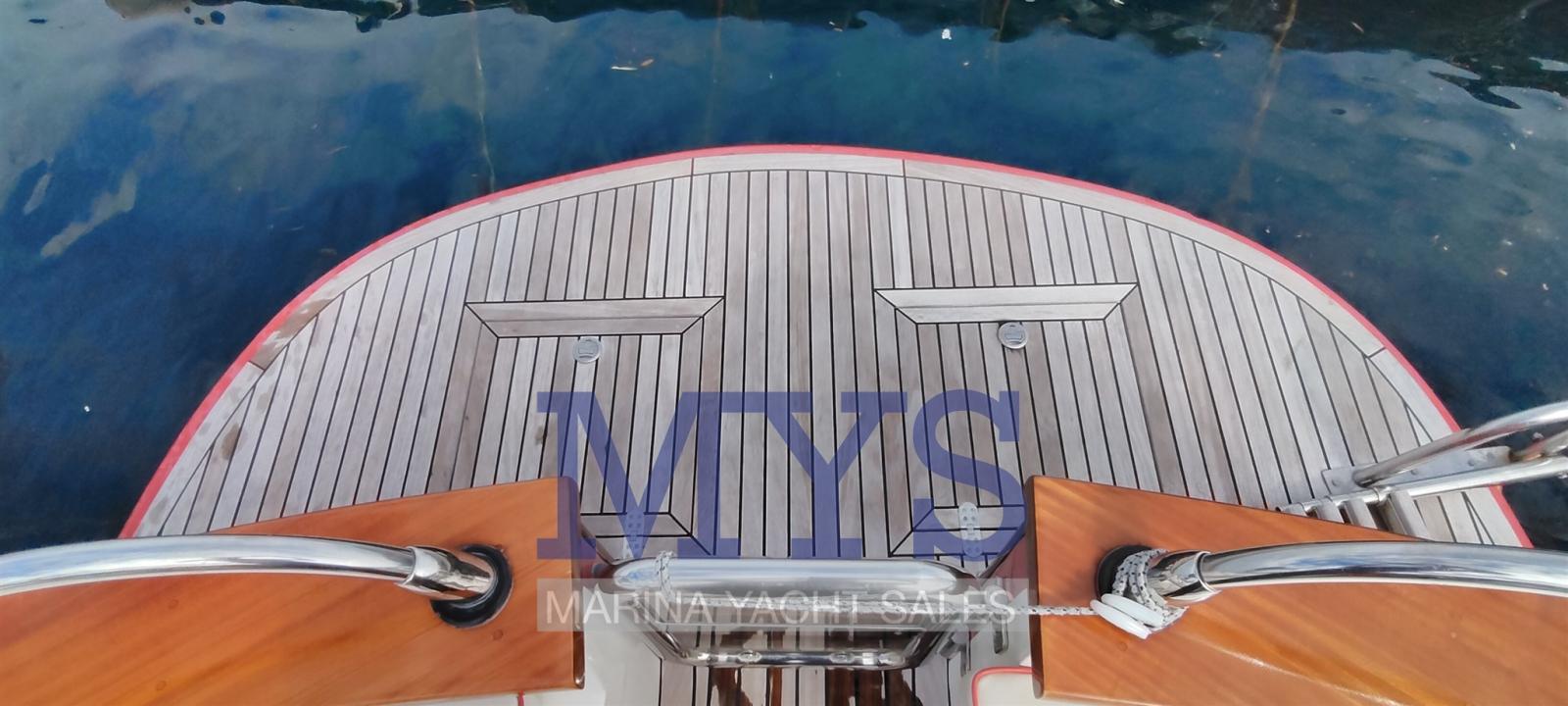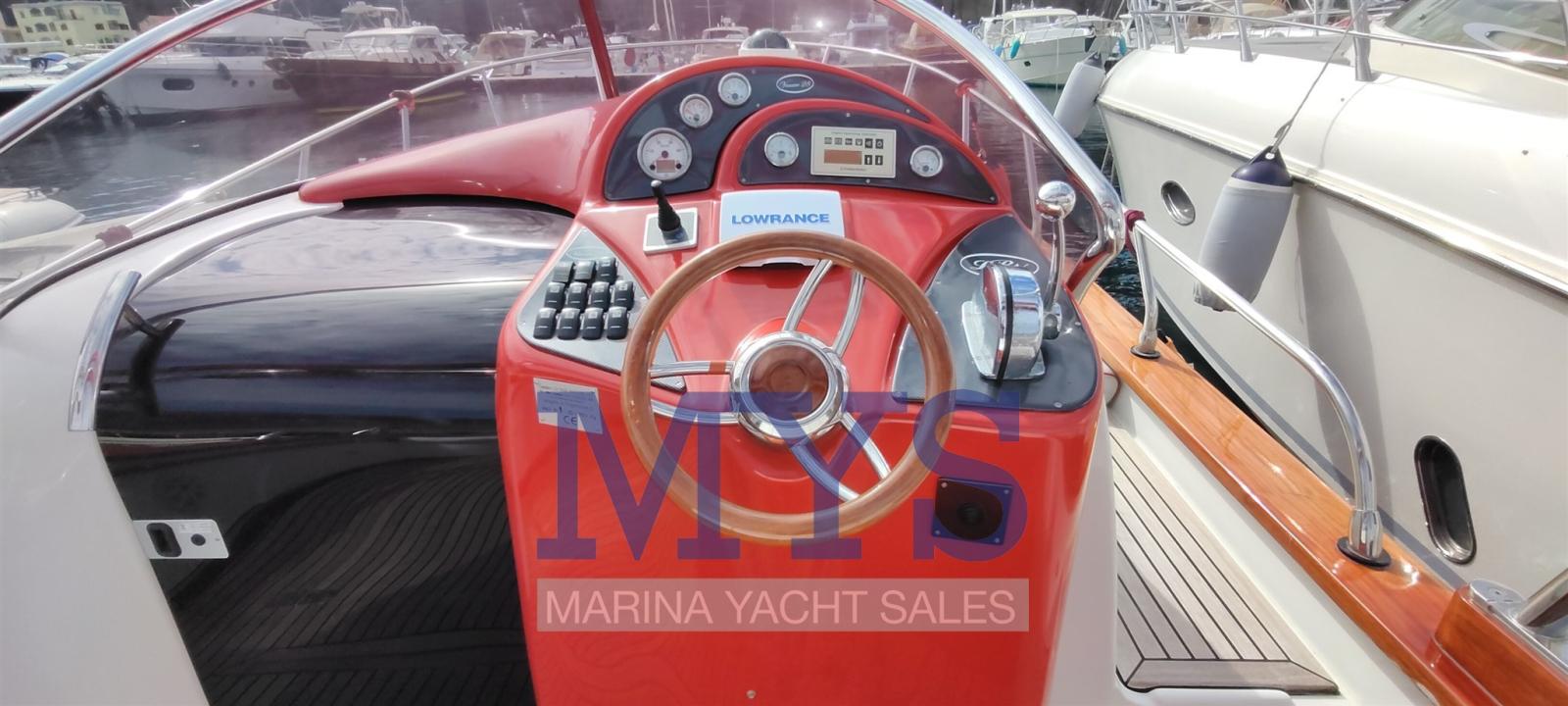 Alarme moteur, Ouverture du compartiment moteur électrique, Eau sous pression, Passavant en teck, Câble d’alimentation à quai, Couleur spéciale (rosso), Douche de cockpit, Lavabo dans le cockpit, Éclairage de courtoisie, Défenses, Plateforme arrière, Pompe de cale automatique, Porte latérale, Cockpit en teck, Prise de quai, Rollbar, Guindeau électrique, Echelle de bain, table de cockpit, Corne.