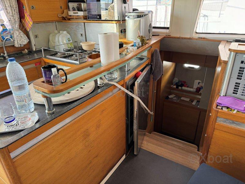 Côté équipement, il satisfait les besoins de grande croisière avec groupe, dessalinisteur, panneaux solaires, frigo et congélateur, ice maker et un électronique complet avec irridium, etc. Les 2 moteurs volvo de 75 cv permettent une consommation raisonnable de 4,5L/H chacun à 7 noeuds.