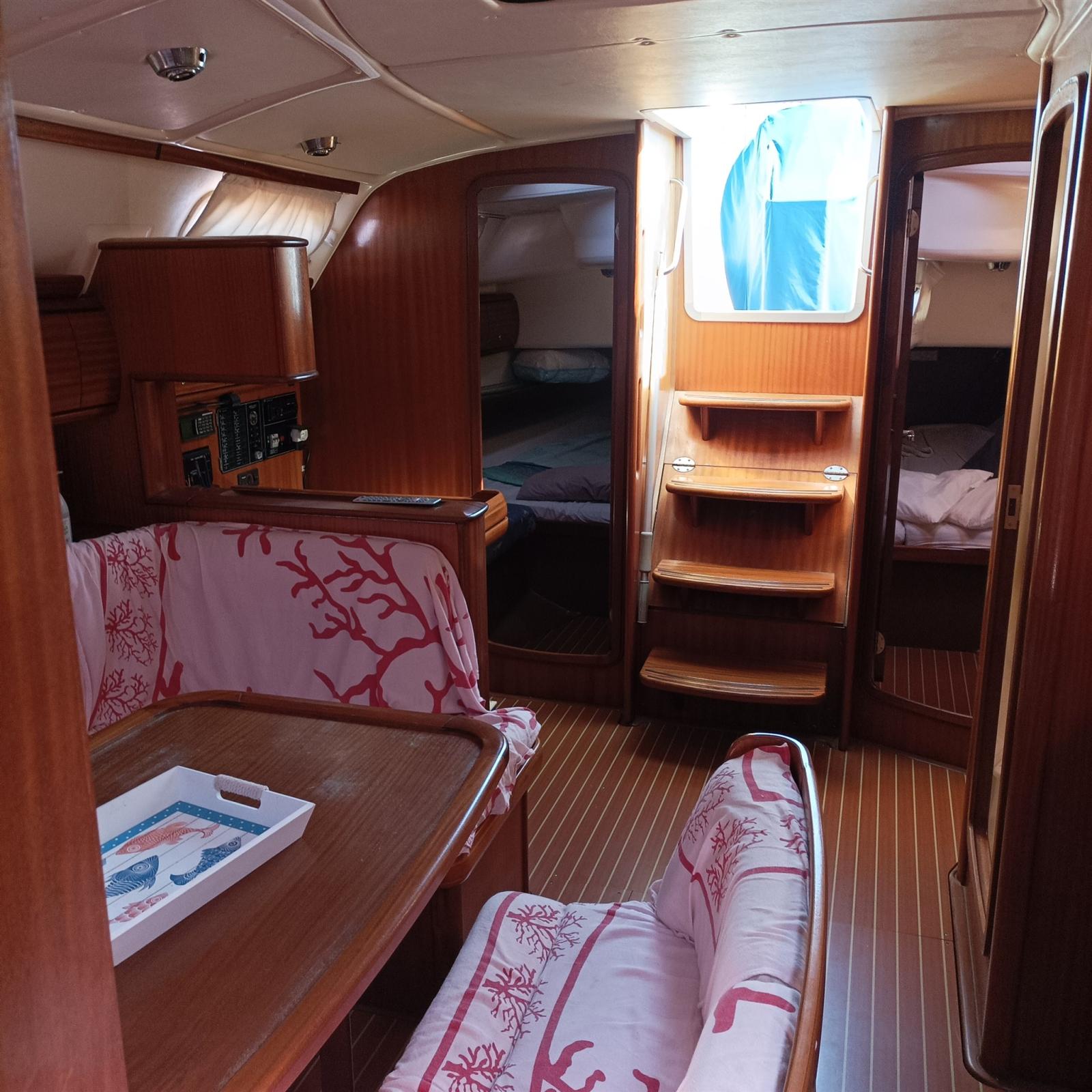 Alarme moteur, Eau sous pression, 3 Batteries (2 servizi 1 avviamento), Douche de cockpit, Passerelle, Pompe de cale manuelle, Prise de quai, Onduleur, Guindeau électrique, Gréement monotoron, Chaise support HB, Annexe (+ Suzuky 2,5 HP), 4 Winch (ST Harken), Windex.