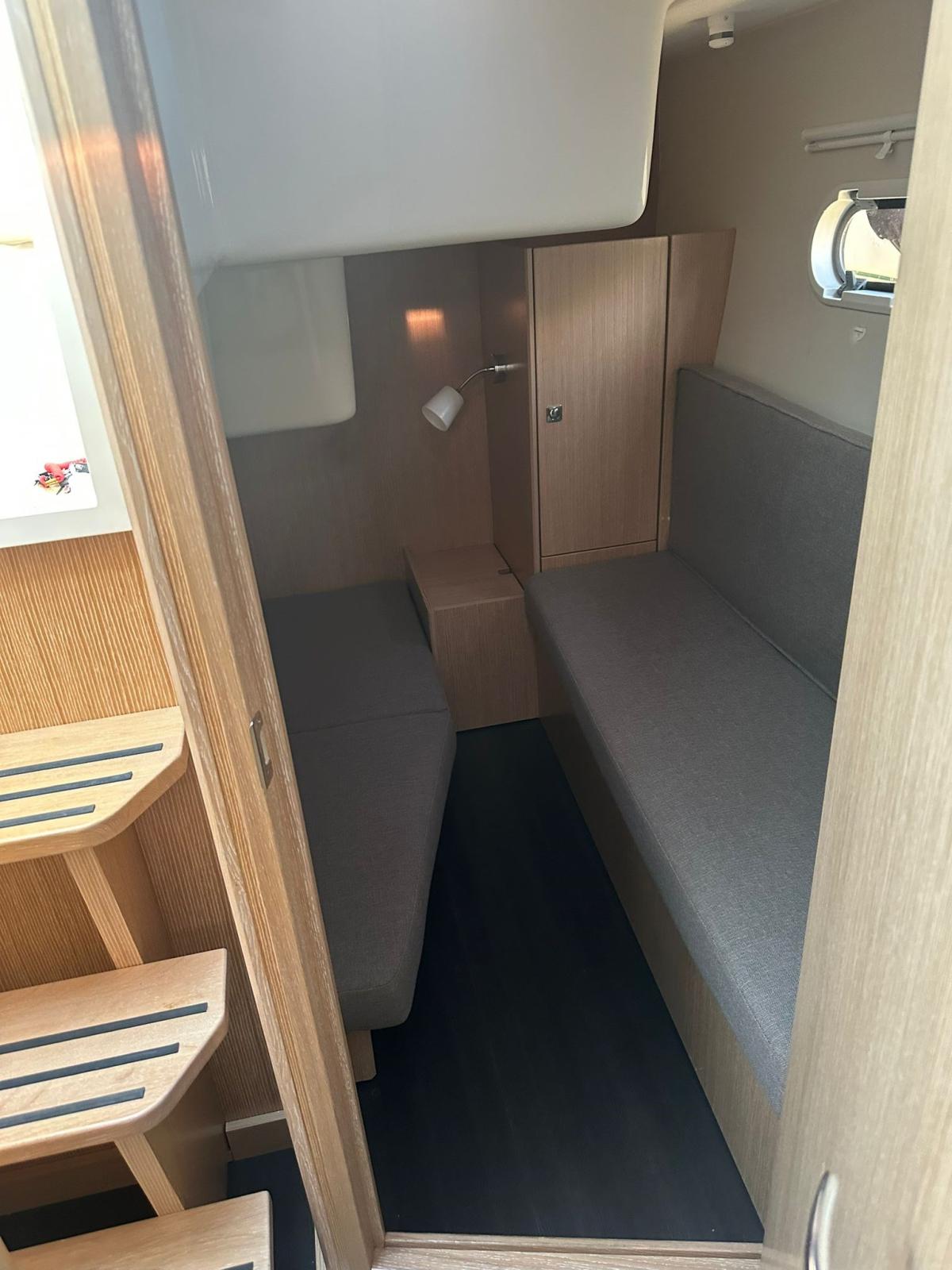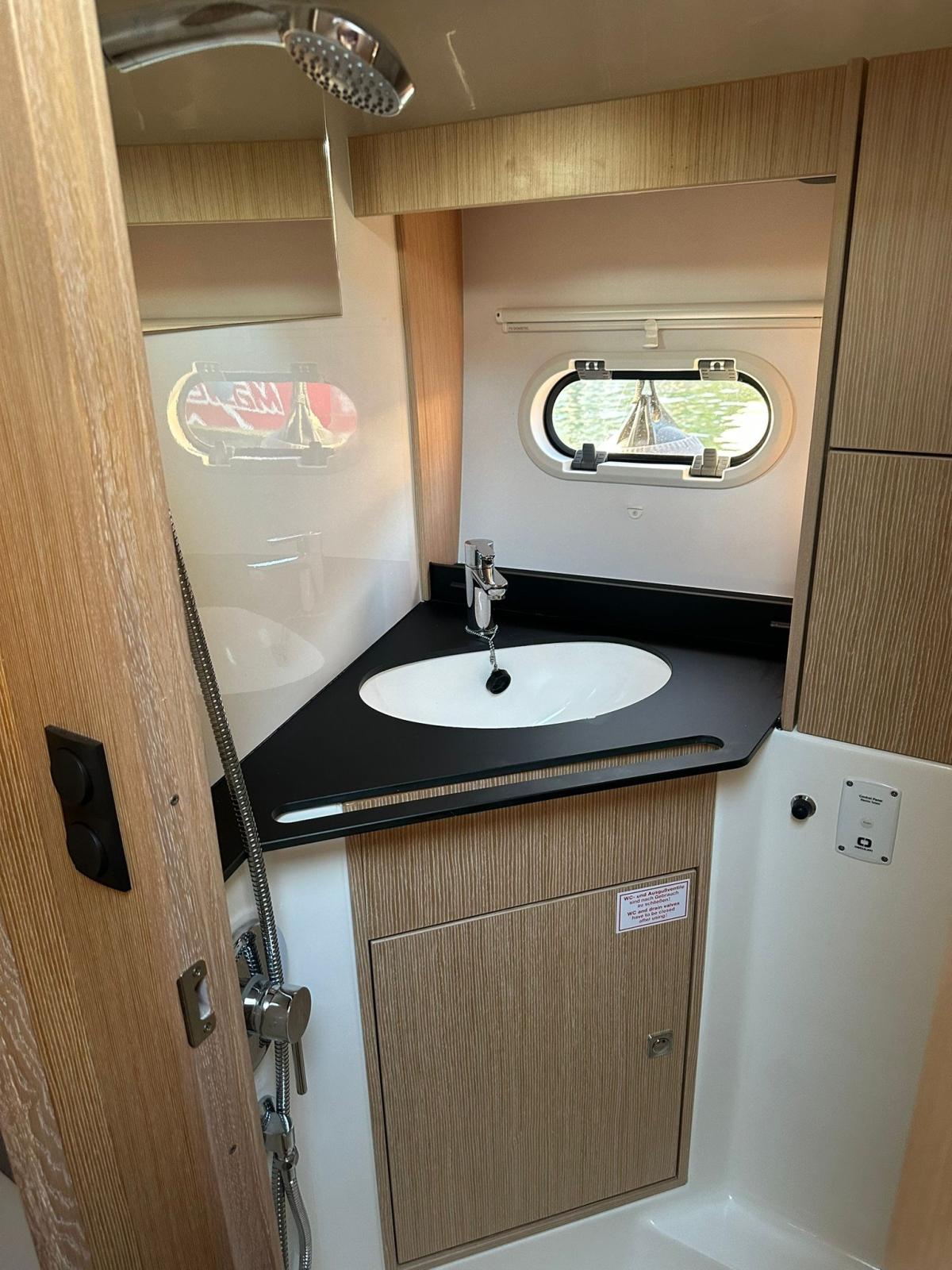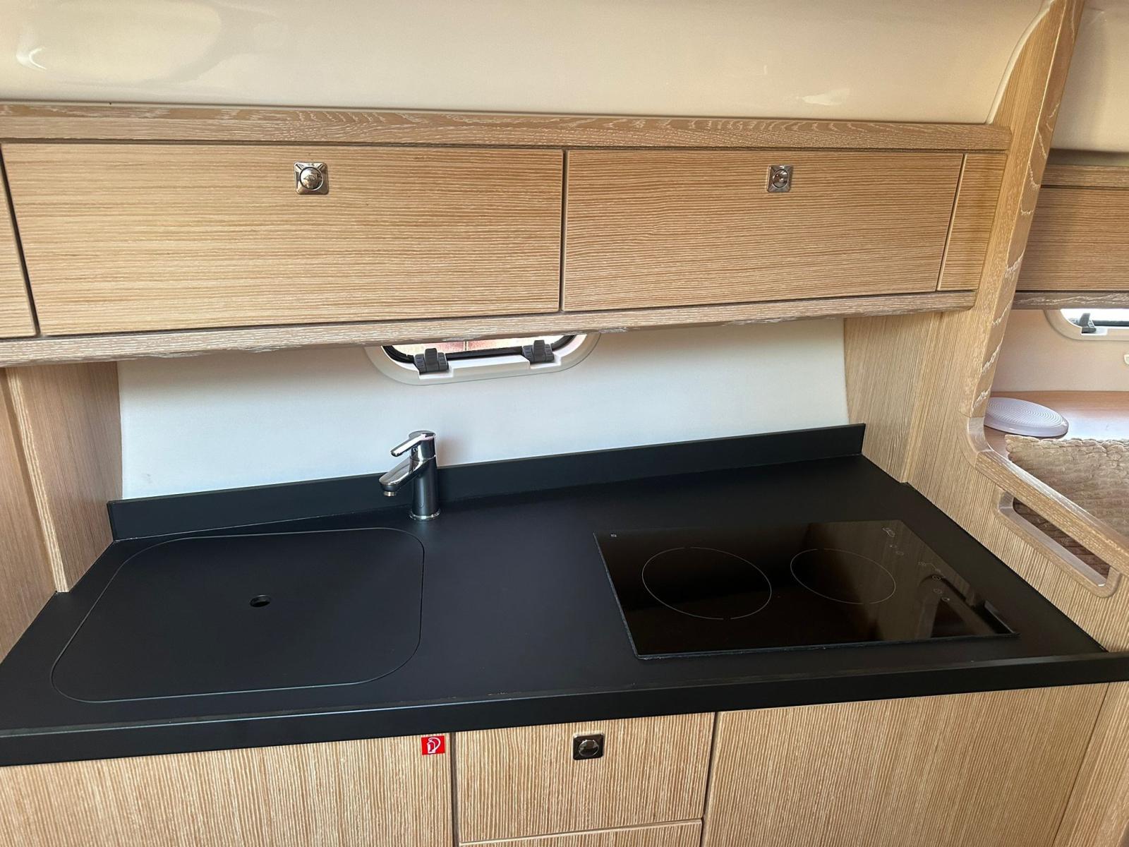 Alarme moteur, Ouverture du compartiment moteur électrique, Eau sous pression, Douche de cockpit, Flaps électriques, Extincteur(s) fixe(s), Lavabo dans le cockpit, Éclairage de courtoisie, Spots sous-marins, Défenses, Plateforme arrière, Cockpit en teck, Prise de quai, Rollbar, Guindeau électrique, Echelle de bain, table de cockpit, Table pliante de salon, Corne.