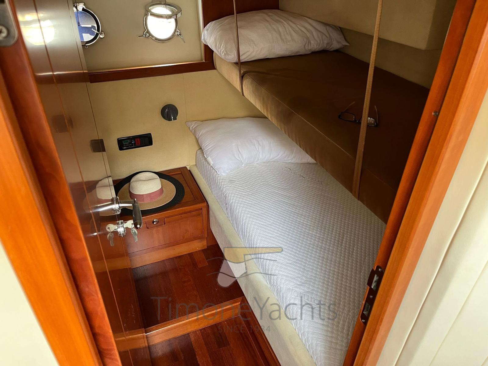 Du chantier naval de Pietà de qualité supérieure, toit rigide 58 exceptionnel en tout, cockpit très généreux équipé de tous les conforts, sur le pont inférieur une autre cuisine et une autre table à manger pour 8 personnes, 3 grandes cabines avec trois salles de bains, 1 cabine arrière pour l’équipage ou les invités (IL EST POSSIBLE DE TRANSFORMER LES 2 LITS SUPERPOSÉS EN LITS DOUBLES POUR LES INVITÉS).