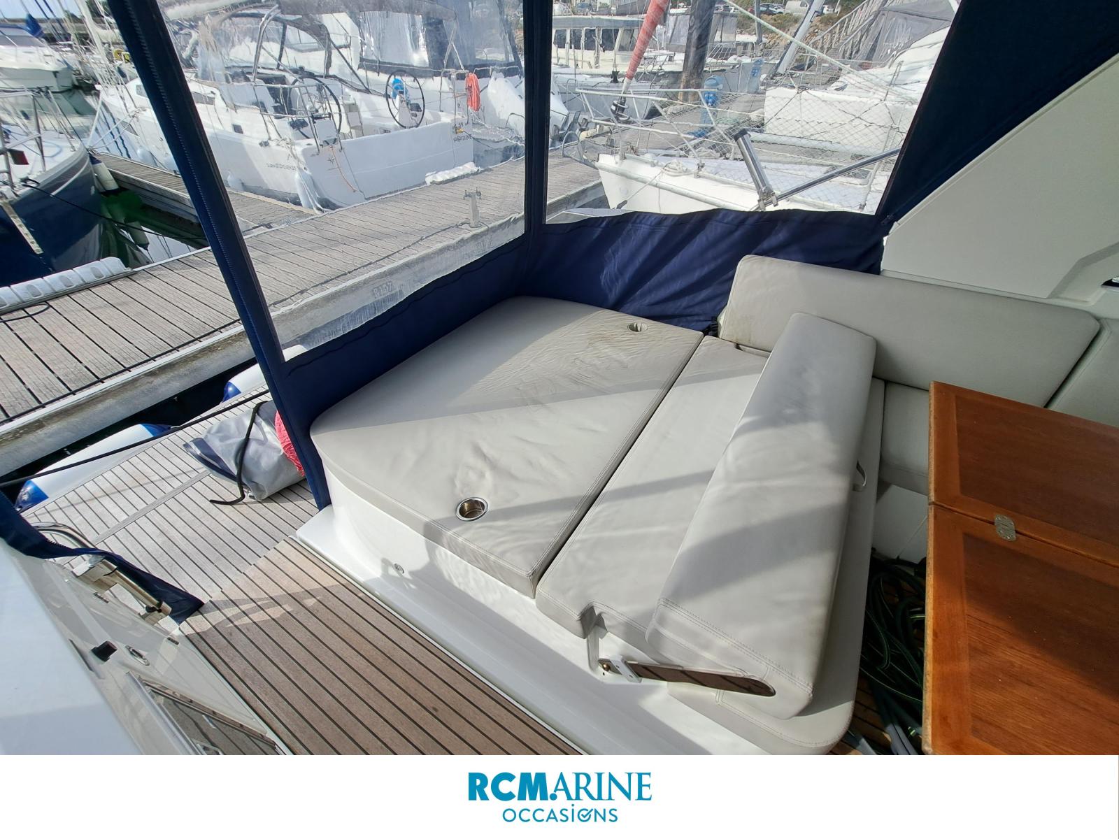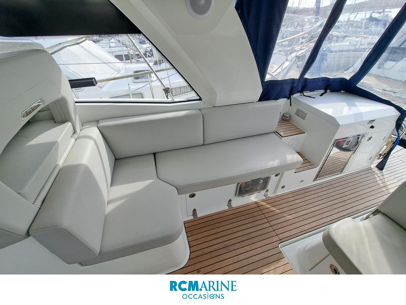Le Gran Turismo 36 a tout pour plaire : bain de soleil avant, bain de soleil arrière, une cuisine extérieur avec plancha, deux cabines doubles, toit ouvrant électrique, un joystick pour faciliter les manoeuvres au port.