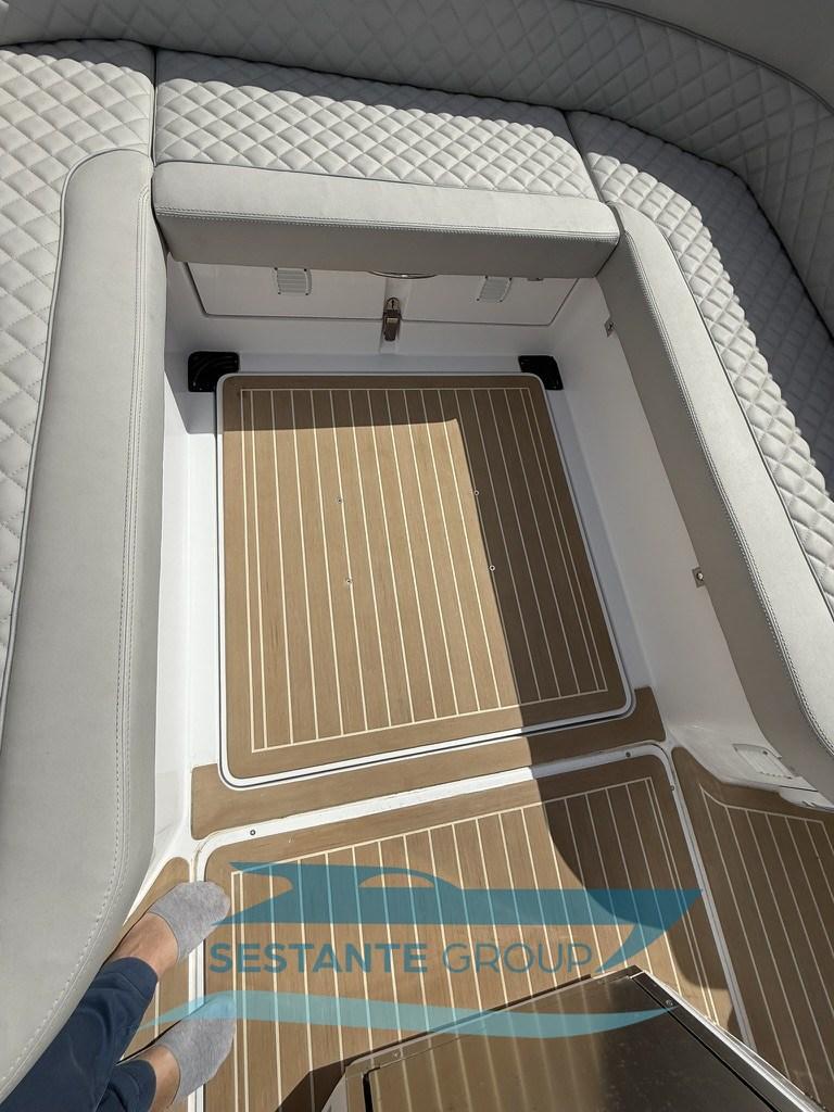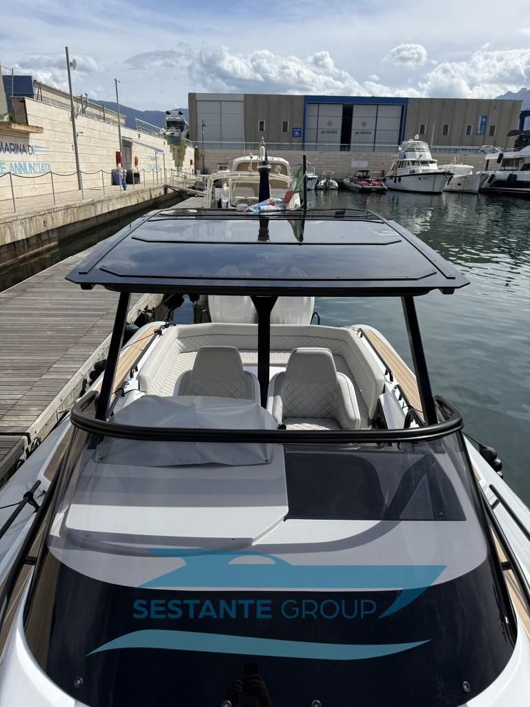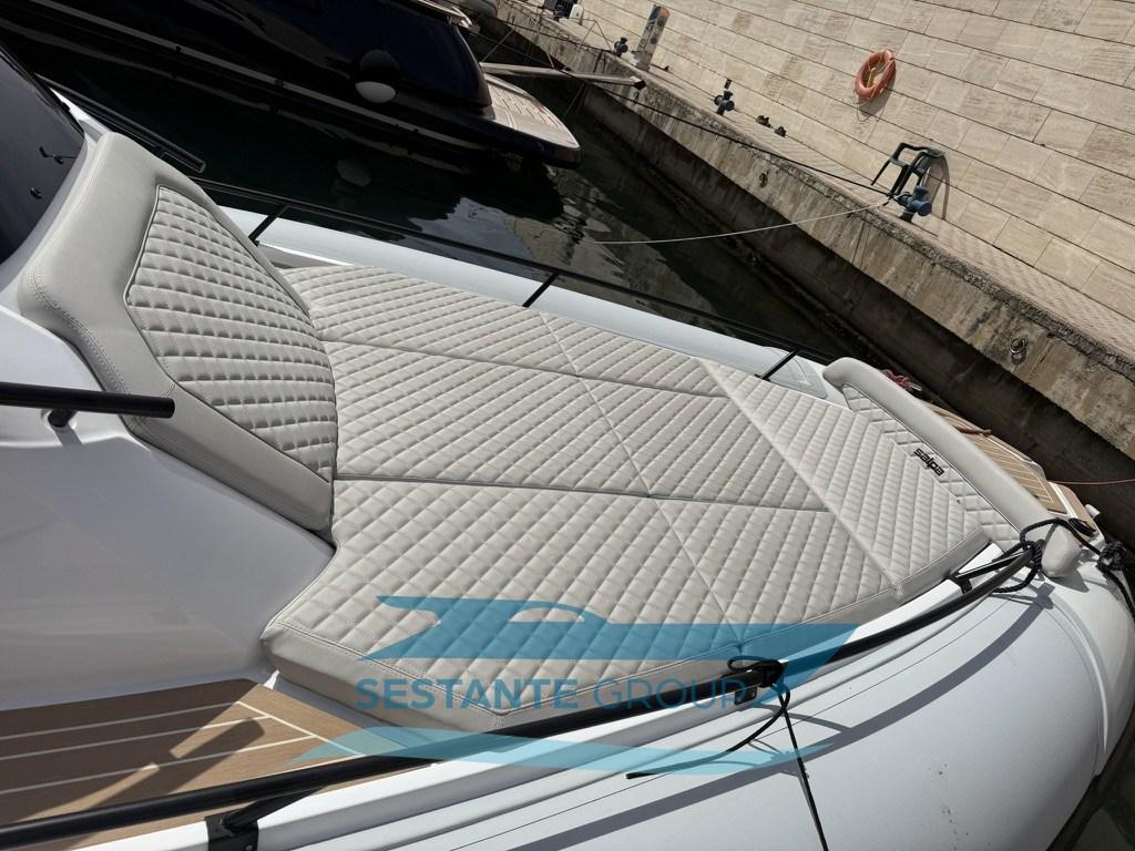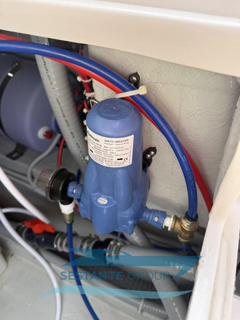 Alarme moteur, Alternateur, Eau sous pression, Taquets pliants, Passavant en teck, Filères, Douche de cockpit, Fixation de l’ancre, Lavabo dans le cockpit, Éclairage de courtoisie, Défenses, 2 Plateforme arrière, Pompe de cale automatique, Pont en teck, Cockpit en teck, Prise de quai, Guindeau électrique, Echelle de bain, Table (elettrico), Corne, T-Top.