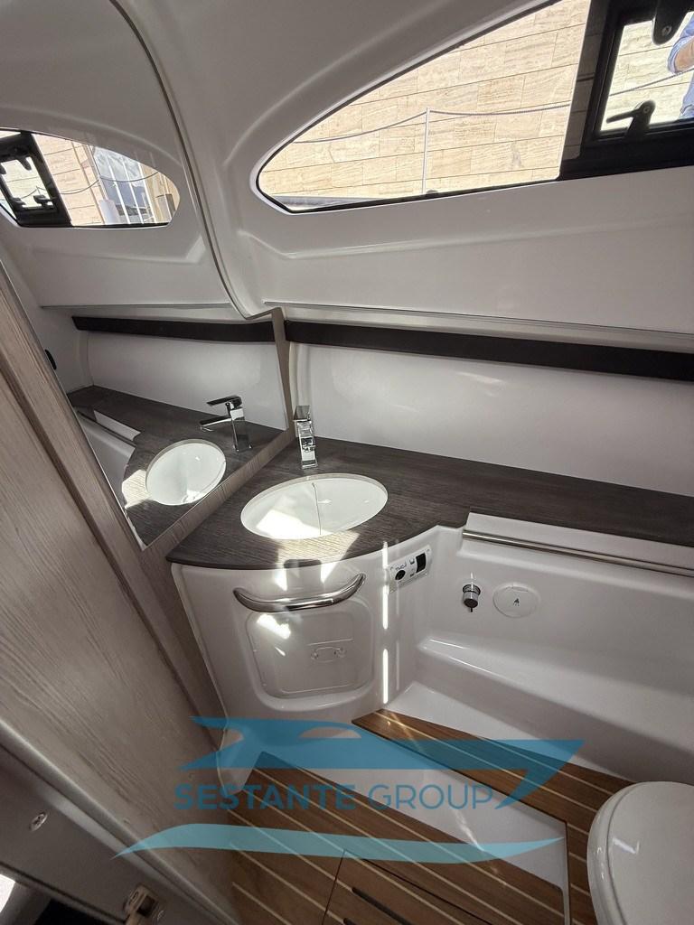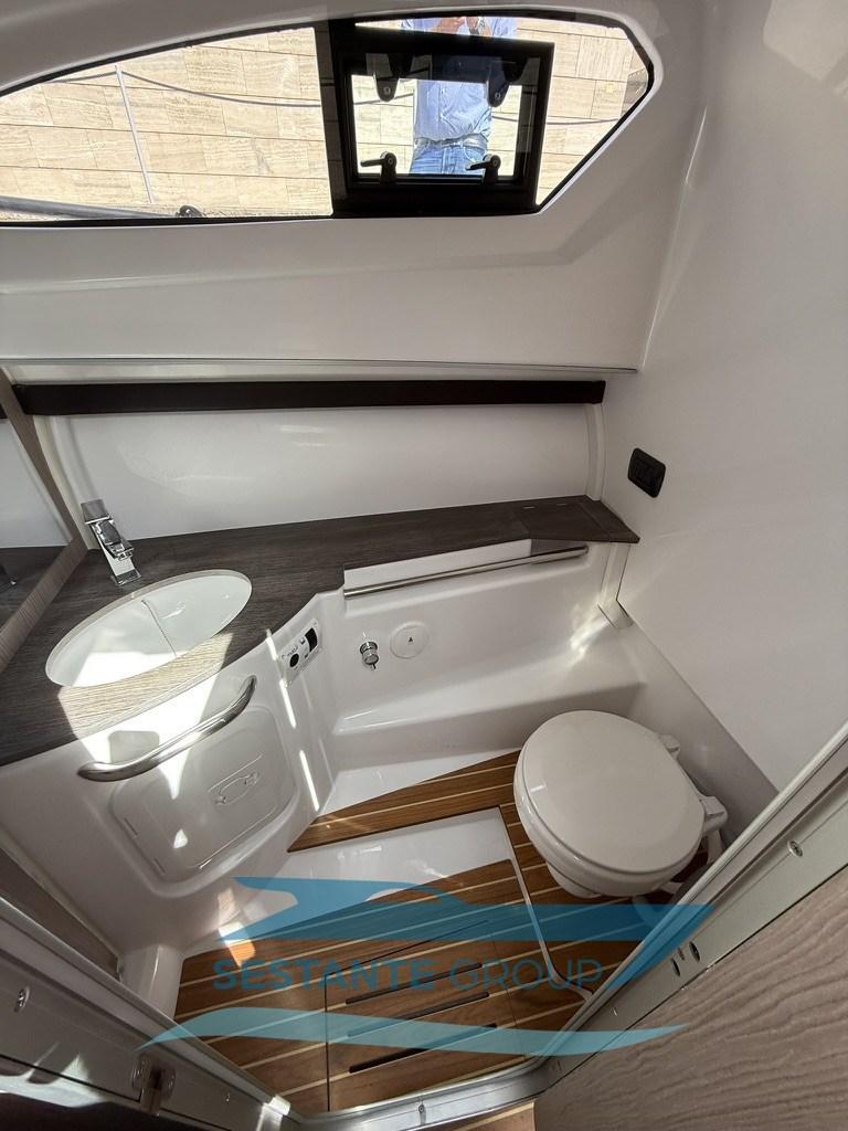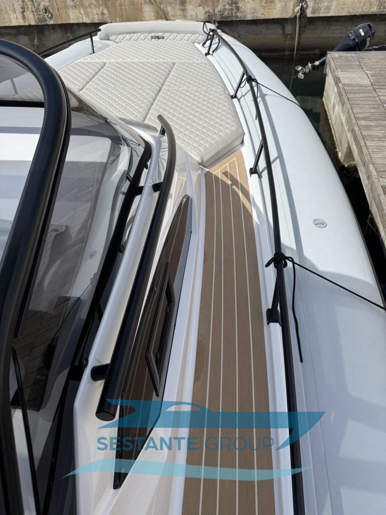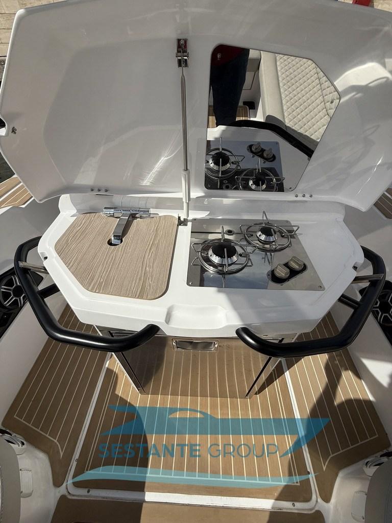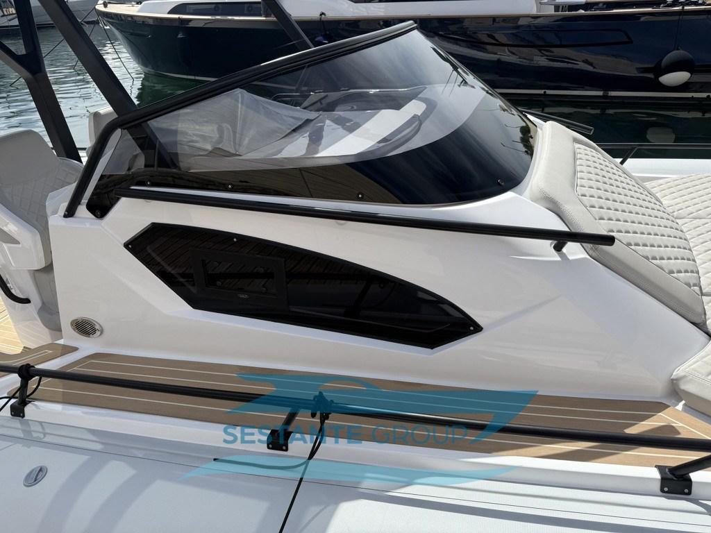 Alarme moteur, Alternateur, Eau sous pression, Taquets pliants, Passavant en teck, Filères, Douche de cockpit, Fixation de l’ancre, Lavabo dans le cockpit, Éclairage de courtoisie, Défenses, 2 Plateforme arrière, Pompe de cale automatique, Pont en teck, Cockpit en teck, Prise de quai, Guindeau électrique, Echelle de bain, Table (elettrico), Corne, T-Top.