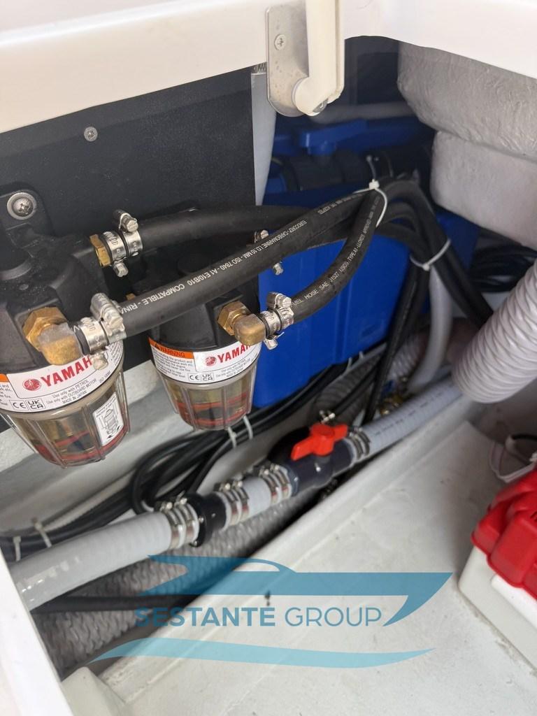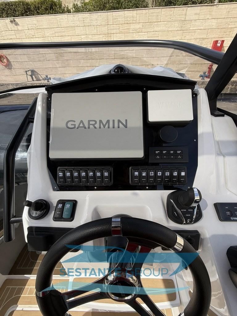 Moniteur (Yamaha 9 pollici), Sondeur pêche (Garmin), GPS (Garmin 1223XSV), Joystick (Yamaha), Cartes et guides, Moniteur de consommation, Panneau de commande, Siège copilote.