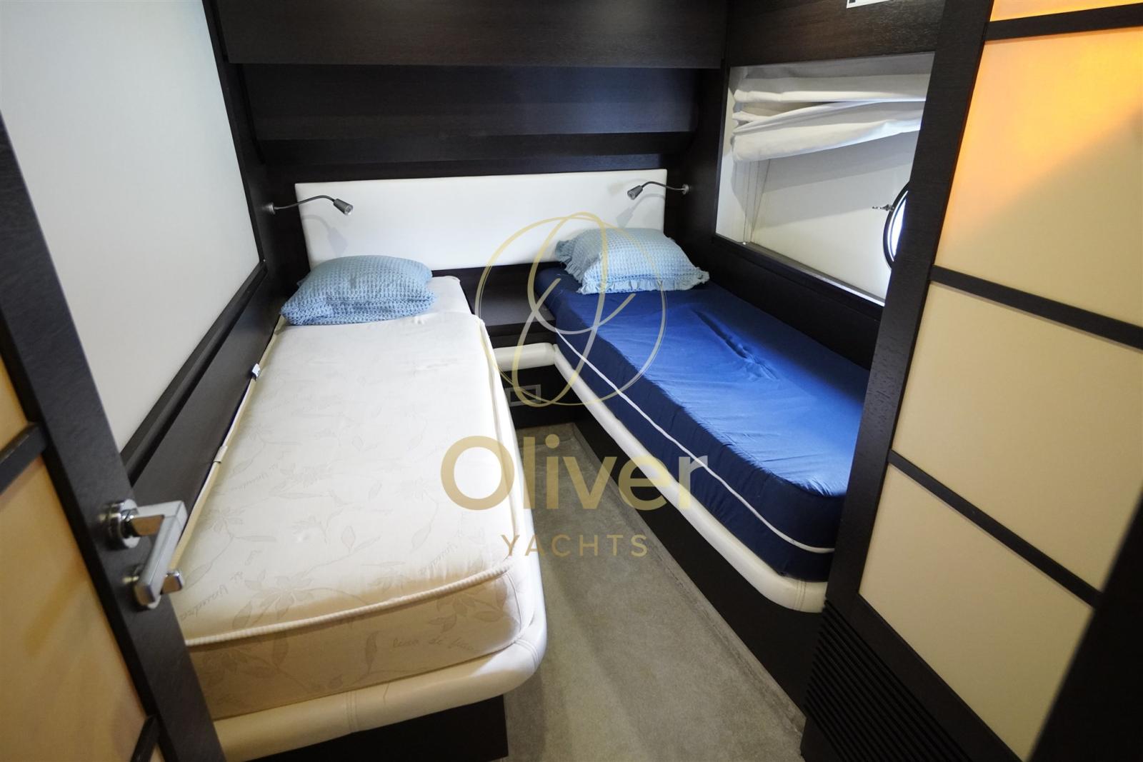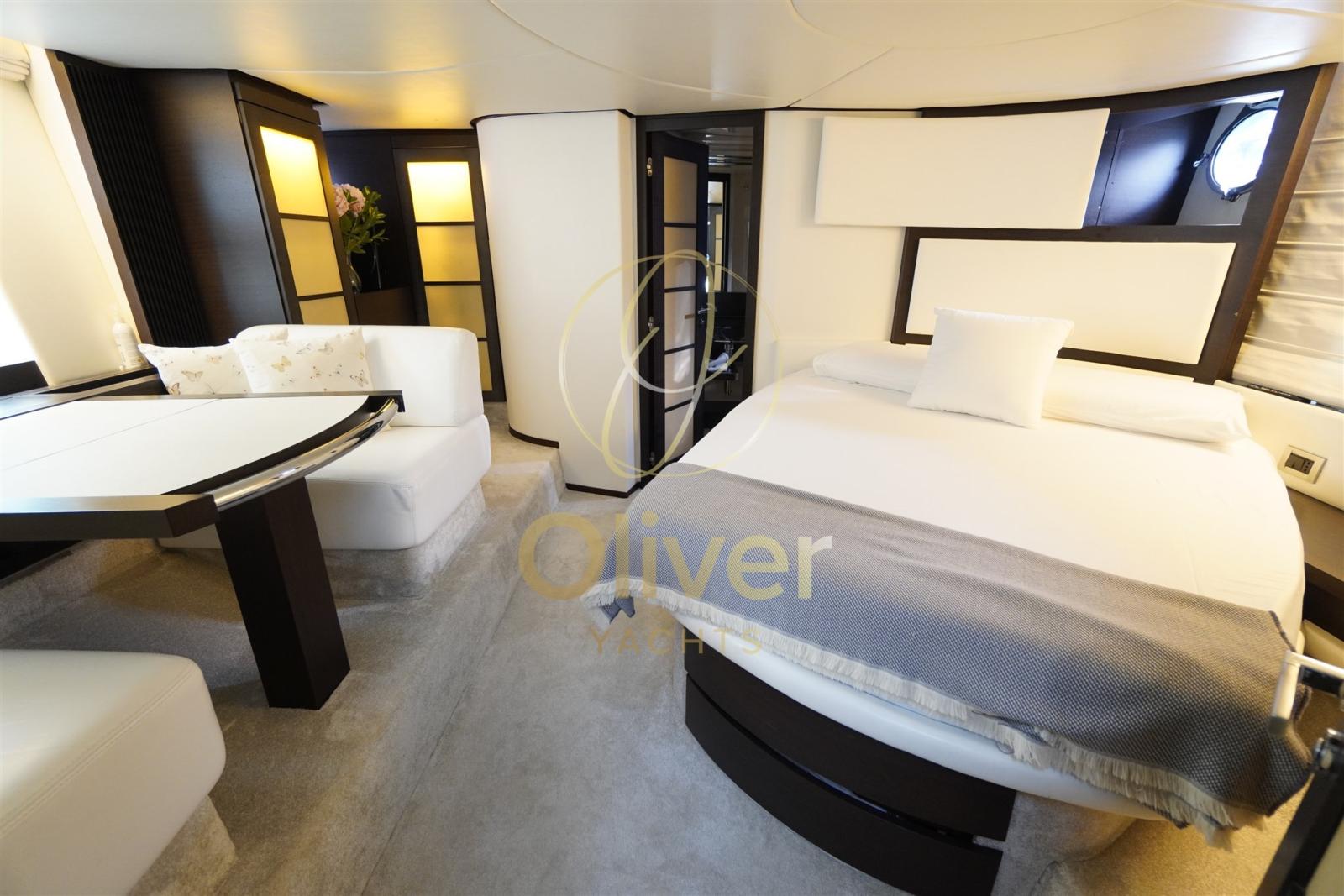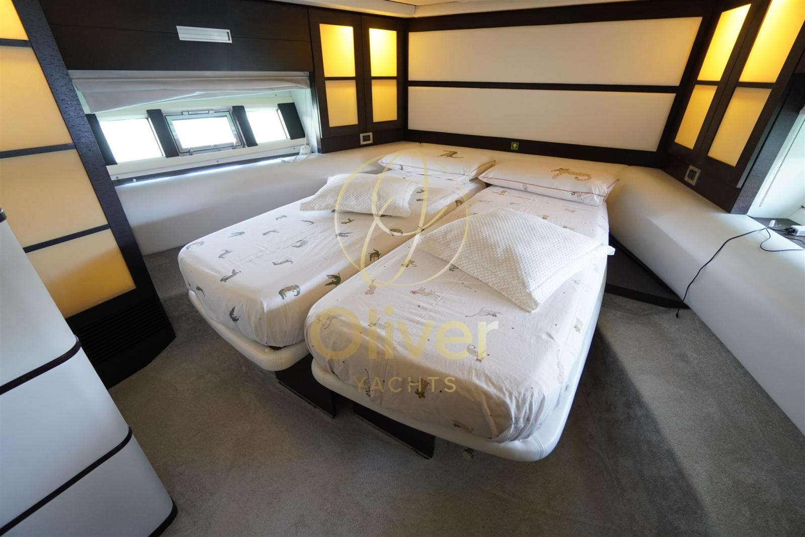 Les intérieurs de ce bateau reflètent un style élégant et contemporain, avec des finitions raffinées et une distribution des espaces conçue pour offrir un maximum de confort à bord. Le salon sur le pont principal est grand et lumineux, meublé de canapés en cuir Etro et d’une table extensible/télescopique flanquée d’un bar complet, où une télévision intelligente Hisense rétractable et un système hi-fi créent un environnement idéal pour la détente ou le divertissement. La cuisine, située sous le pont sur le côté tribord, est entièrement équipée avec des appareils de qualité, notamment un four numérique Panasonic, une plaque à induction, un réfrigérateur et un congélateur en colonne, un lave-vaisselle intégré. La cabine principale pleine largeur au milieu du navire est un véritable appartement privé sur la mer, avec un lit double, un espace détente avec deux canapés, un dressing, une télévision Philips et une chaîne stéréo Sony, ainsi qu’une salle de bains attenante avec cabine de douche séparée. La cabine VIP à l’avant, avec des lits jumeaux qui peuvent être convertis en lit double, dispose également d’une salle de bain privée et d’un système de son. L’espace nuit est complété par une cabine double invités avec lits plats et salle de bain avec douche, ainsi que la cabine marin à l’arrière, avec accès indépendant et services réservés. L’attention portée aux détails, la qualité des matériaux et la division rationnelle des pièces rendent ces intérieurs idéaux pour de longs séjours à bord. Chaque cabine est équipée d’un système stéréo Sony, offrant un confort personnalisé à chaque client. Un bateau conçu pour vivre la mer avec classe, intimité et fonctionnalité.