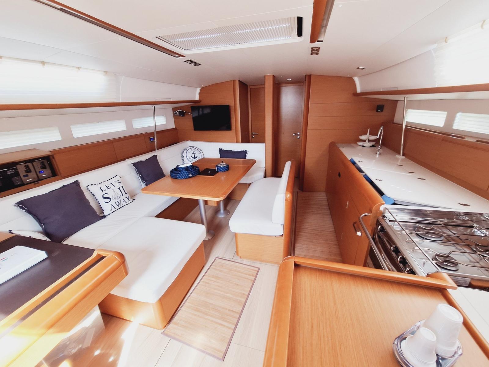 Intérieurs lumineux et bien entretenus, avec 3 cabines modulaires réparties dans 4 et 4 salles de bains, une grande salle à manger et une cuisine complète. Bateau payé à la TVA, constamment entretenu et immédiatement disponible.
