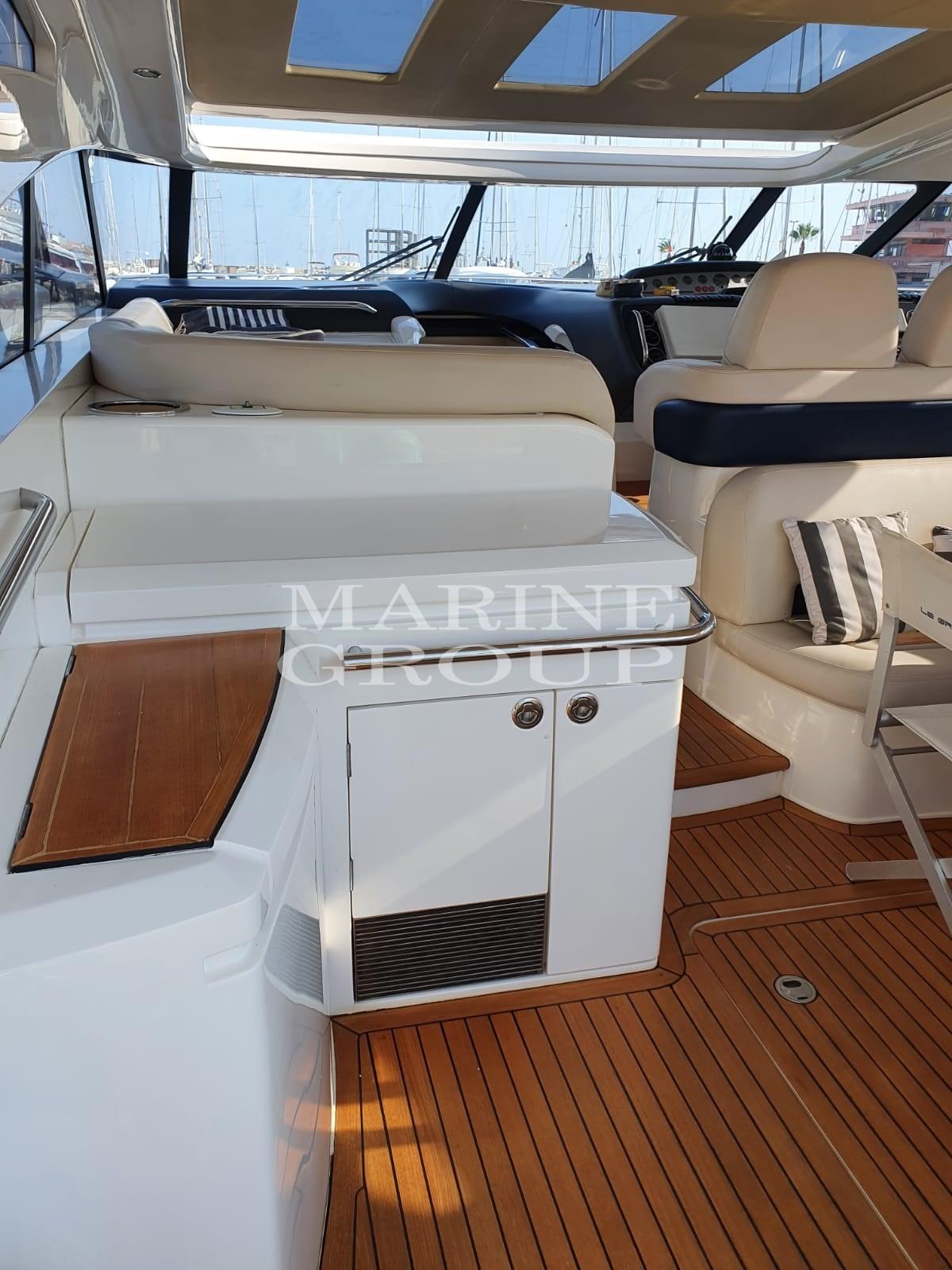 Câble d’alimentation à quai, Couleur spéciale (scafo blu), Douche de cockpit, Phare de poursuite, Flaps hydrauliques, Garage à annexe, Hard top, Lavabo dans le cockpit, Éclairage de courtoisie (led), Passerelle, Plateforme arrière, Cockpit en teck, Prise de quai, Connexion eau sous pression à quai, Guindeau électrique, Echelle de bain, table de cockpit, Corne.