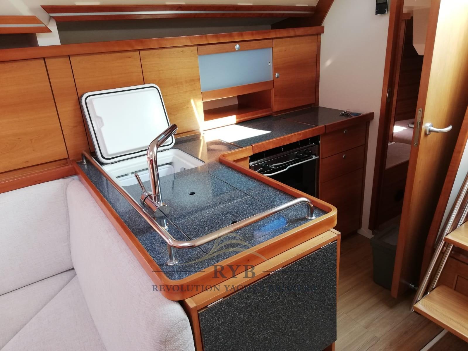 Eau sous pression, Double barre à roue, Propulseur d'étrave (a scomparsa), Éclairage de courtoisie, Plateforme arrière (apribile), Cockpit en teck, Prise de quai, Guindeau électrique, Gréement monotoron (nuovo 2019), table de cockpit (Custom tipo solaris), 6 Winch.