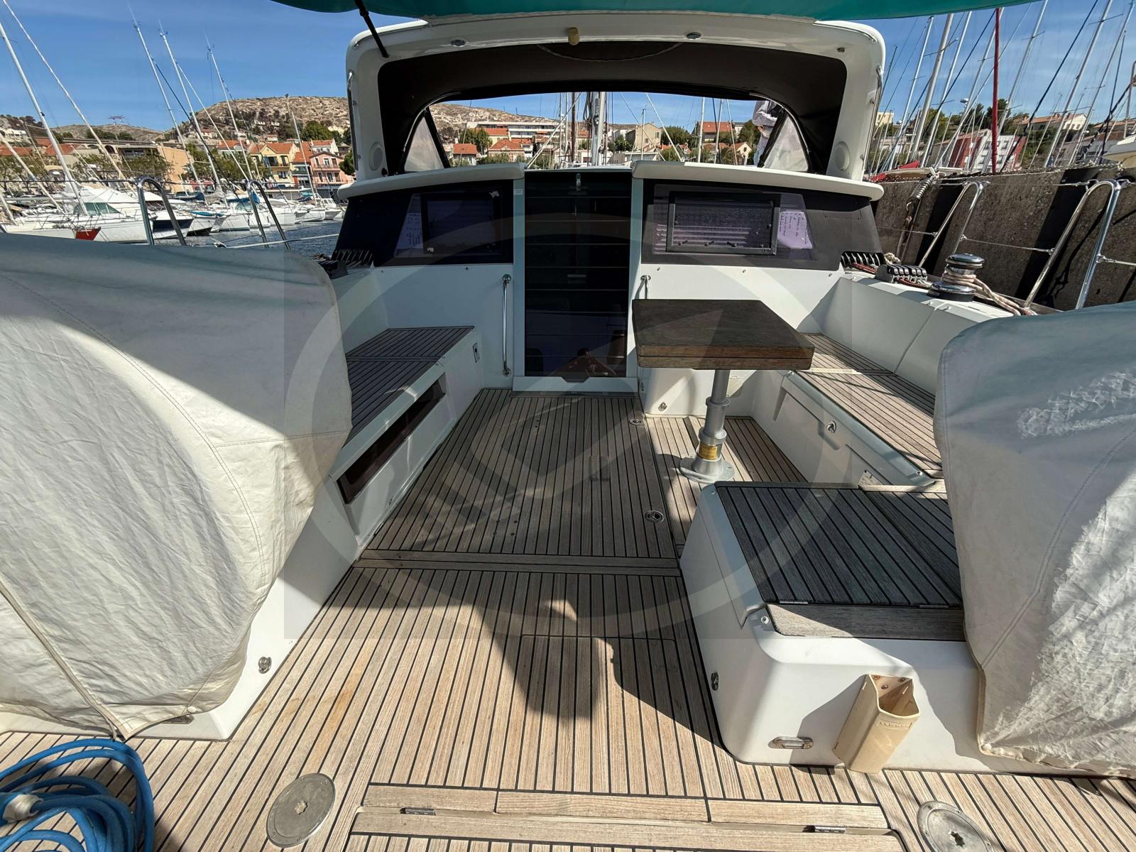 Cockpit teck (bon état) spacieux avec table teck (à revernir) et porte de descente électrique