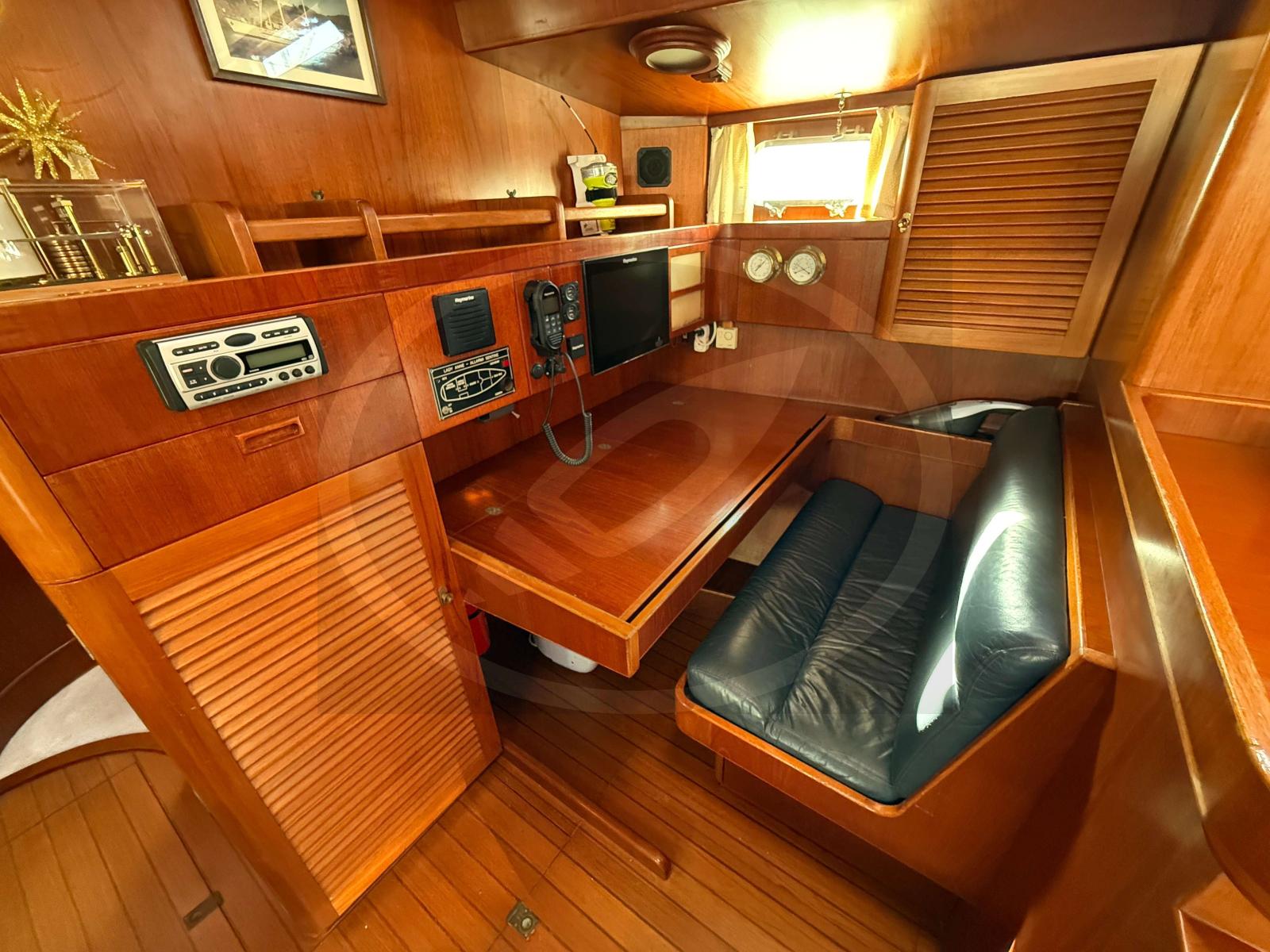À l’intérieur, l’atmosphère raffinée se déploie autour de boiseries nobles et d’espaces baignés de lumière. L'aménagement, vaste et chaleureux, propose une suite propriétaire, deux cabines avant twin transformables et trois salles d’eau.