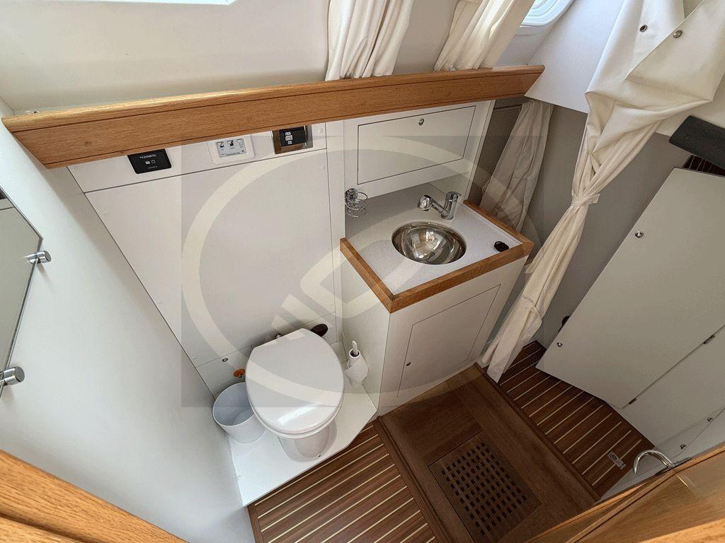 Grande Salle d'eau arrière tribord avec WC électrique Sanimarin, penderie à cirés, douche et lavabo