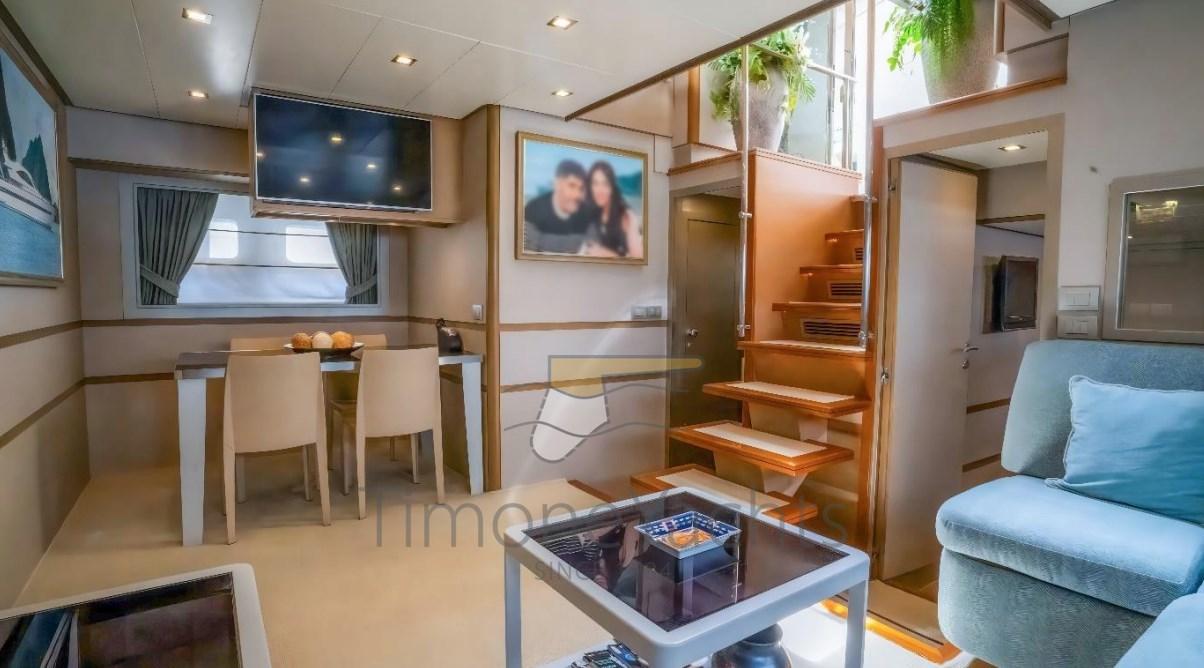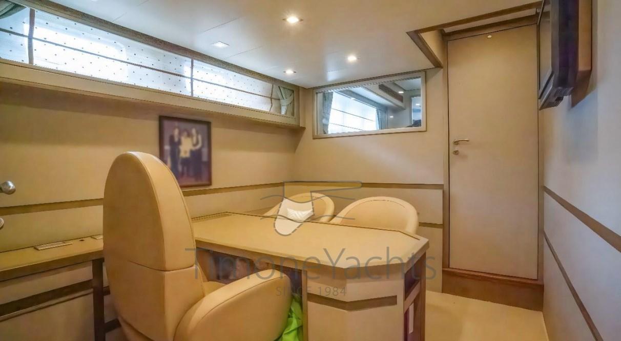 Version avec la cuisine sur le pont inférieur, et un aménagement convivial pour les affaires avec un bureau confortable au milieu du navire à bâbord.