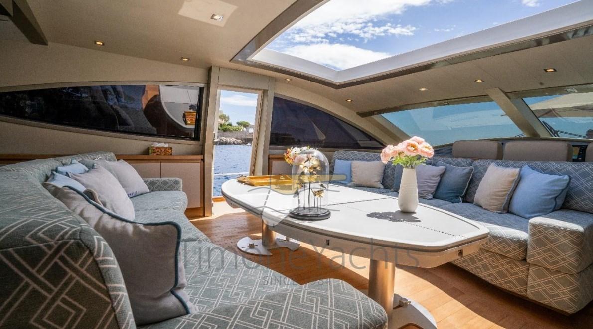 Alarme gaz, Alarme moteur, Alarme de pompe de cale, Alternateur, Eau sous pression, Passavant en teck, Double barre à roue, Flaps hydrauliques, Garage à annexe, Hard top, Éclairage de courtoisie, Passerelle, Pont en teck, Porte latérale, Porte latérale, Cockpit en teck, Prise de quai, Connexion eau sous pression à quai, Annexe (Avion 2 stroke 30 hp), Corne, Winch électrique arrière, Winch électrique avant.